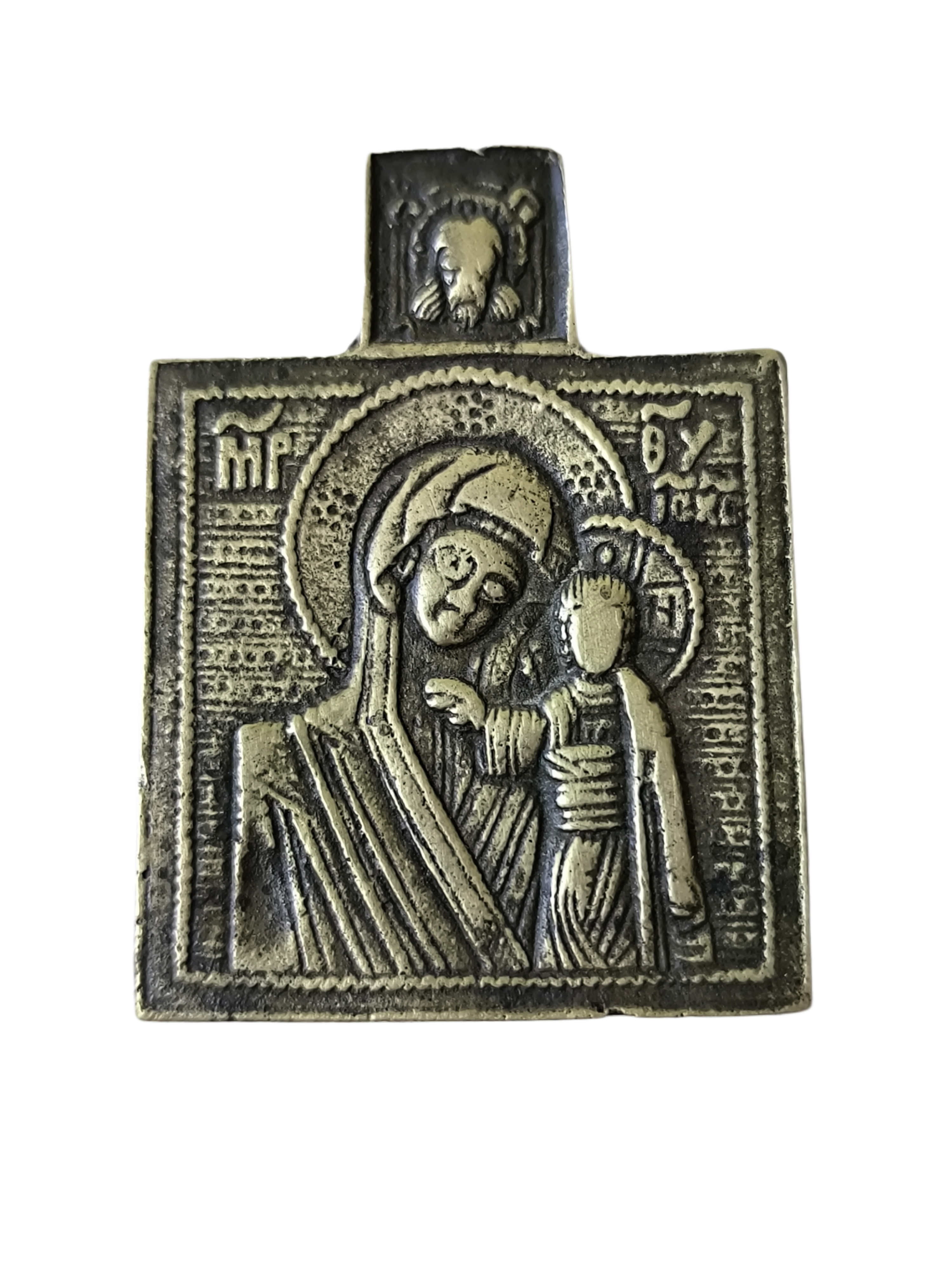 Антикварная икона-плакетка "Богоматерь Казанская". Икона «Богоматерь Казанская» - самый популярный в России образ Богоматери. Изготовлена в 19 веке. Казанская икона Божьей Материа относится к типу Богородицы Путеводительницы. На левой руке младенец-Христос. Правой рукой Христос благословляет христиан. Слева и справа от головы Богородицы греческие символы, обозначающие "Матерь Бога". На иконе есть навершие со Спасом Нерукотворным. Данный вариант является редким экземпляром.