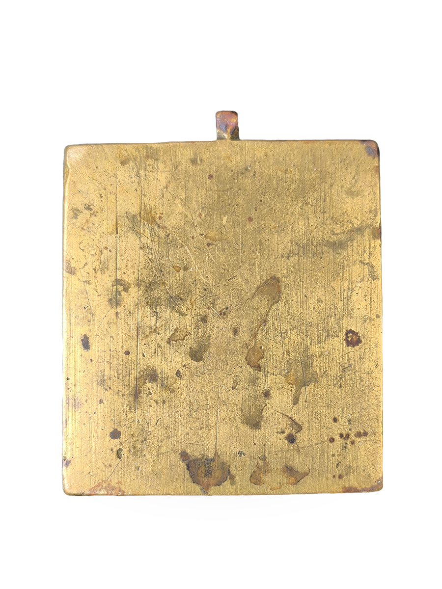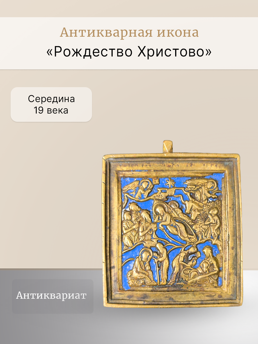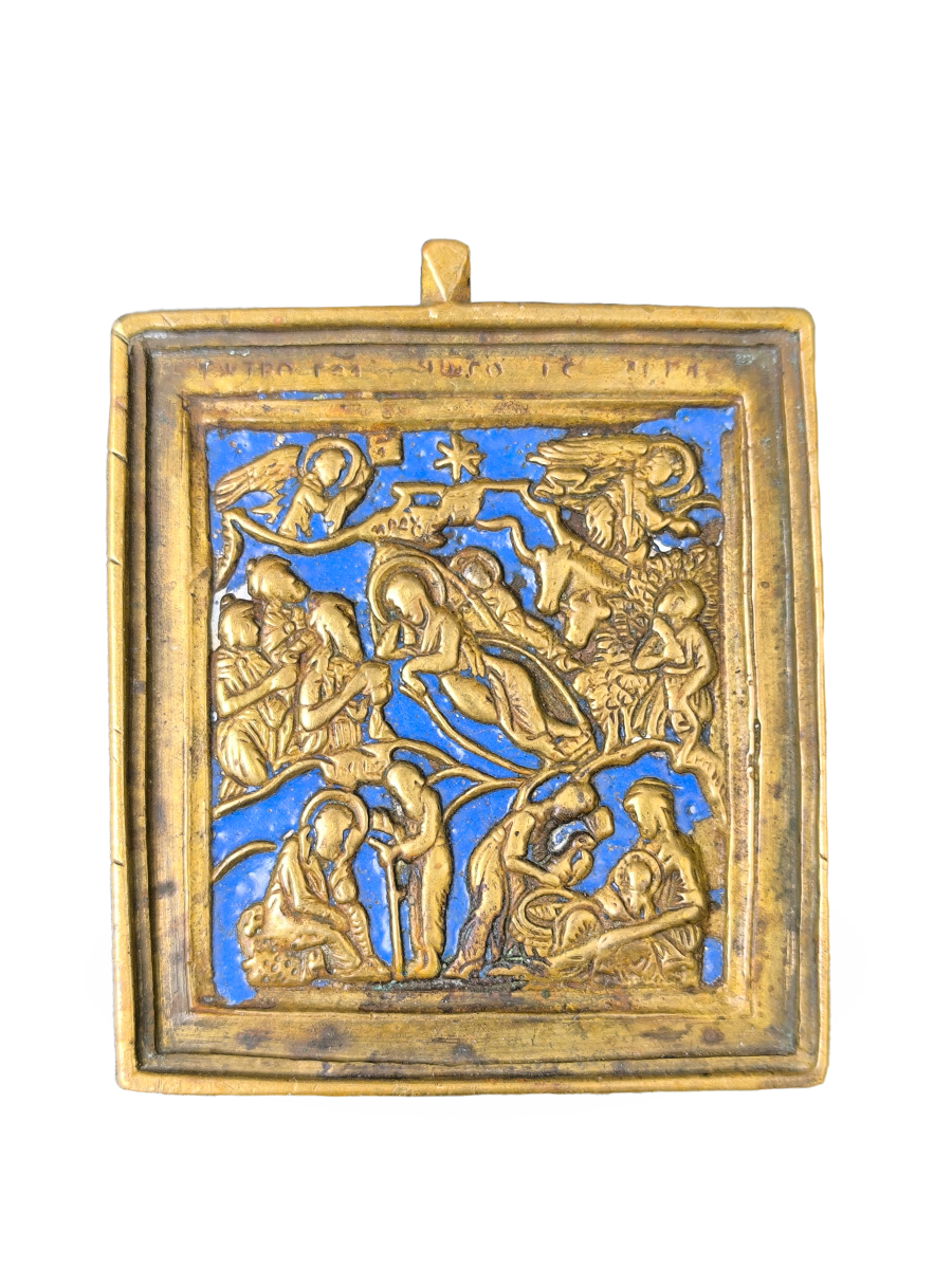 Антикварная каноническая вершковая праздничная икона 19 века «Рождество Христово» с эмалью