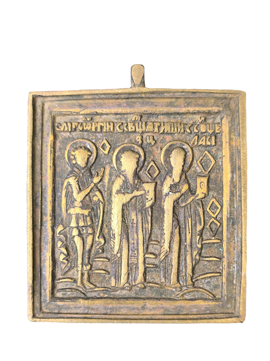 Антикварная литая икона «Великомученик Георгий, священномученики Антипа и Власий»