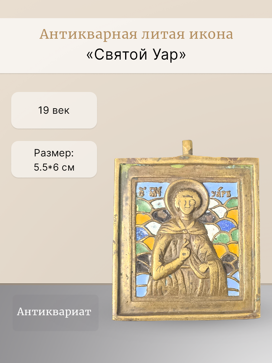Вершковая меднолитная икона содержит поясной образ мученика Уара, жившего в 4 веке в Александрии . Святой был легионером, командующим когортой. Он тщательно скрывал свою христианскую веру, опасаясь преследований.При этом в период массовых гонений христиан Уар тайно посещал тюрьмы и как мог помогал заточённым в них христианам.