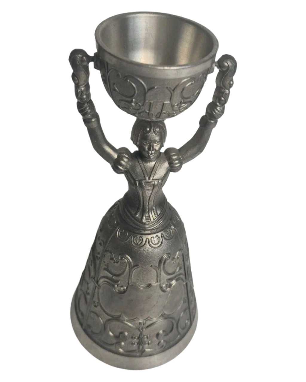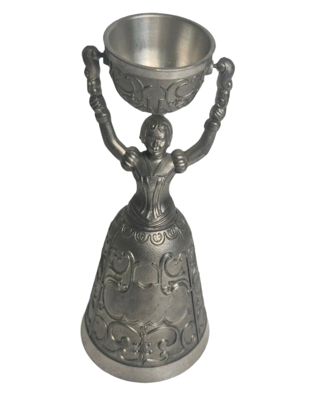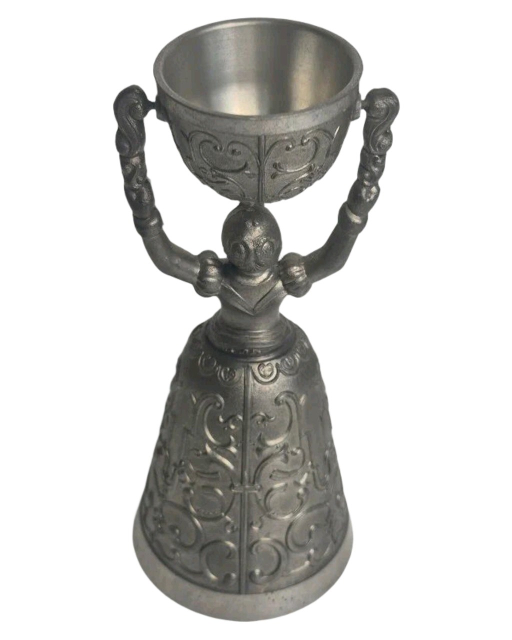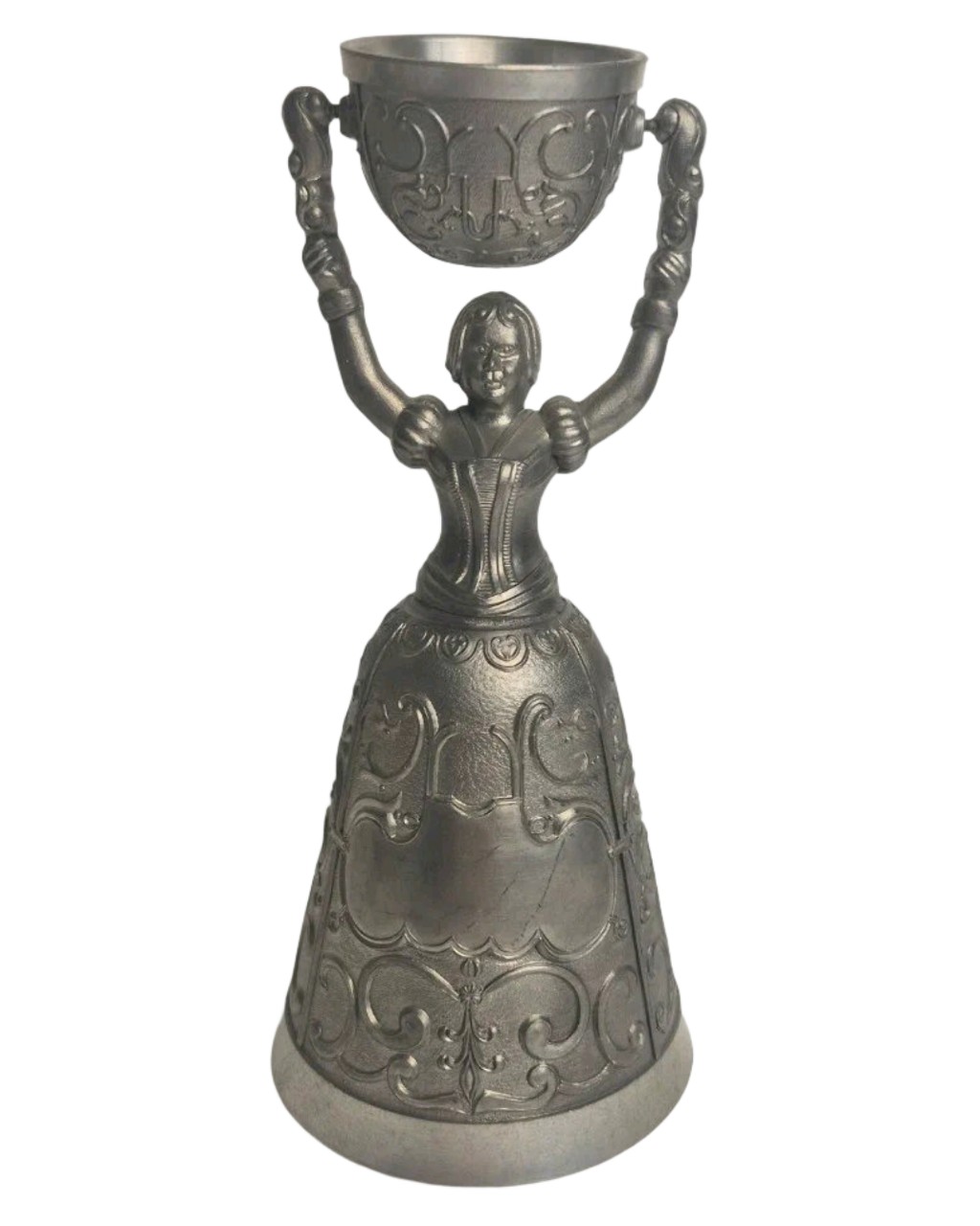 Кубок выполнен в форме девушки в пышном платье, держащей над головой маленький поворотный кубок.