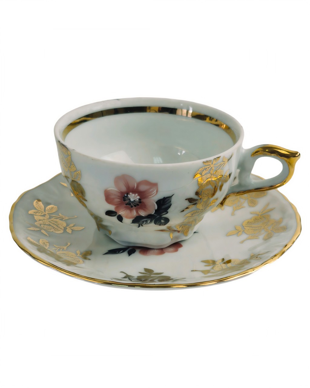 Чашка и блюдце украшены золотистыми растительными узорами. В центре чашки расположен акцентный рисунок розового цветка.