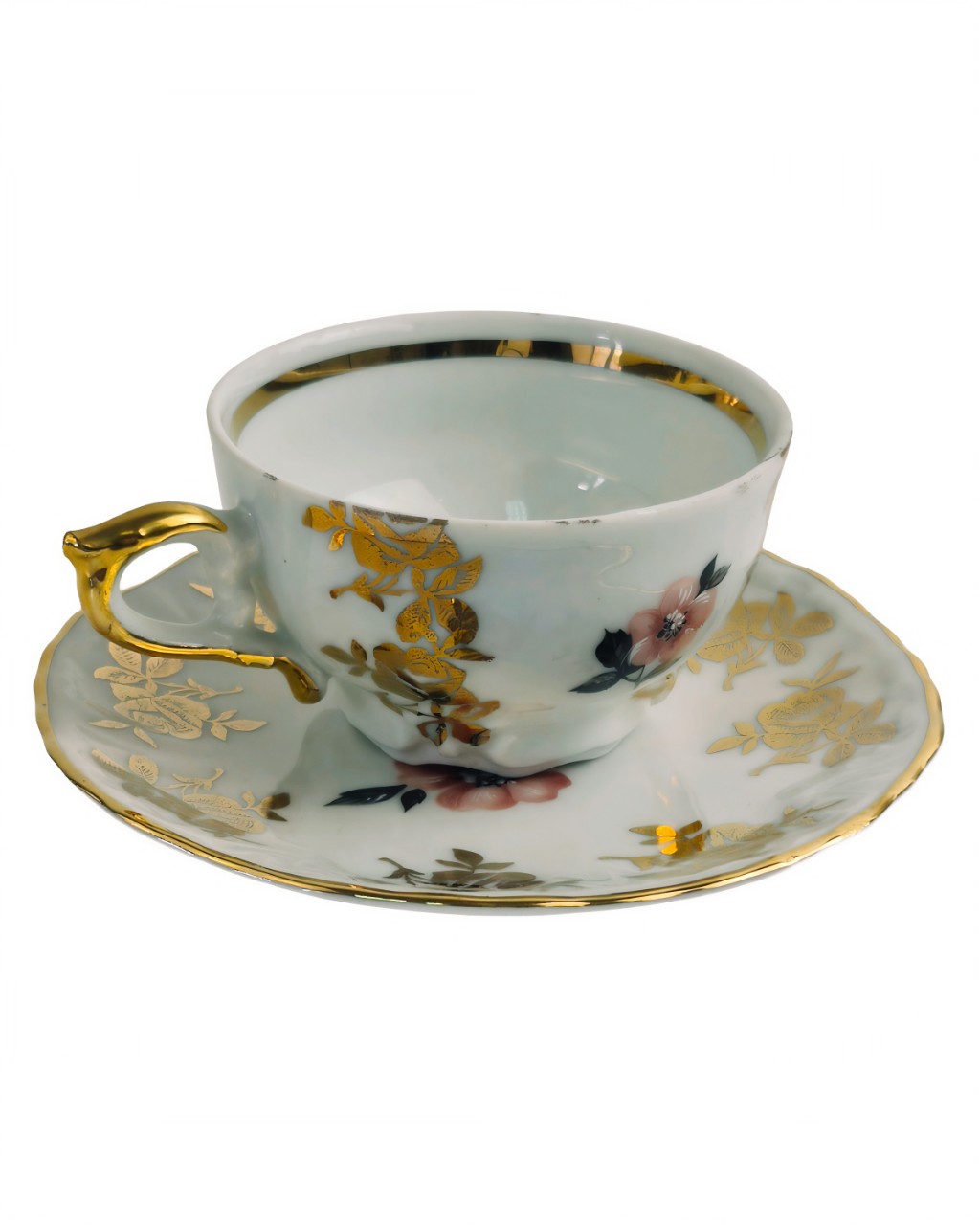 Вашему представлена винтажная чайная пара, выполненная из фарфора с нежным цветочным декором и золочением.