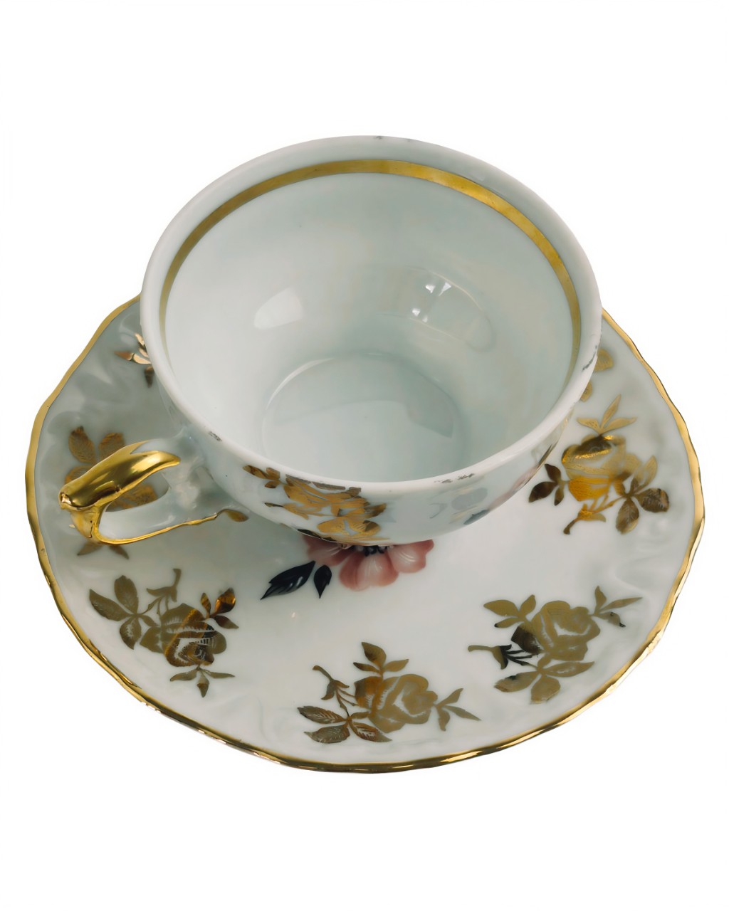 Тонкостенный фарфор, вероятно, с использованием надглазурной росписи и золочения по краю.