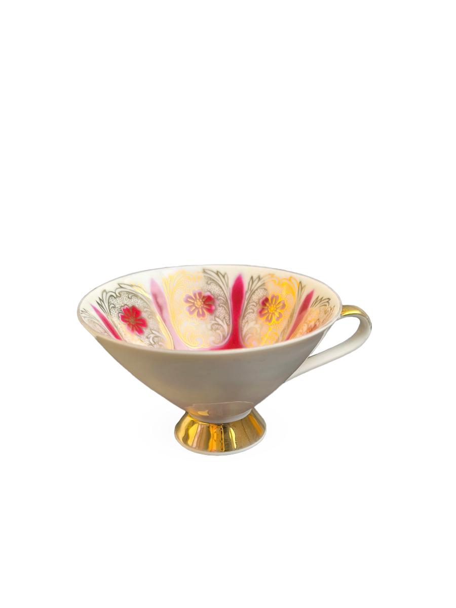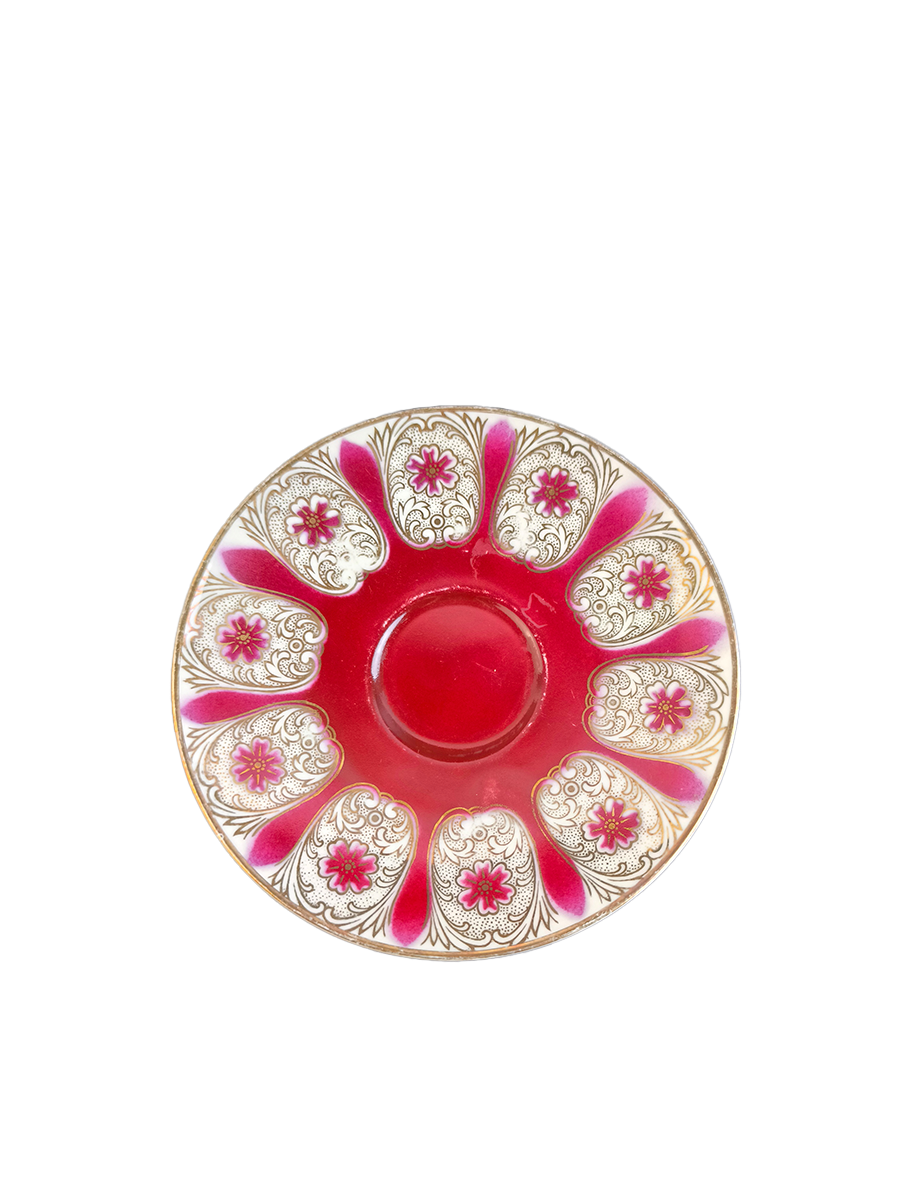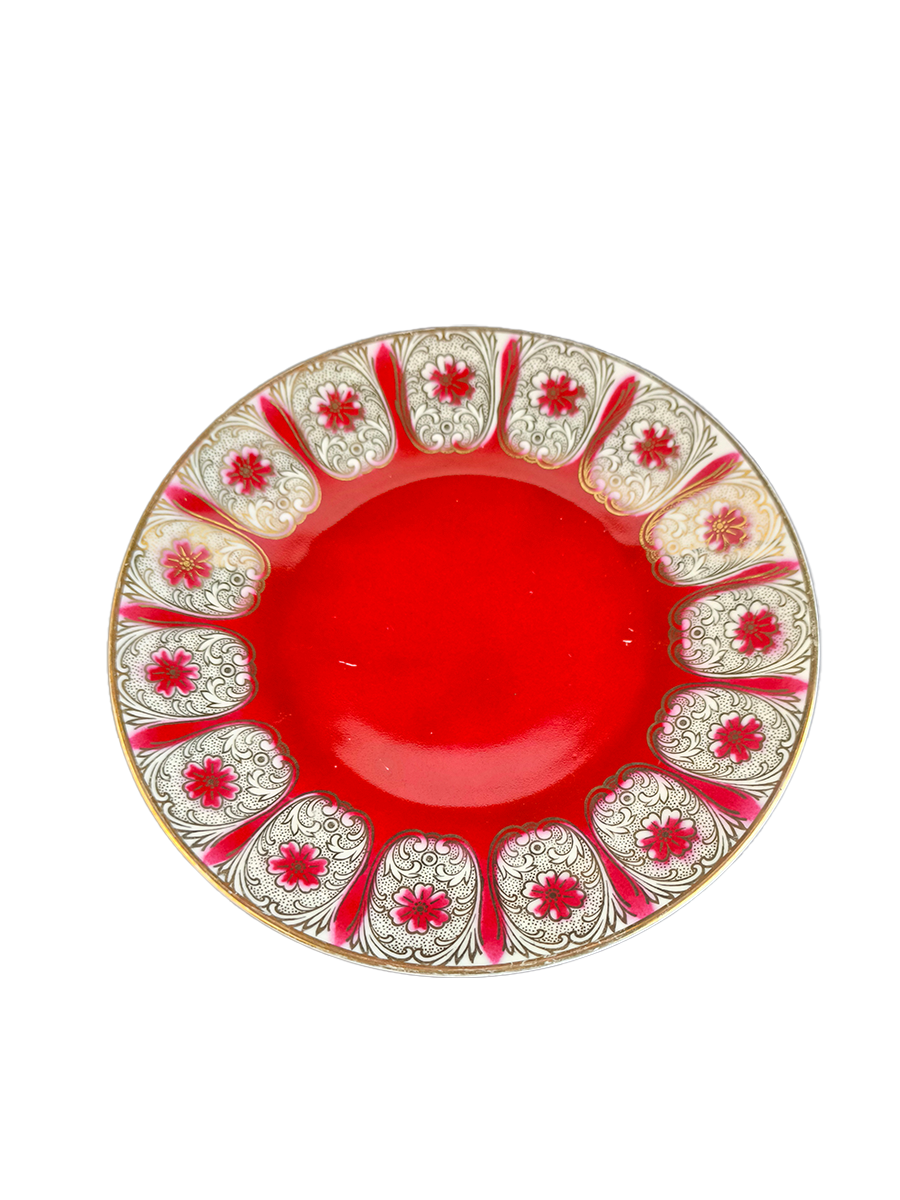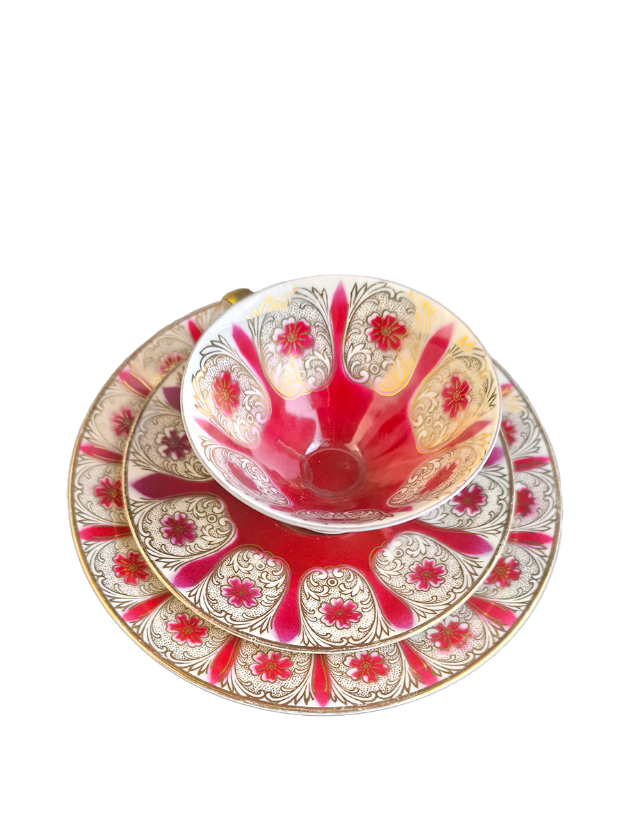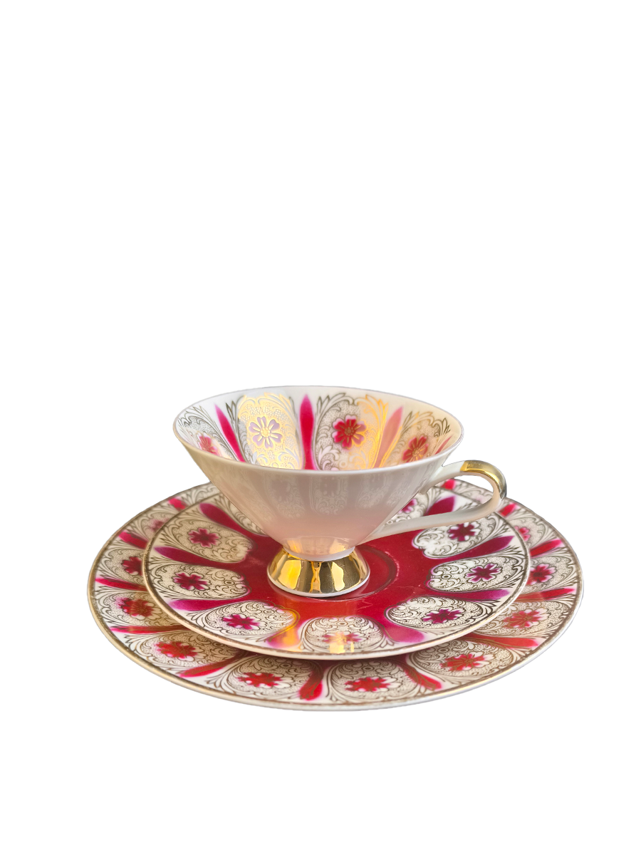 Представленное чайное трио (чашка, блюдце и десертная тарелка) выполнено из фарфора в винтажном стиле с характерным дизайном 1950-1960-х годов. Оно имеет насыщенный красный (бордовый) цвет в сочетании с белым фоном и обильным золотым декором, включая позолоченную ручку и ножку чашки.
