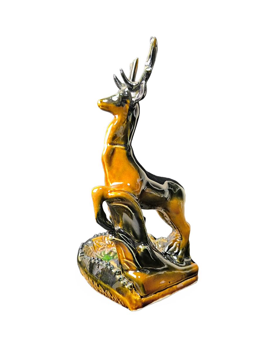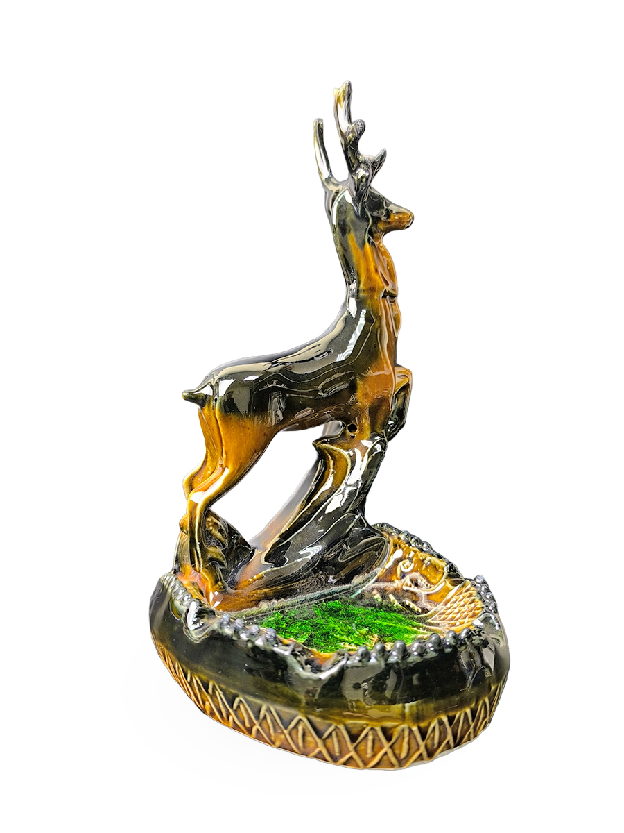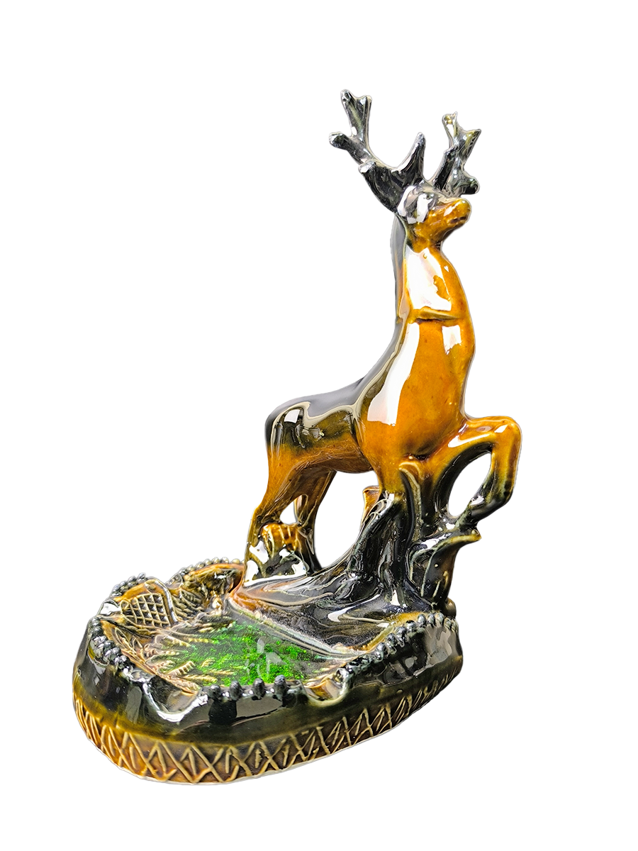 Статуэтка изображает оленя, стоящего на основании в виде водоема или лесной поляны, которое выполняет функцию пепельницы или блюдца.