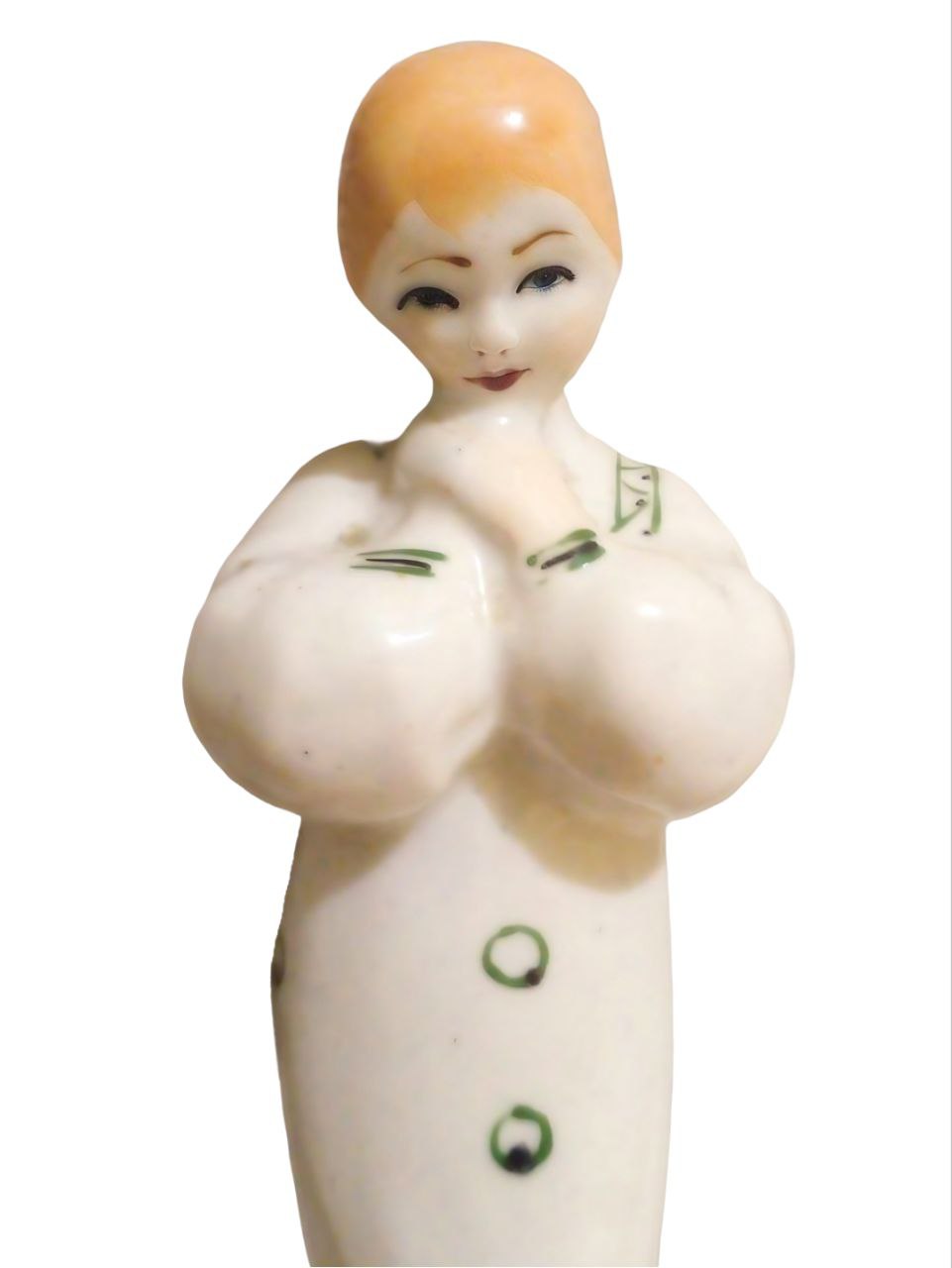 Статуэтка изображает молодую женщину в длинном белом платье с зеленым орнаментом (стилизованными горошинами или листьями) и в лаптях, стоящую на небольшом зеленом основании, имитирующем траву. Руки девушки сложены на груди.