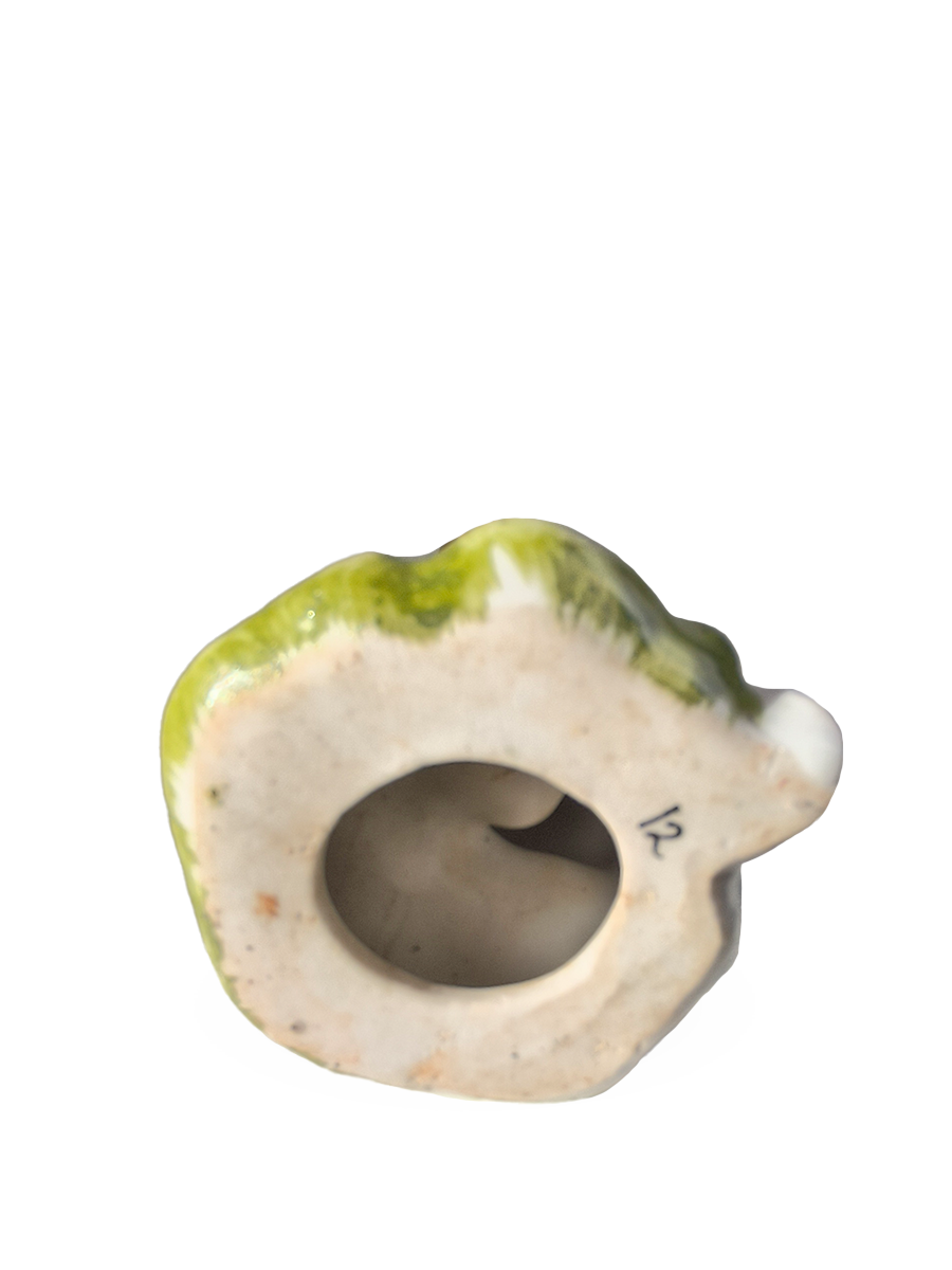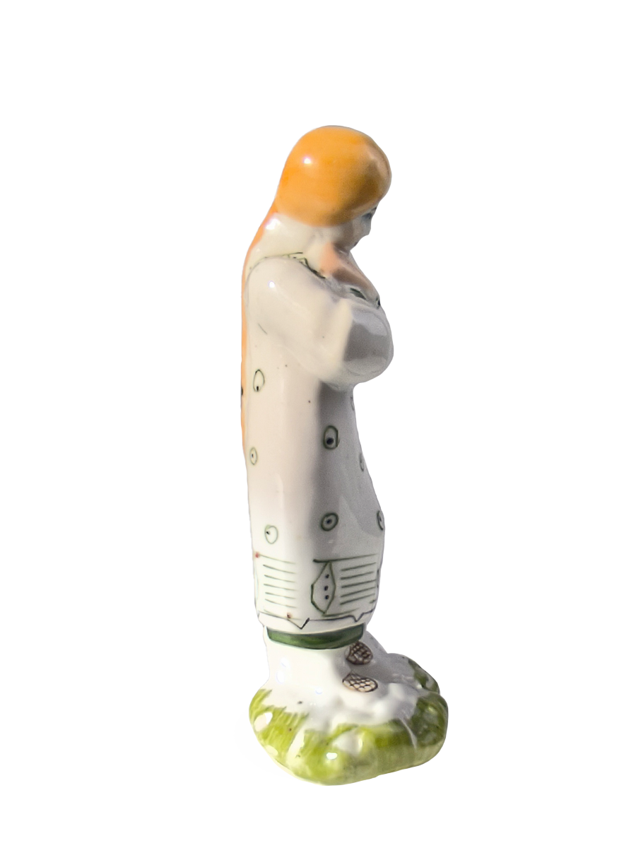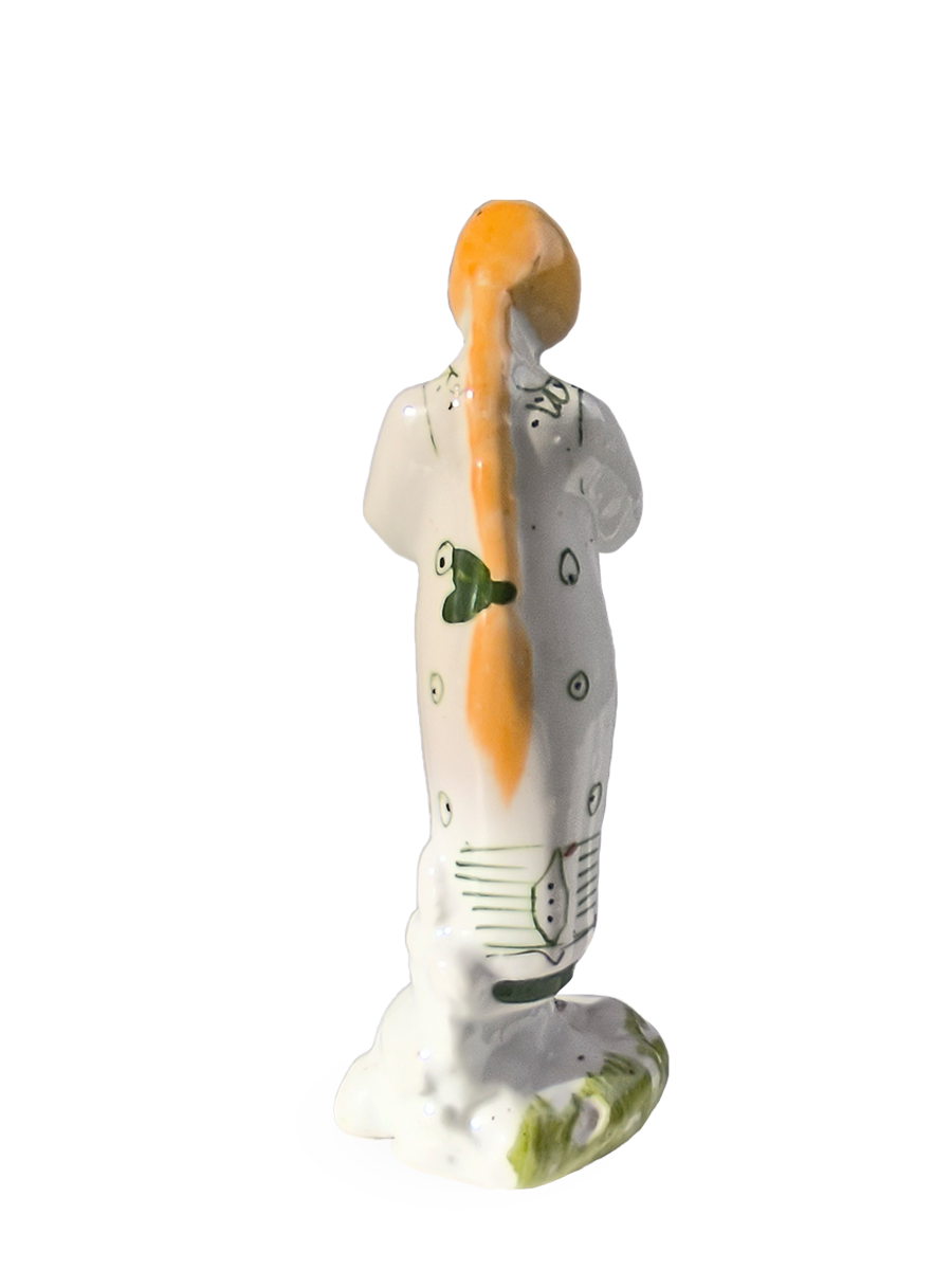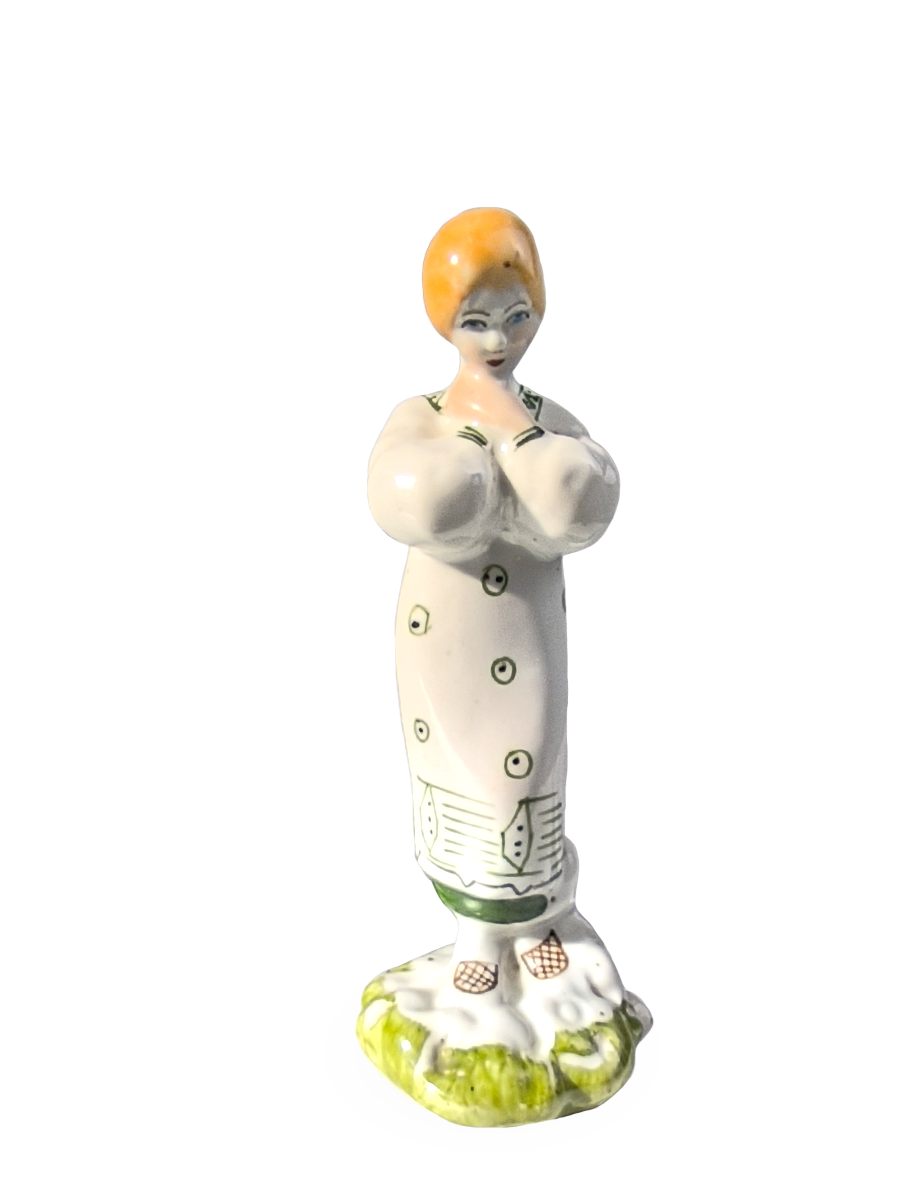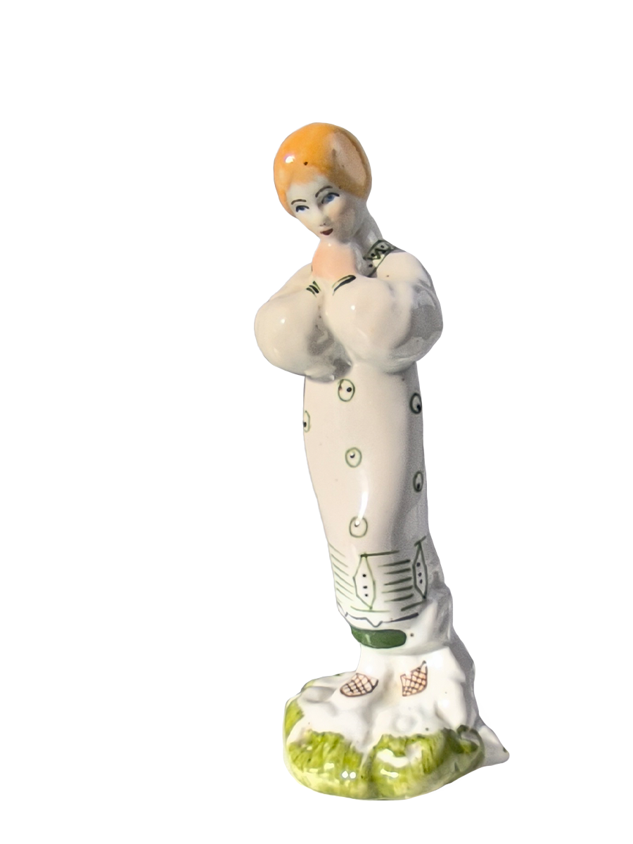Статуэтка изображает молодую женщину в длинном белом платье с зеленым орнаментом (стилизованными горошинами или листьями) и в лаптях, стоящую на небольшом зеленом основании, имитирующем траву. Руки девушки сложены на груди.