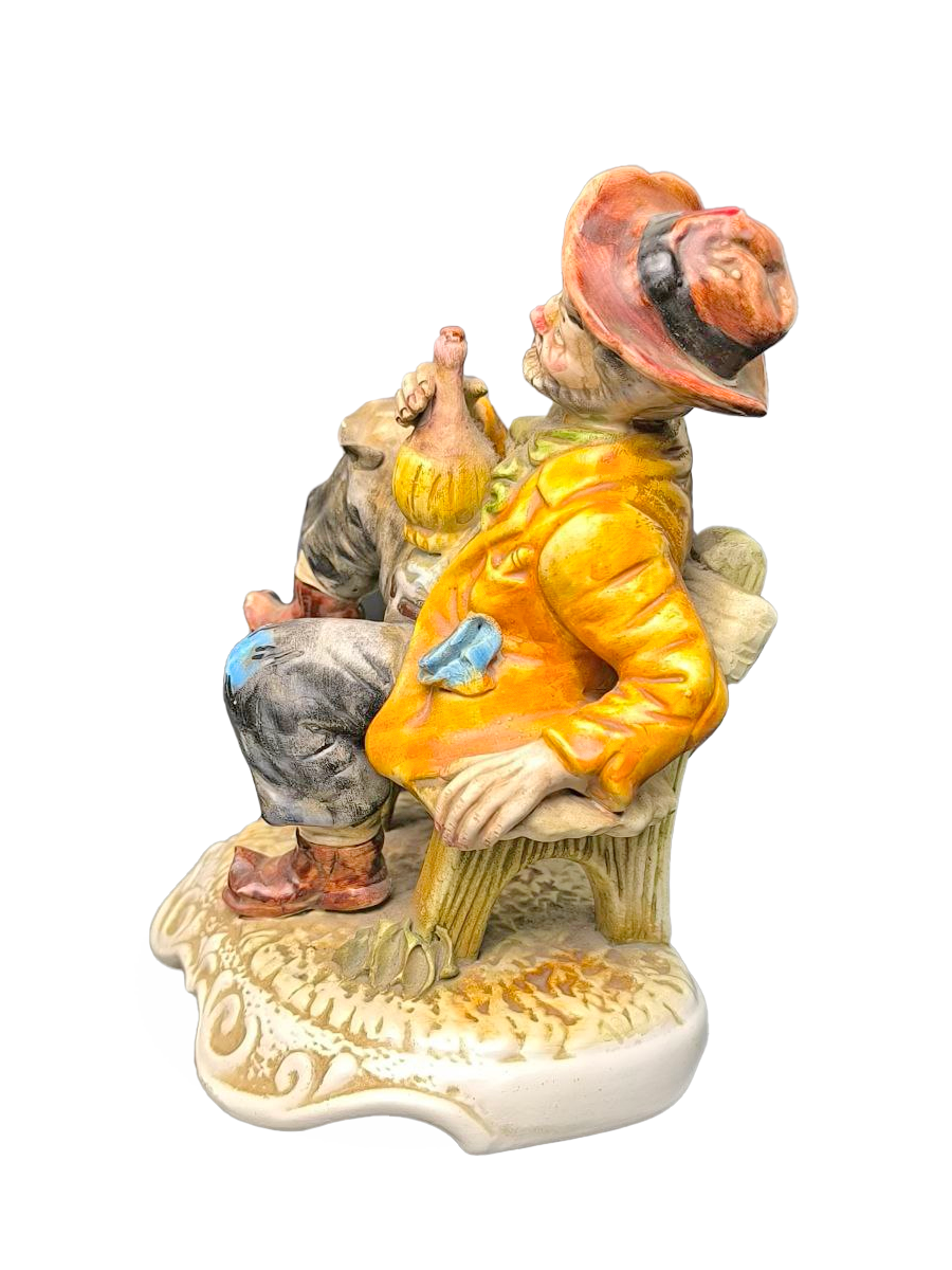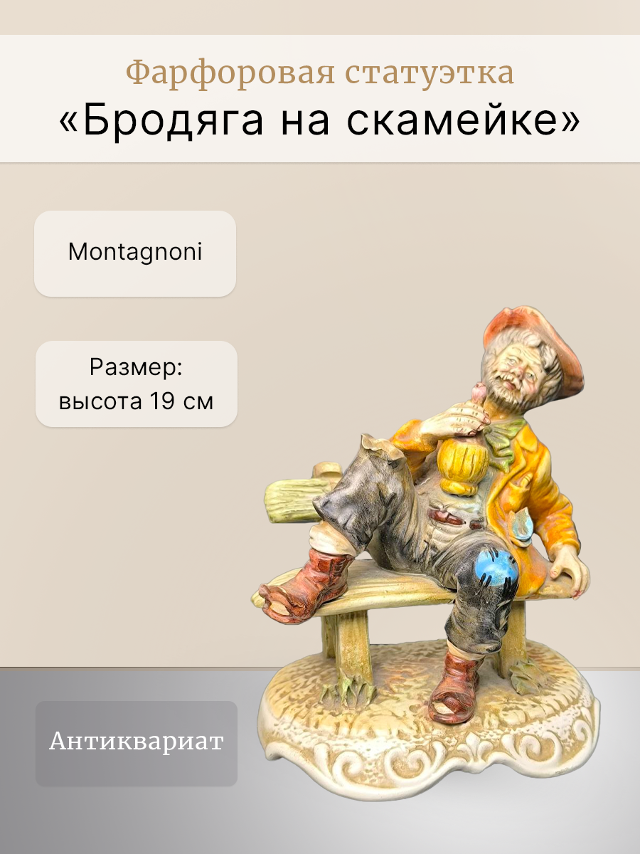 Фарфоровая статуэтка "Бродяга на скамейке", также встречаются названия "Пьяница на скамейке" или "Старик с бутылкой". Montagnoni - эта фабрика, является одним из более поздних производителей, работающих в стиле Каподимонте (Capodimonte).