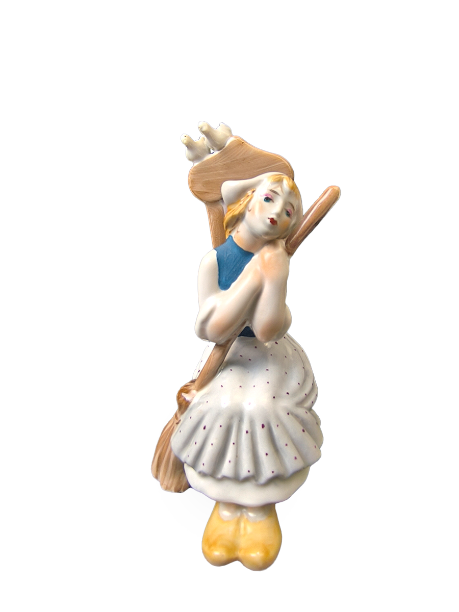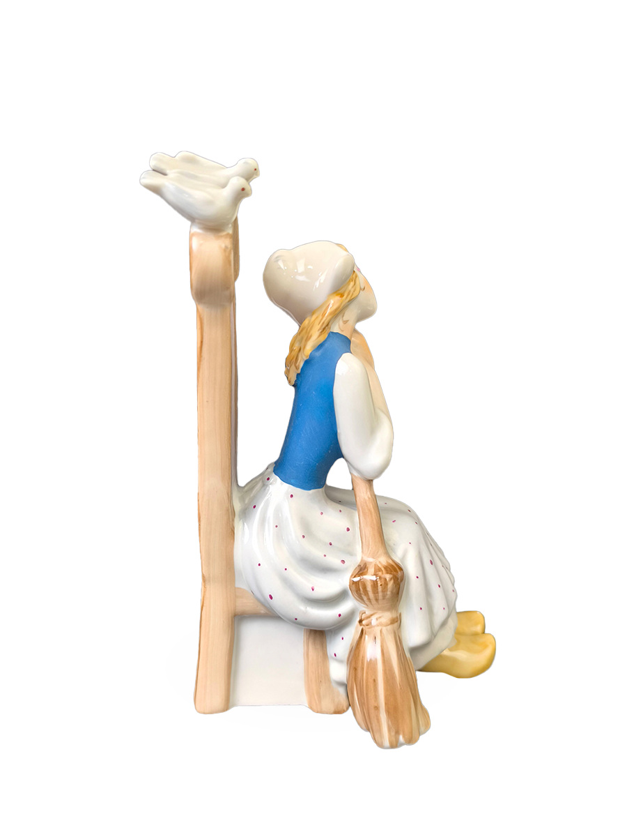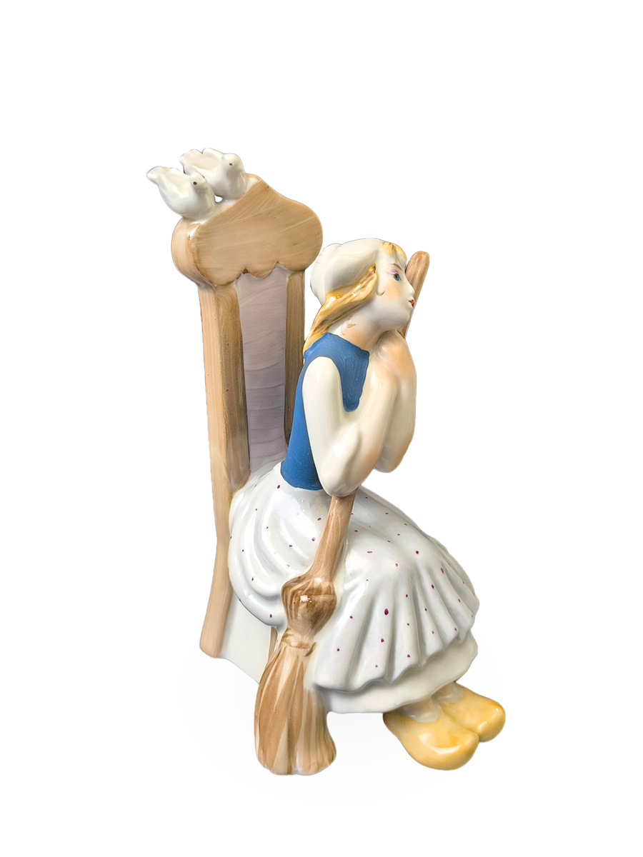 Фигурка изображает уставшую Золушку, присевшую отдохнуть, облокотившись на метлу. На спинке стула, который виден за ней, сидят две белые птички.