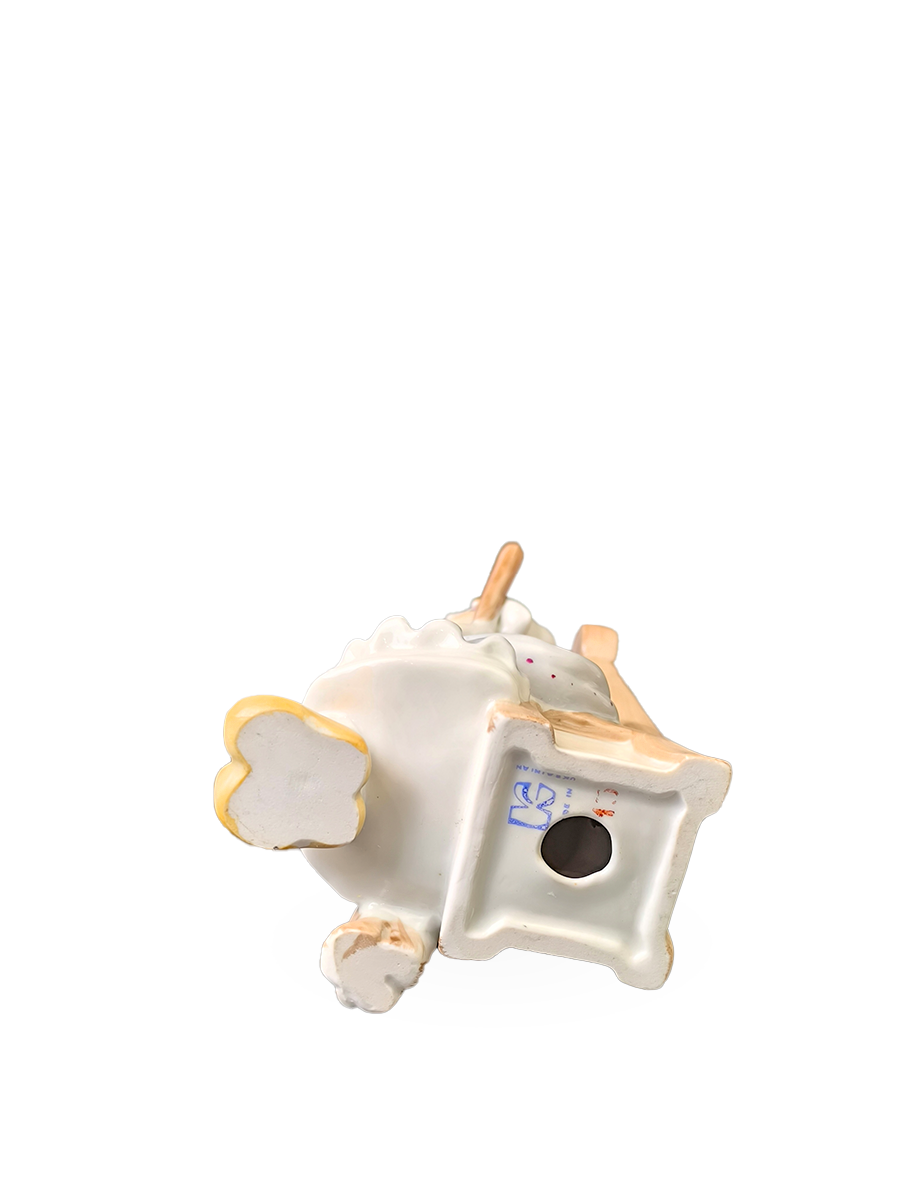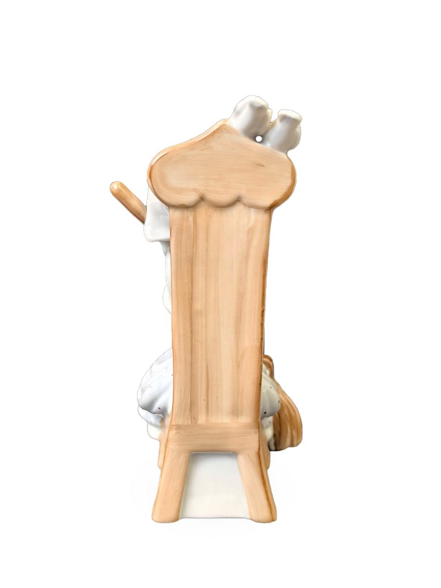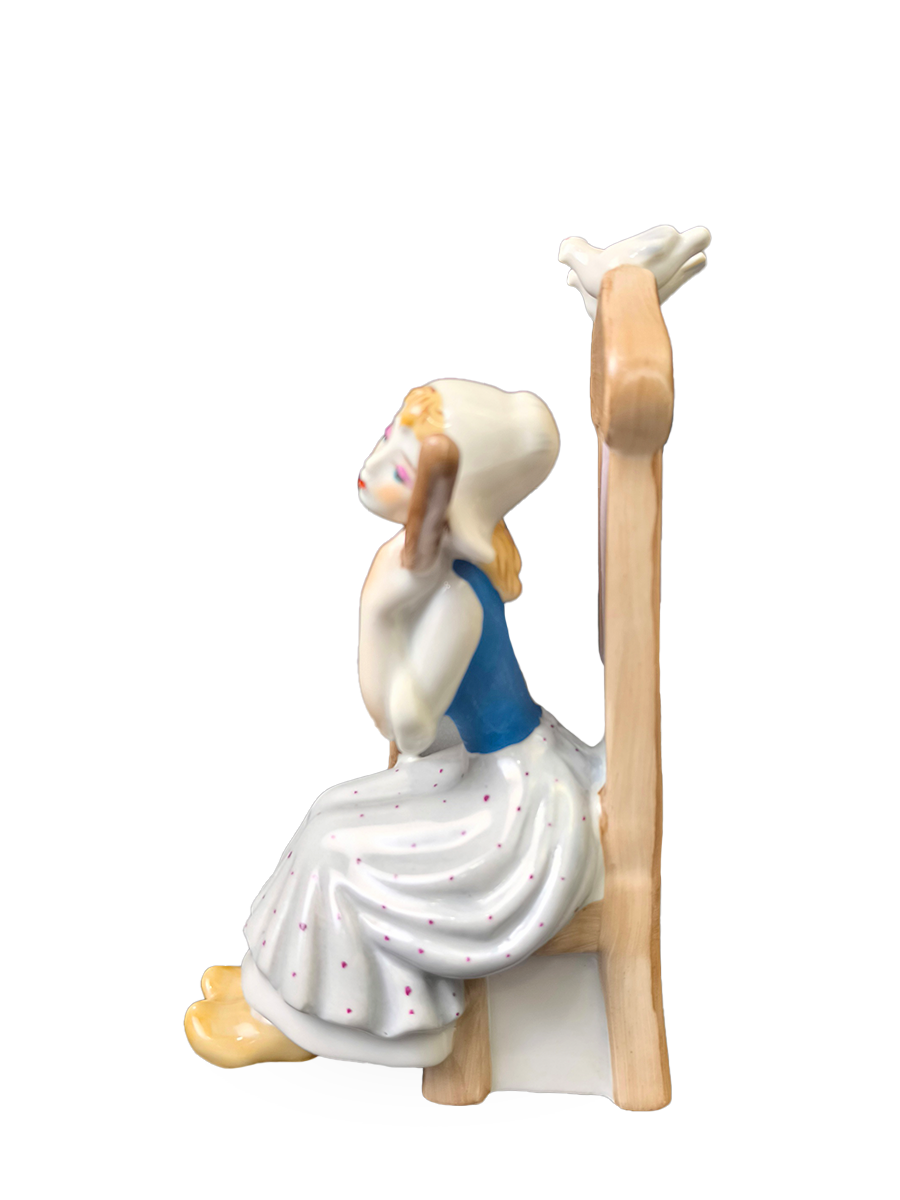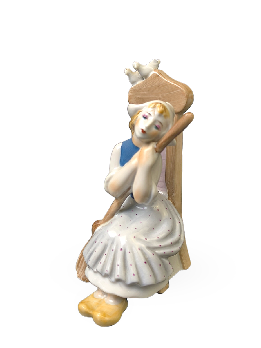 Фигурка изображает уставшую Золушку, присевшую отдохнуть, облокотившись на метлу. На спинке стула, который виден за ней, сидят две белые птички.