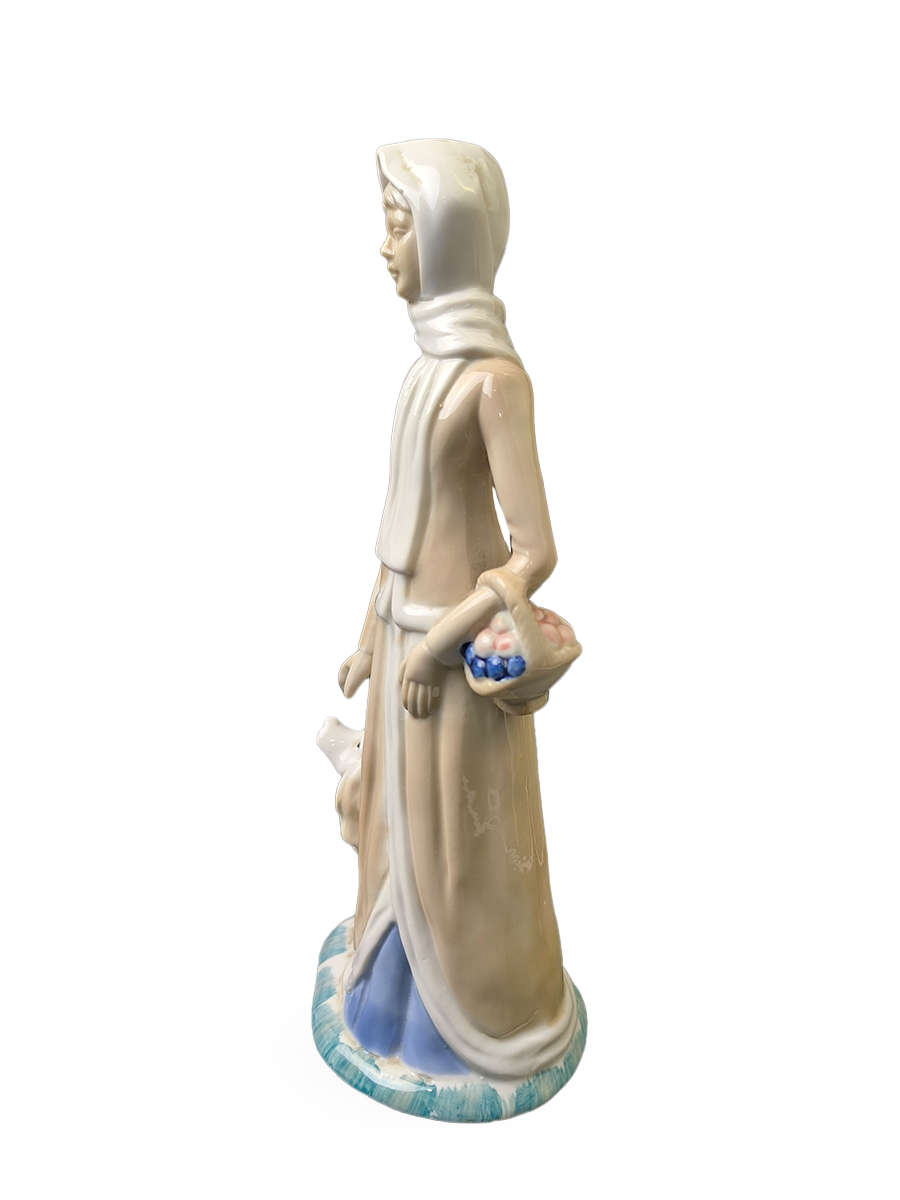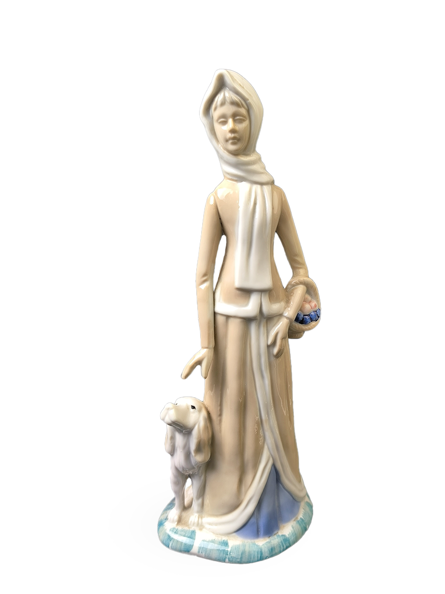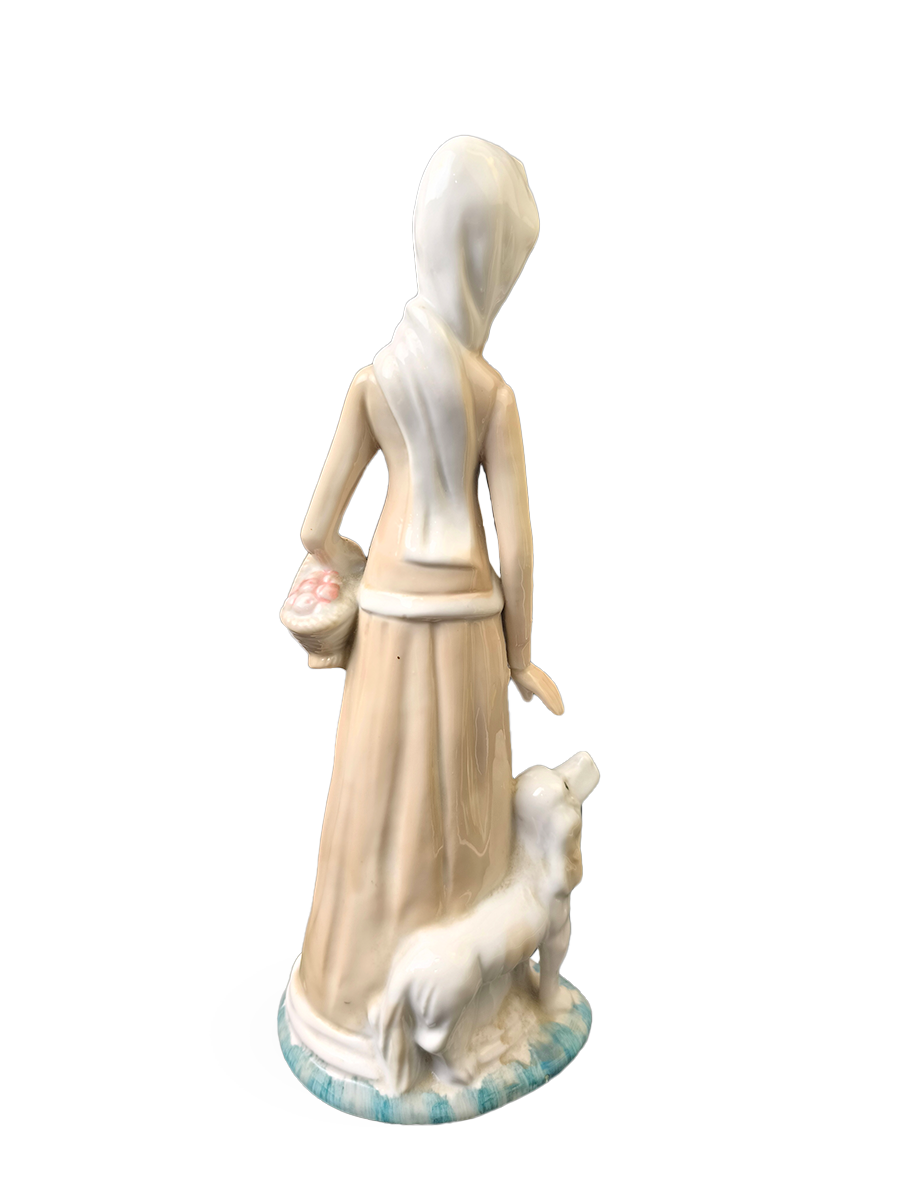 На статуэтке изображена женщина в винтажном длинном платье и платке, держащая в руке корзину с цветами, рядом с ней стоит собака (вероятно, спаниель).