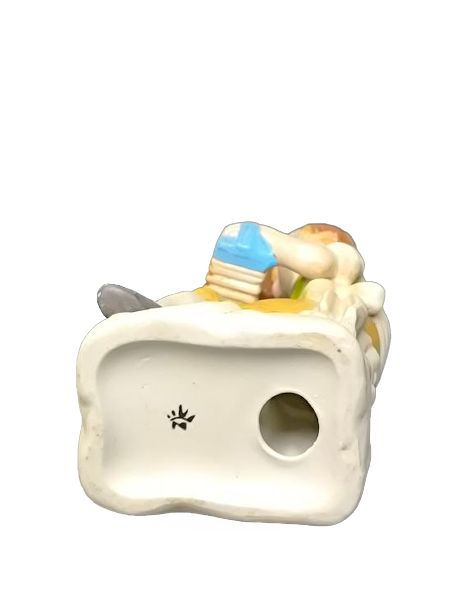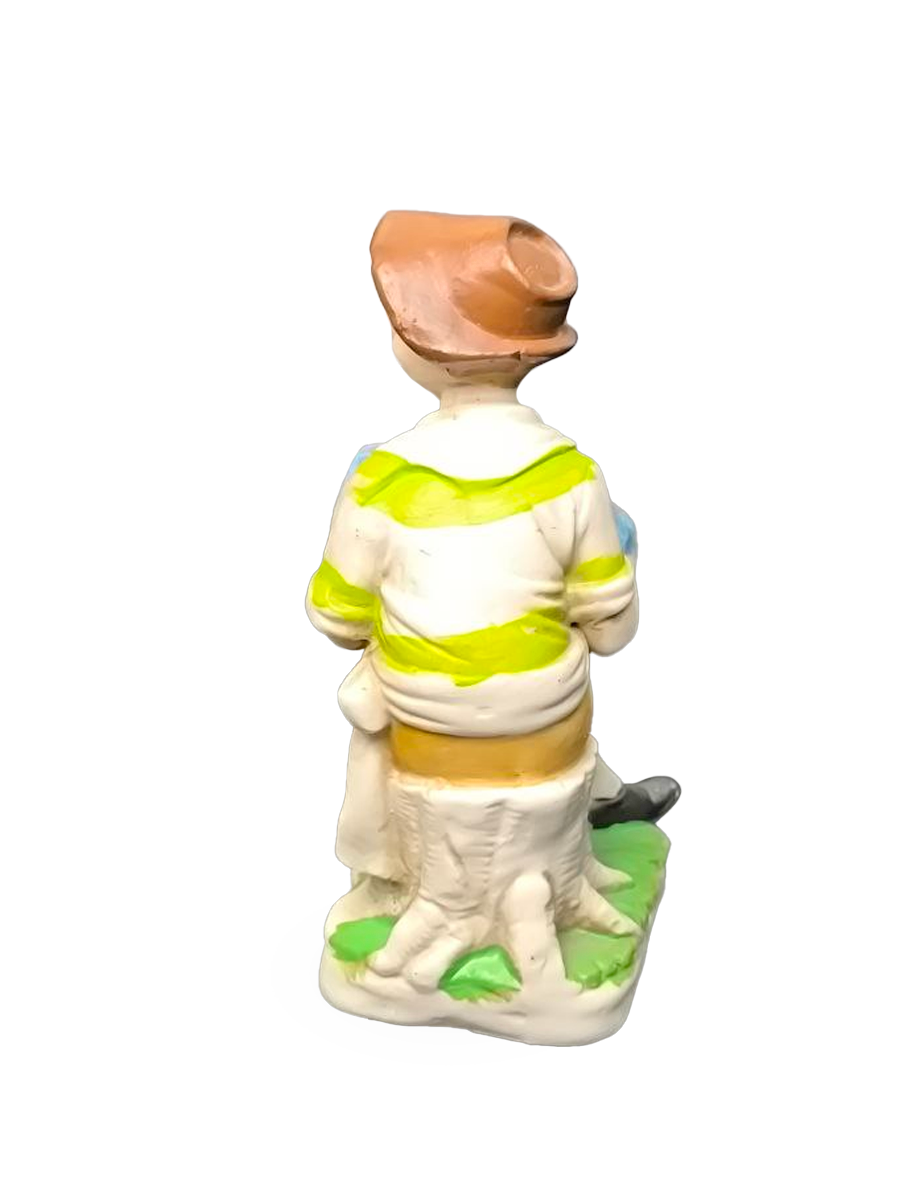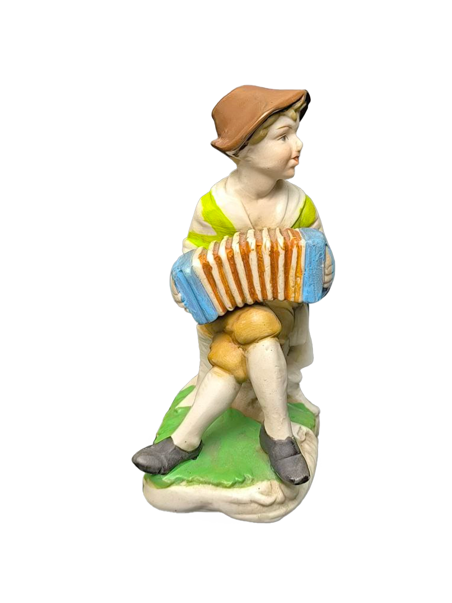 Статуэтка изображает сидящего мальчика с аккордеоном, выполненную в характерном пасторальном стиле.