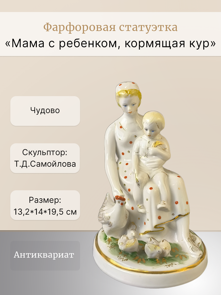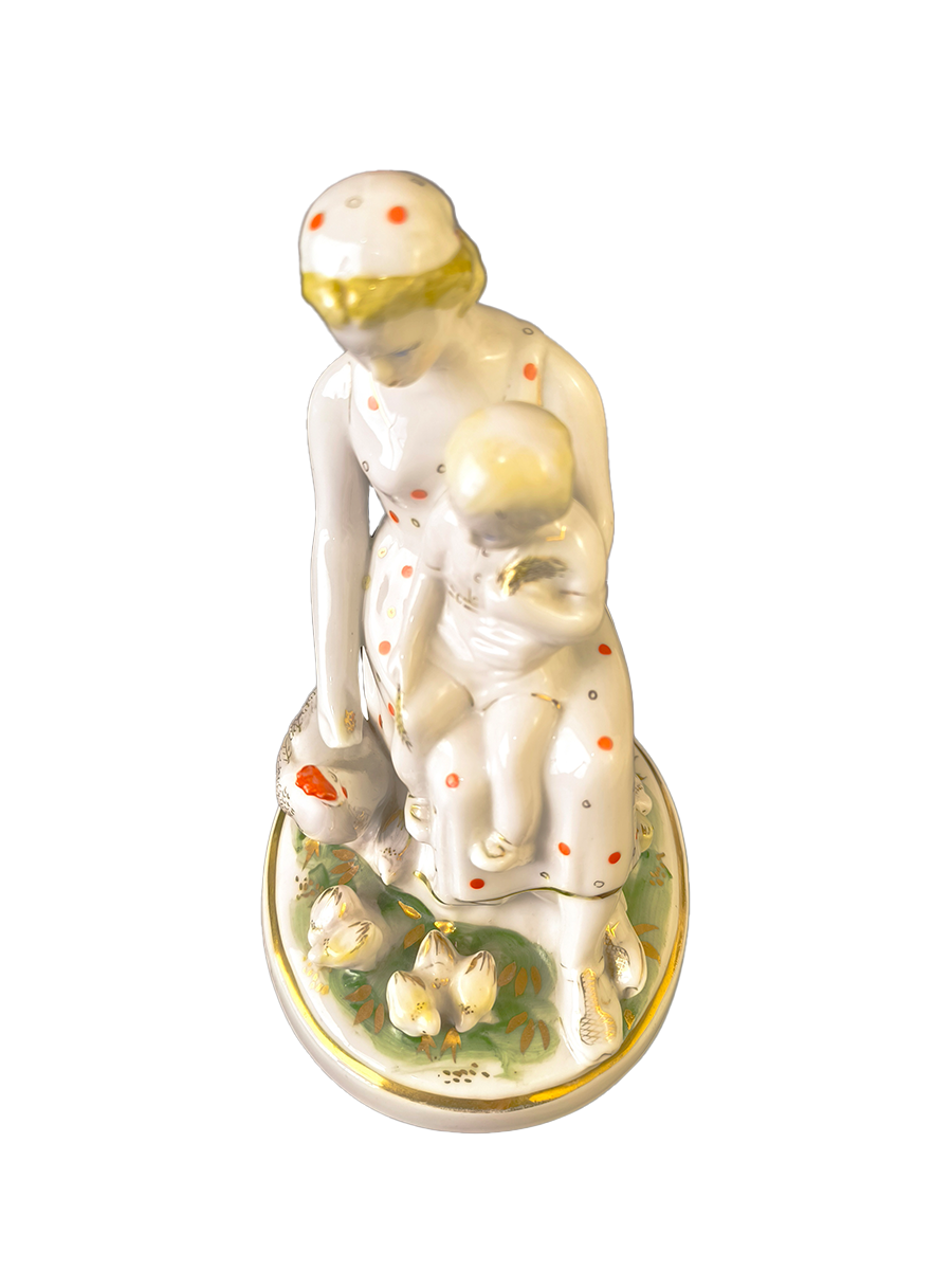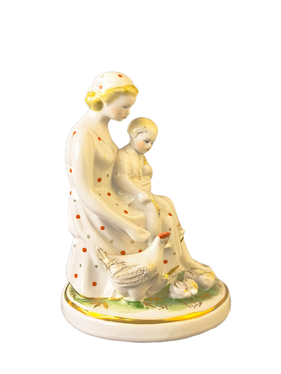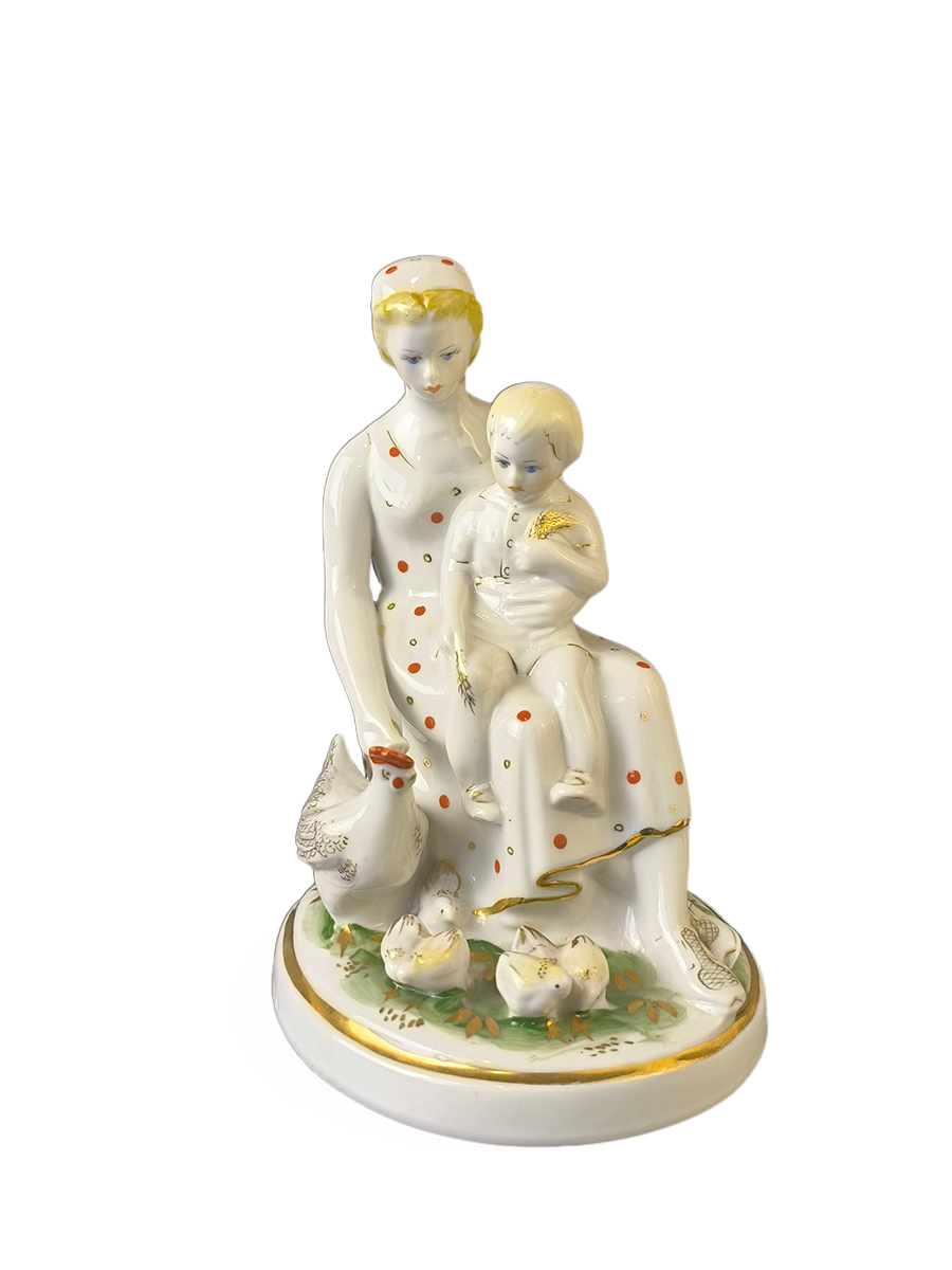 Фарфоровая статуэтка "Мама с ребенком, кормящая кур".