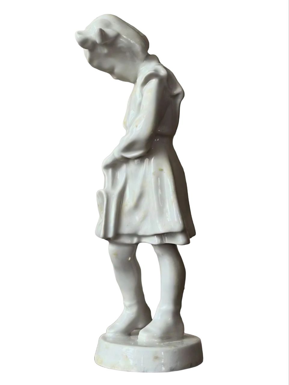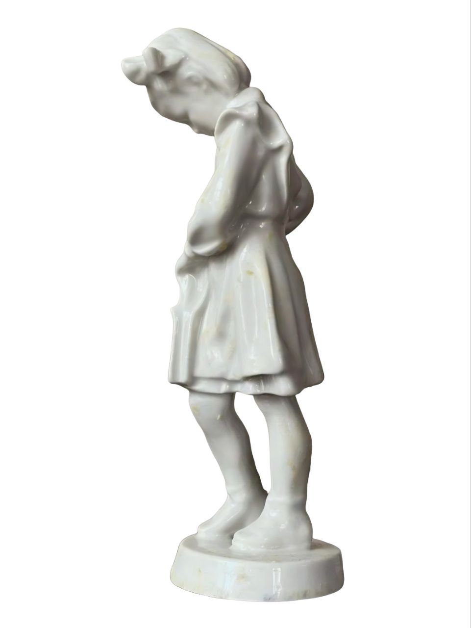Статуэтка изображает Девочку в белой форме с портфелем в руках, по всей видимости достающая учебник из своего портфеля.