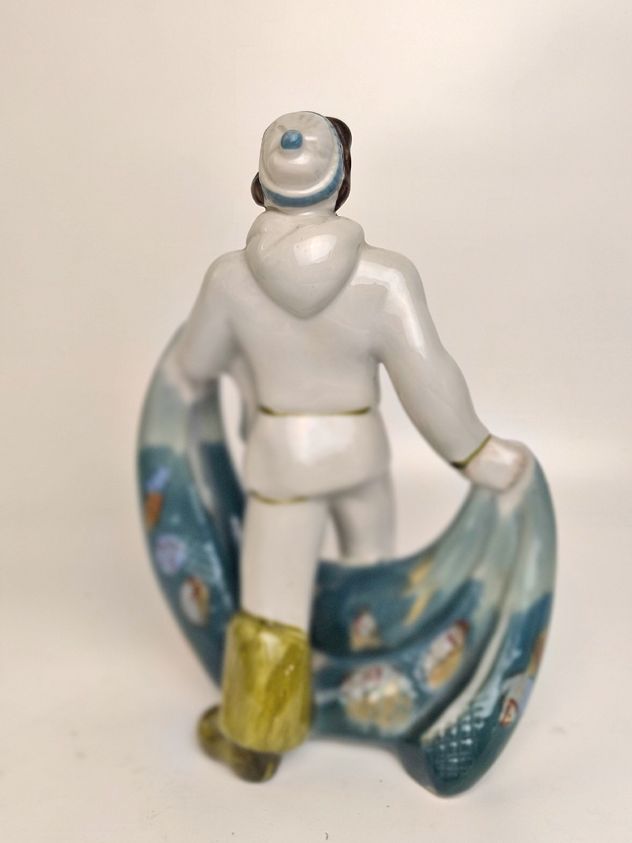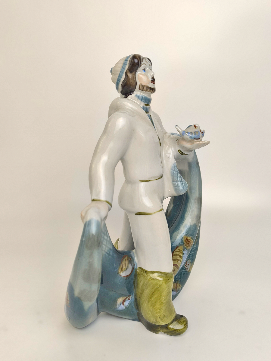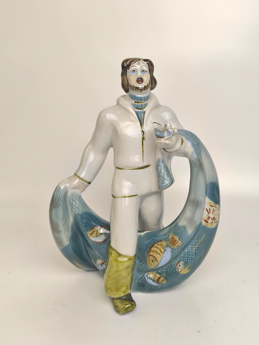 Статуэтка изображает рыбака в характерной одежде, удерживающего широкую сеть, наполненную рыбой. Она выполнена в народном стиле.