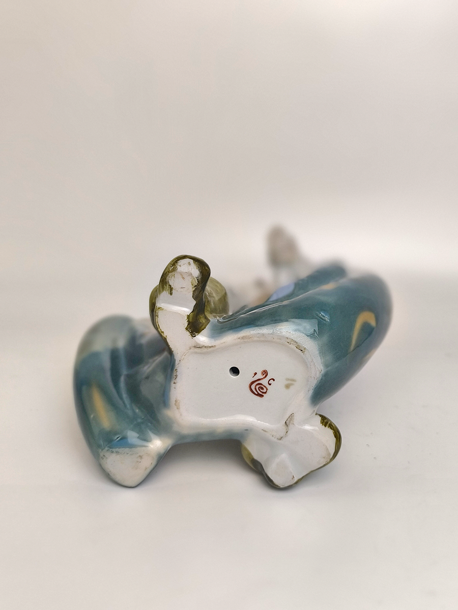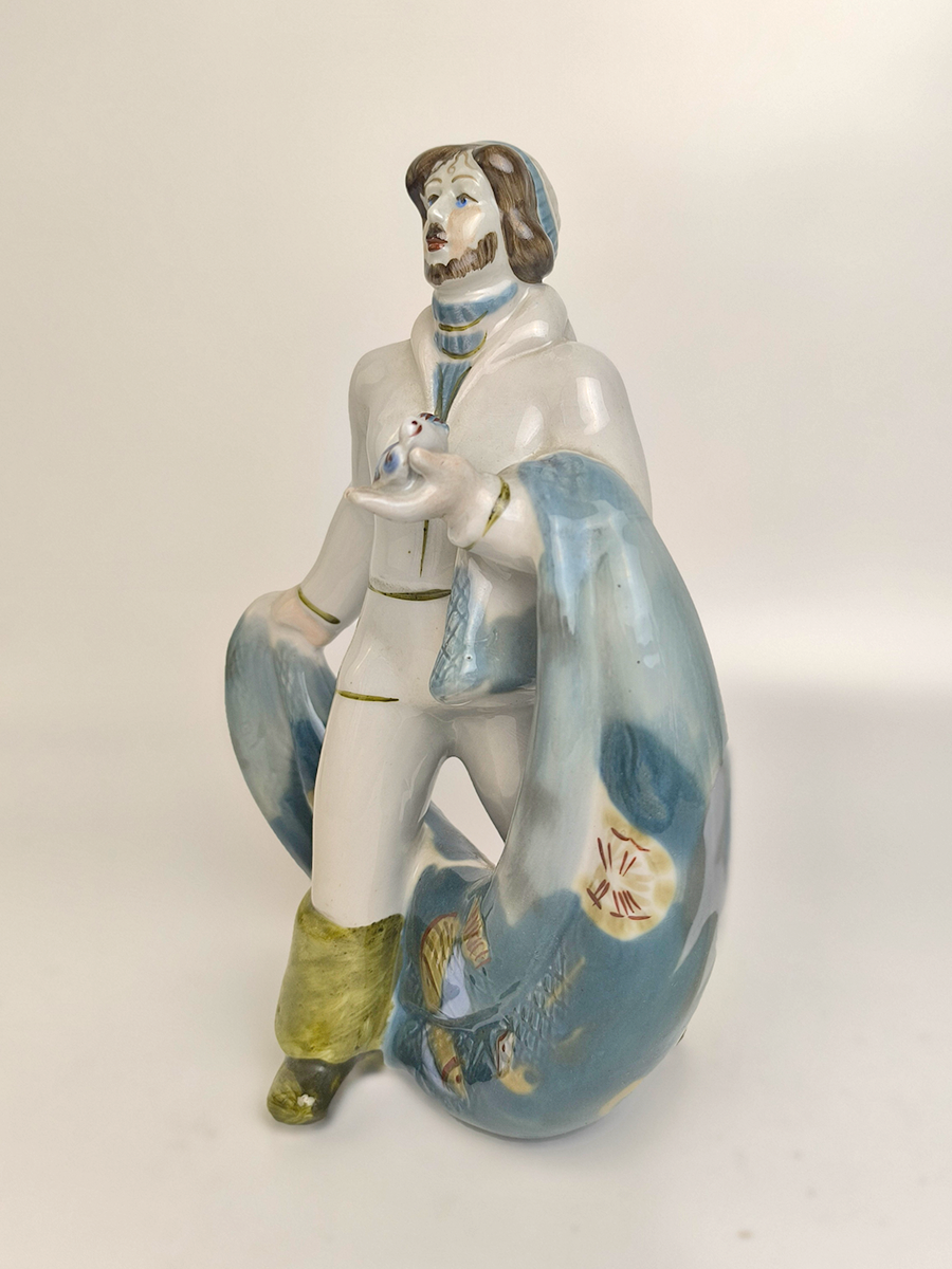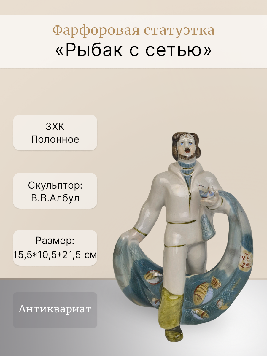 Статуэтка изображает рыбака в характерной одежде, удерживающего широкую сеть, наполненную рыбой. Она выполнена в народном стиле.