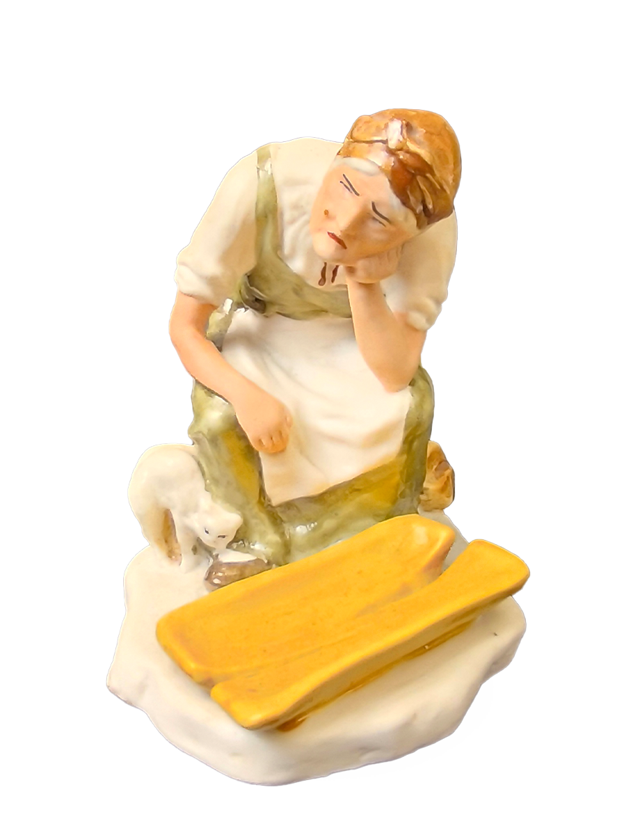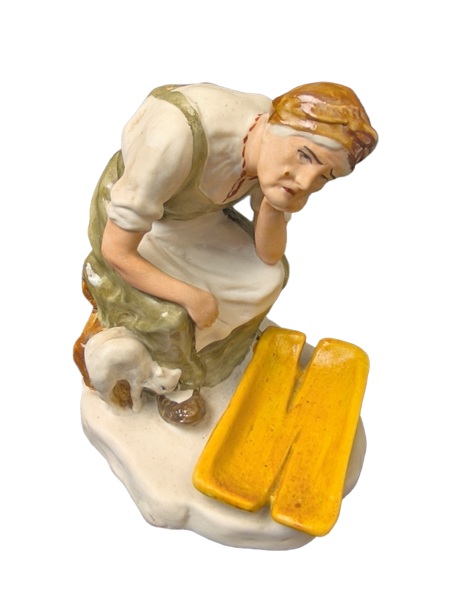 Статуэтка изображает пожилую женщину, склонившуюся над разбитым желтым корытом, рядом с которым стоит кошка.