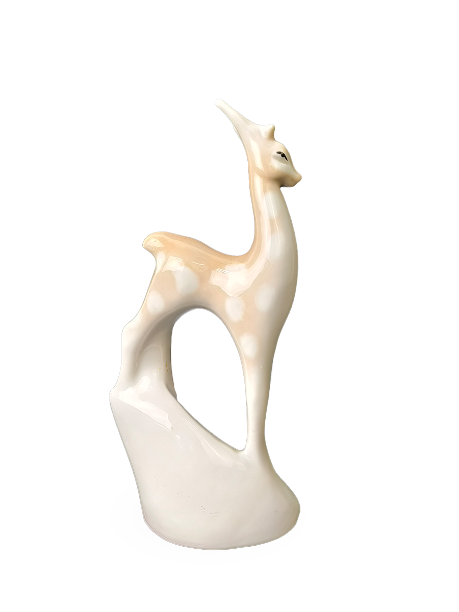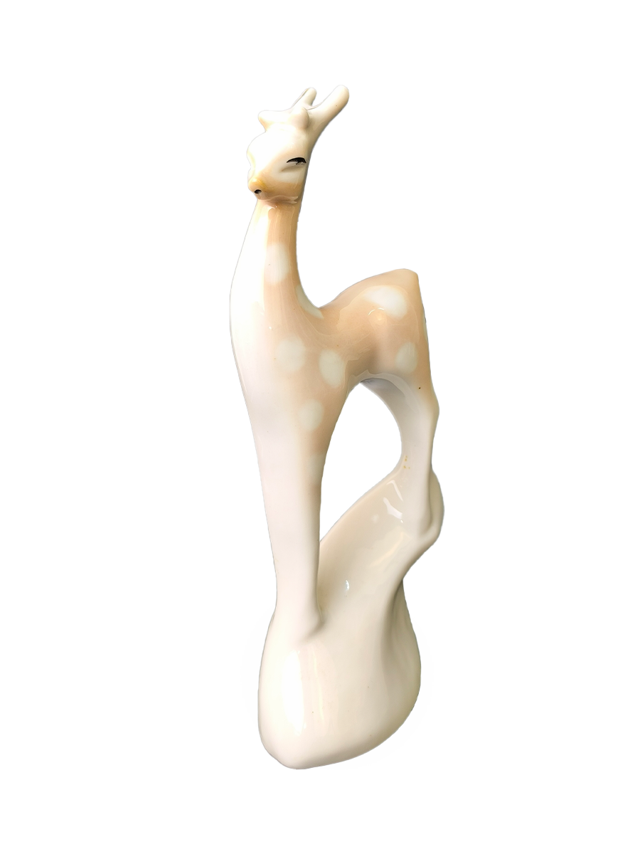 Статуэтка изображает олененка с длинной шеей и тонкими ногами, стоящая на декоративном основании, что характерно для анималистического стиля того времени.