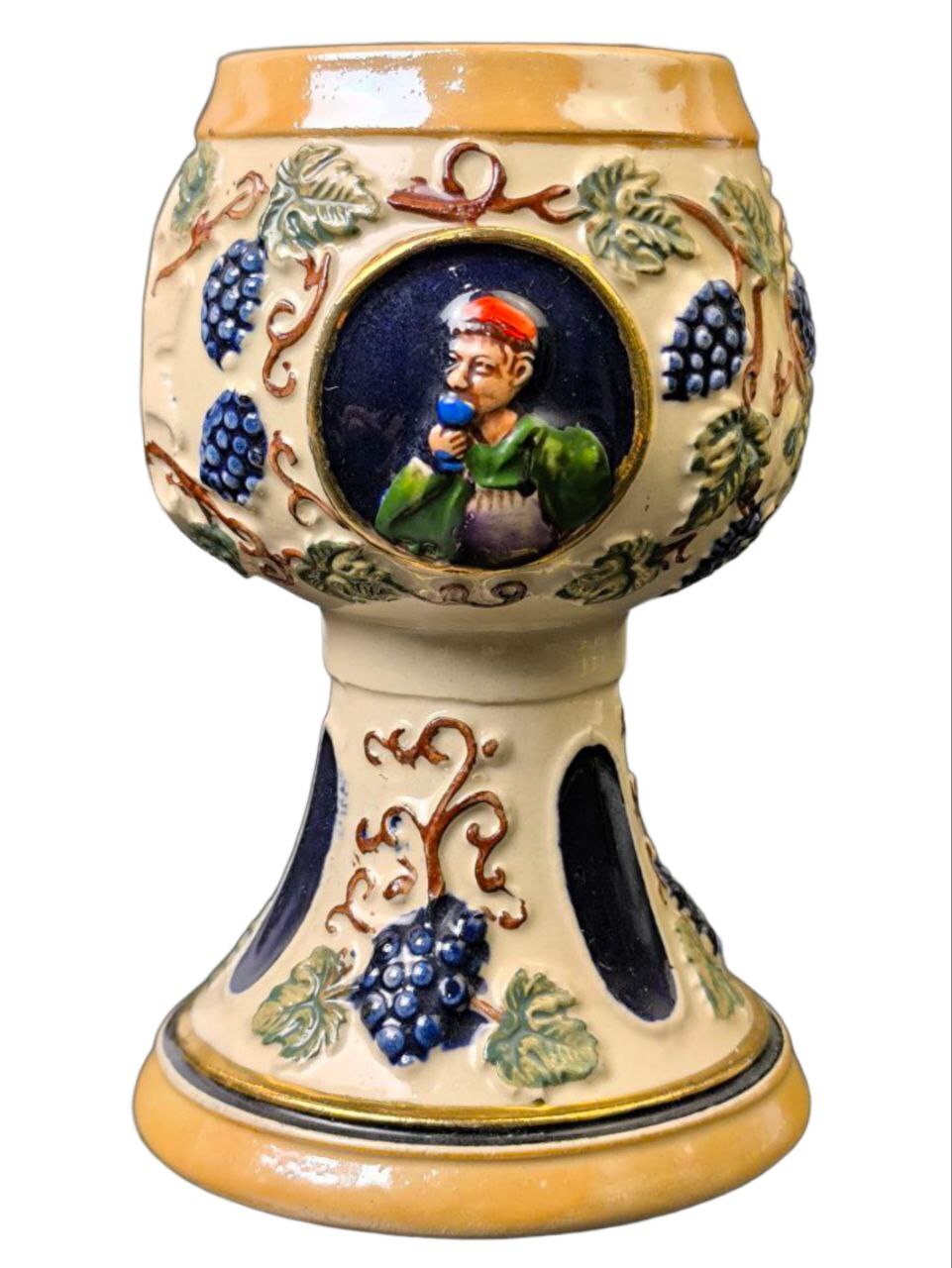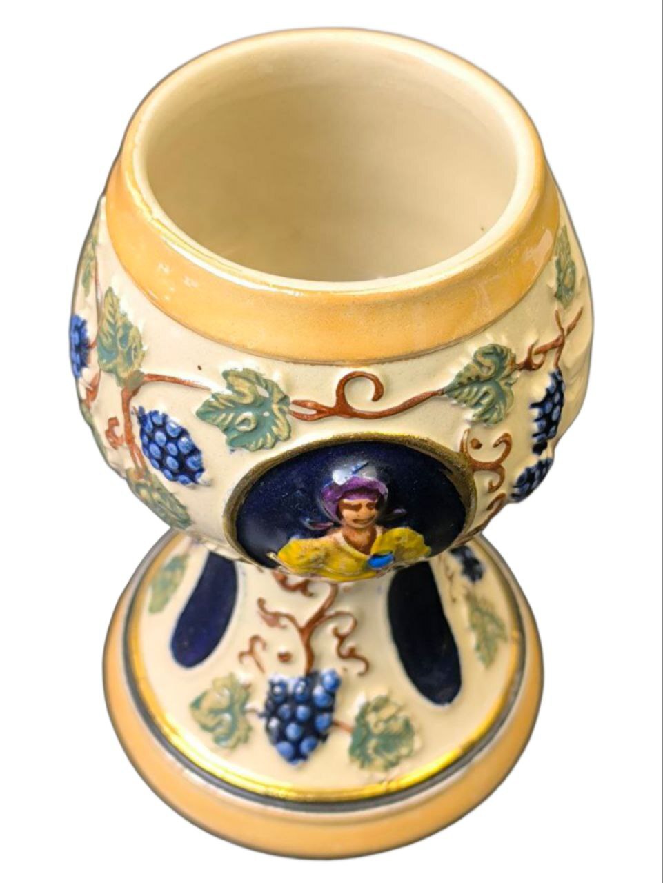 Кубок украшен объемными (рельефными) изображениями винограда, листьев и центральным расписным медальоном.