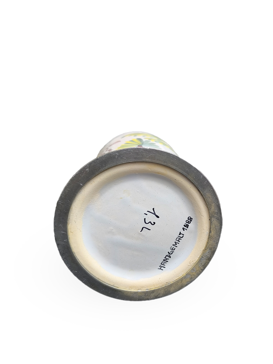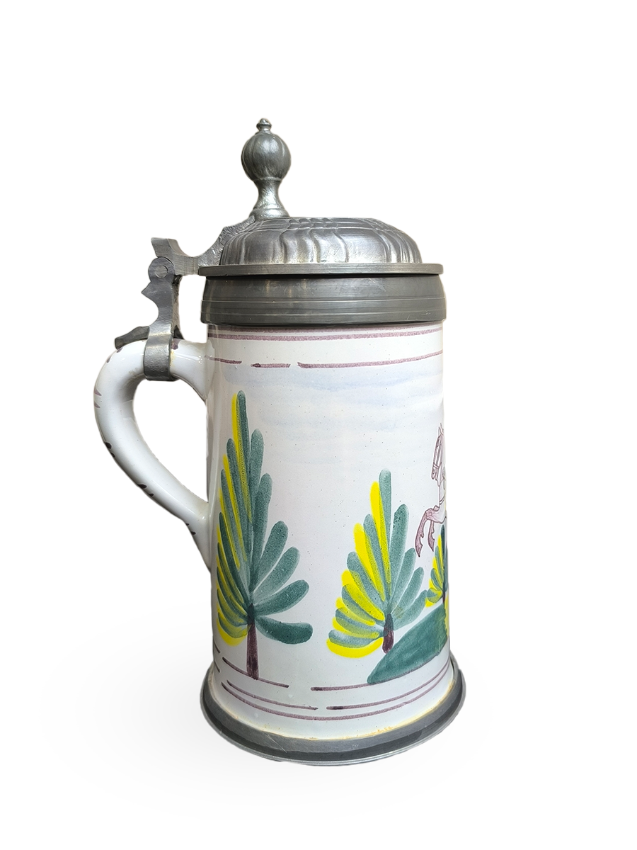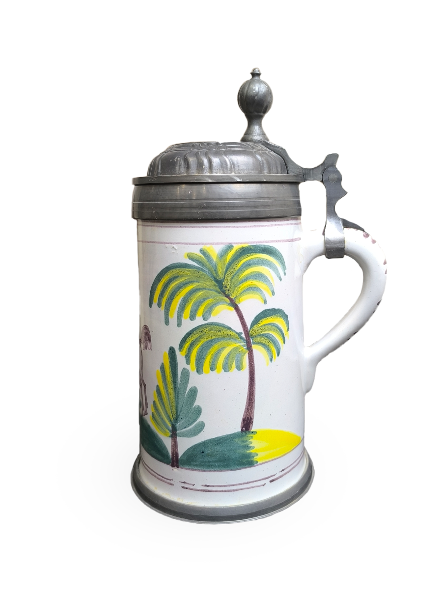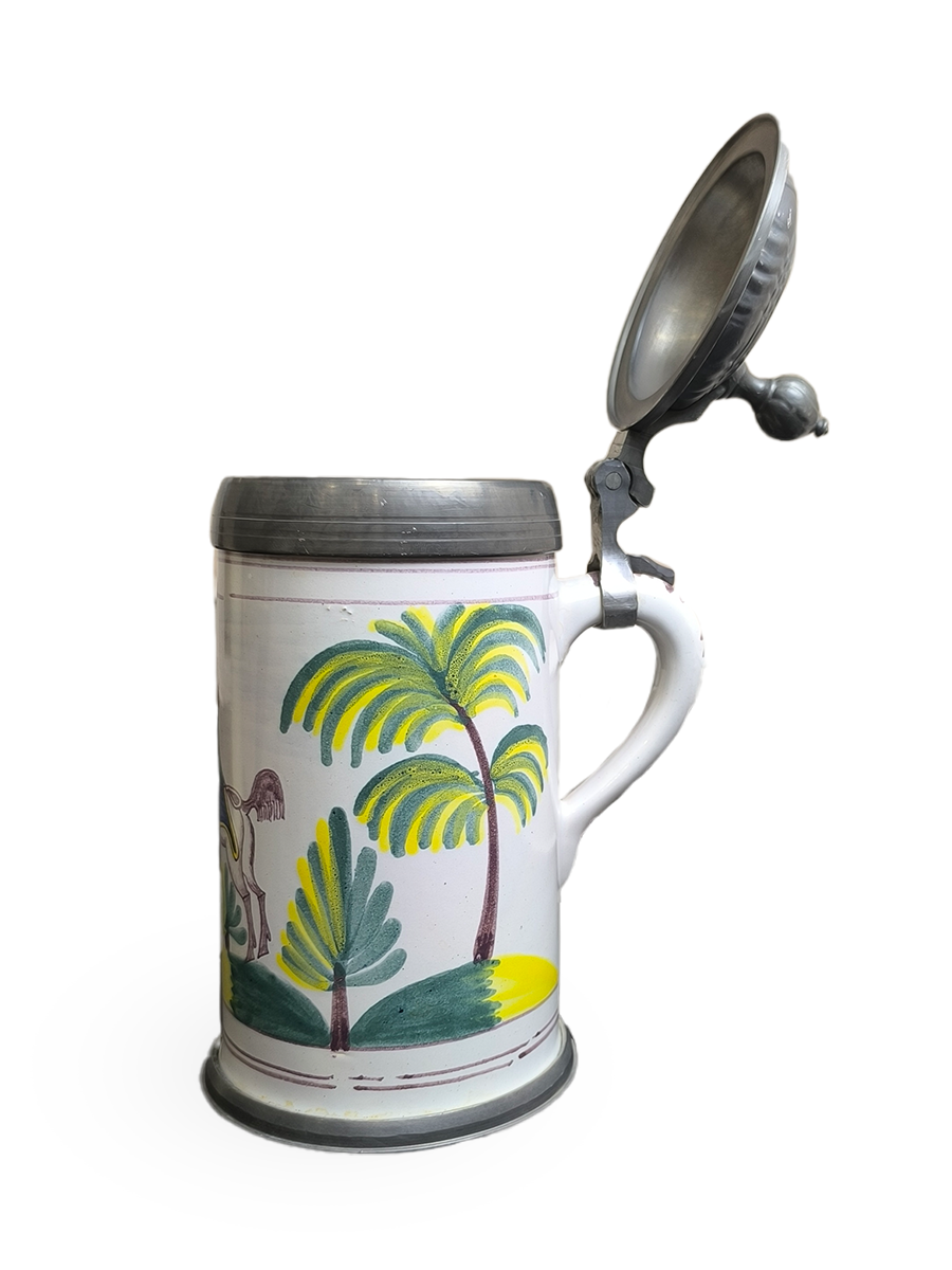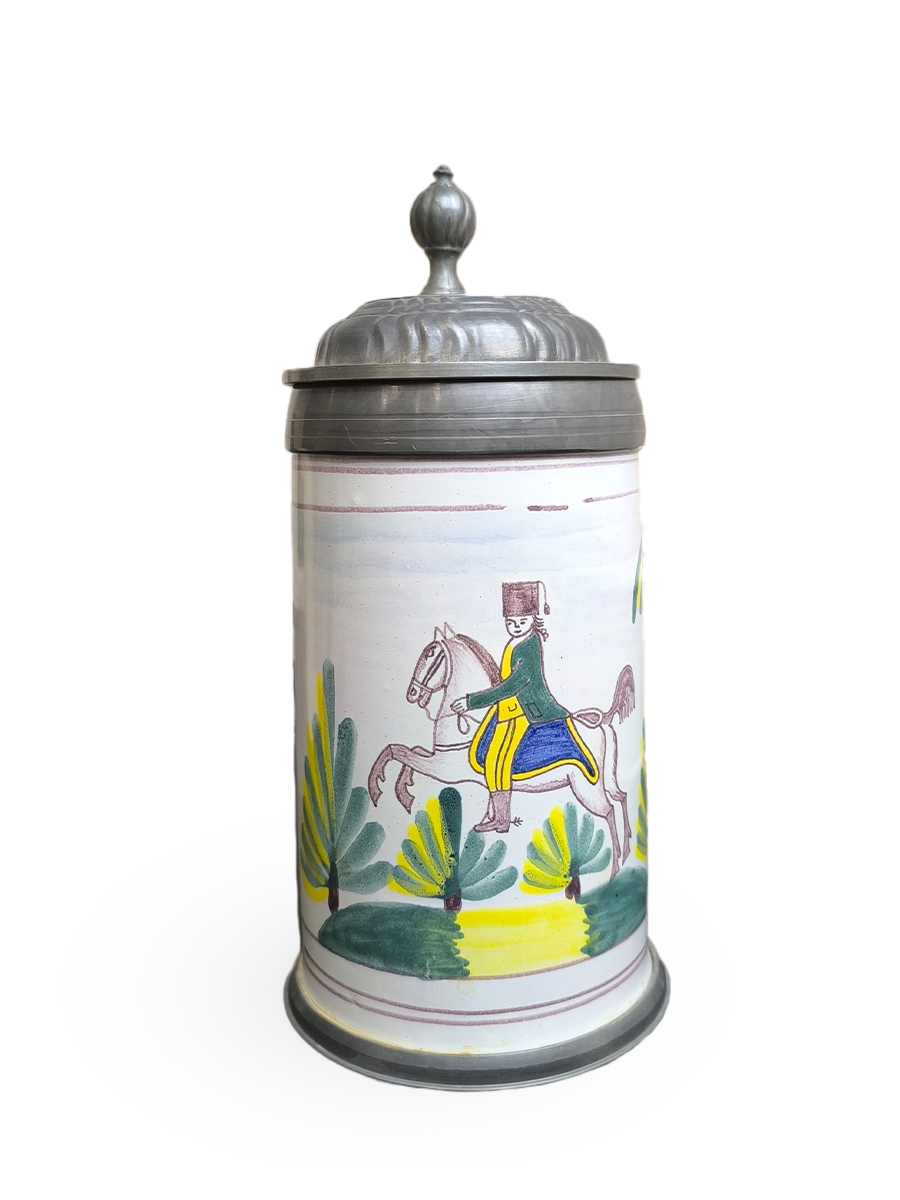 Эта фаянсовая цилиндрическая кружка с оловянной крышкой, оловянным ободом и оловянным основанием является точной копией швабского оригинала XVIII века. Она произведена на мануфактуре Эттинген - Шраттенхофен и входит в коллекцию фаянса Баварского союза пивоваров, Мюнхен.