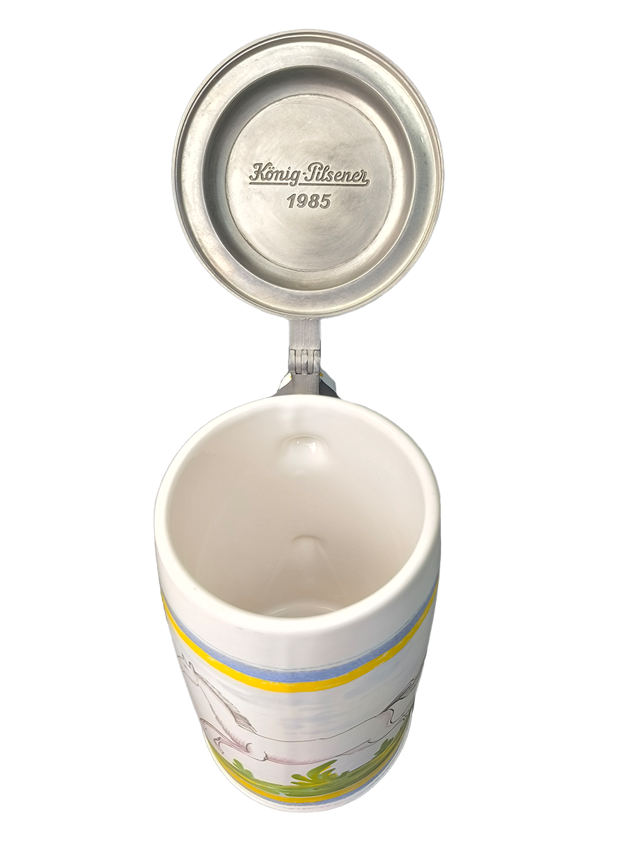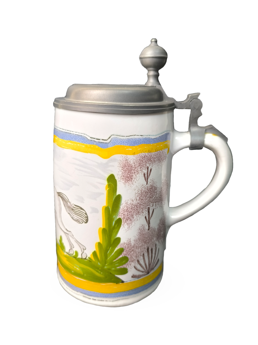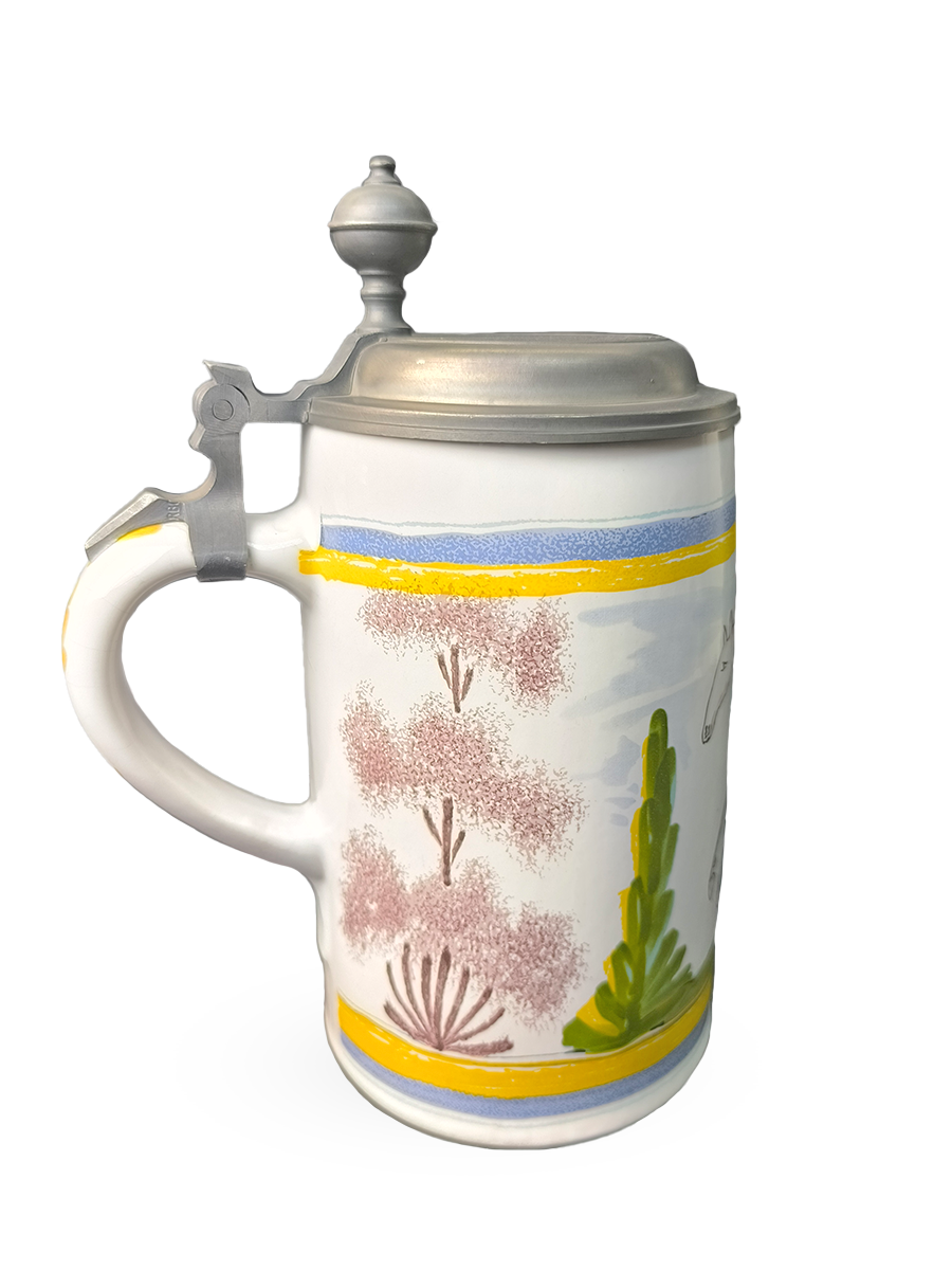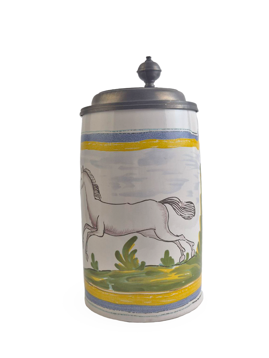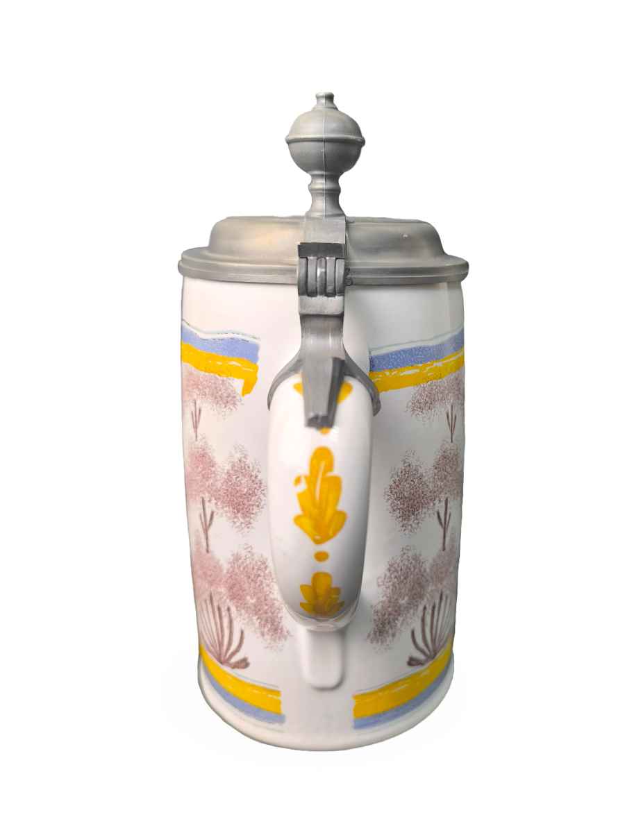 Эта фаянсовая цилиндрическая кружка с оловянной крышкой, оловянным ободом и оловянным основанием является точной копией швабского оригинала XVIII века. Она произведена на мануфактуре Эттинген - Шраттенхофен и входит в коллекцию фаянса Баварского союза пивоваров, Мюнхен.