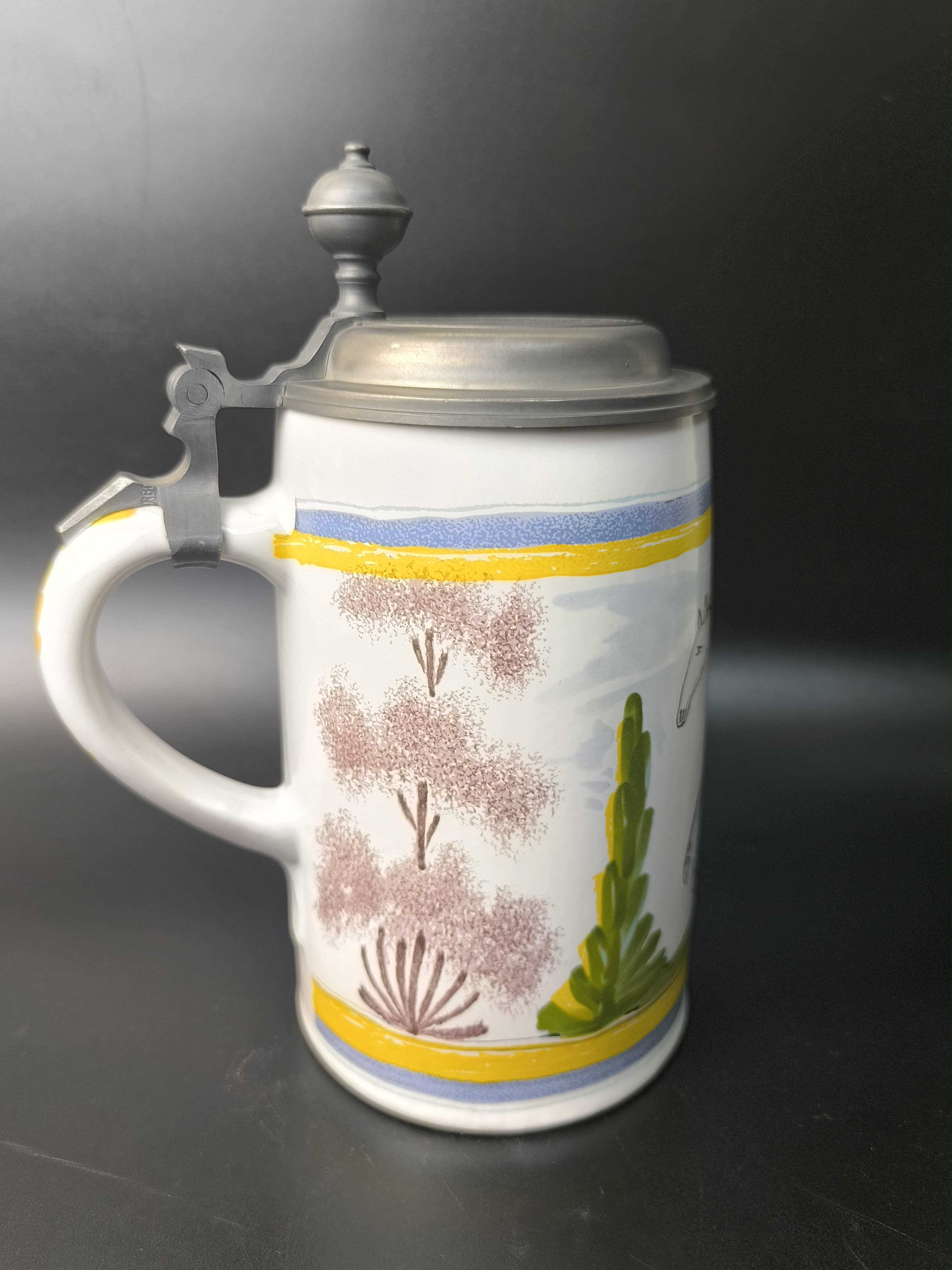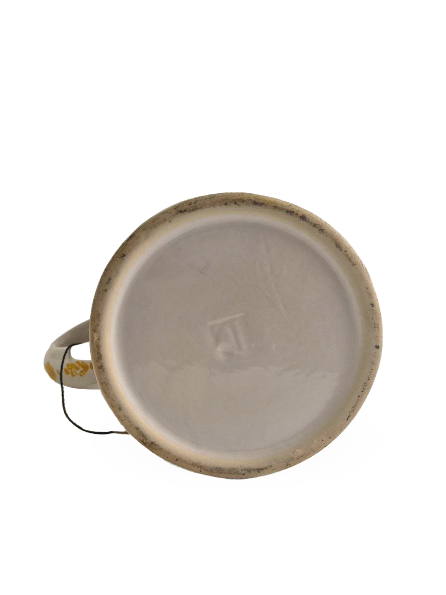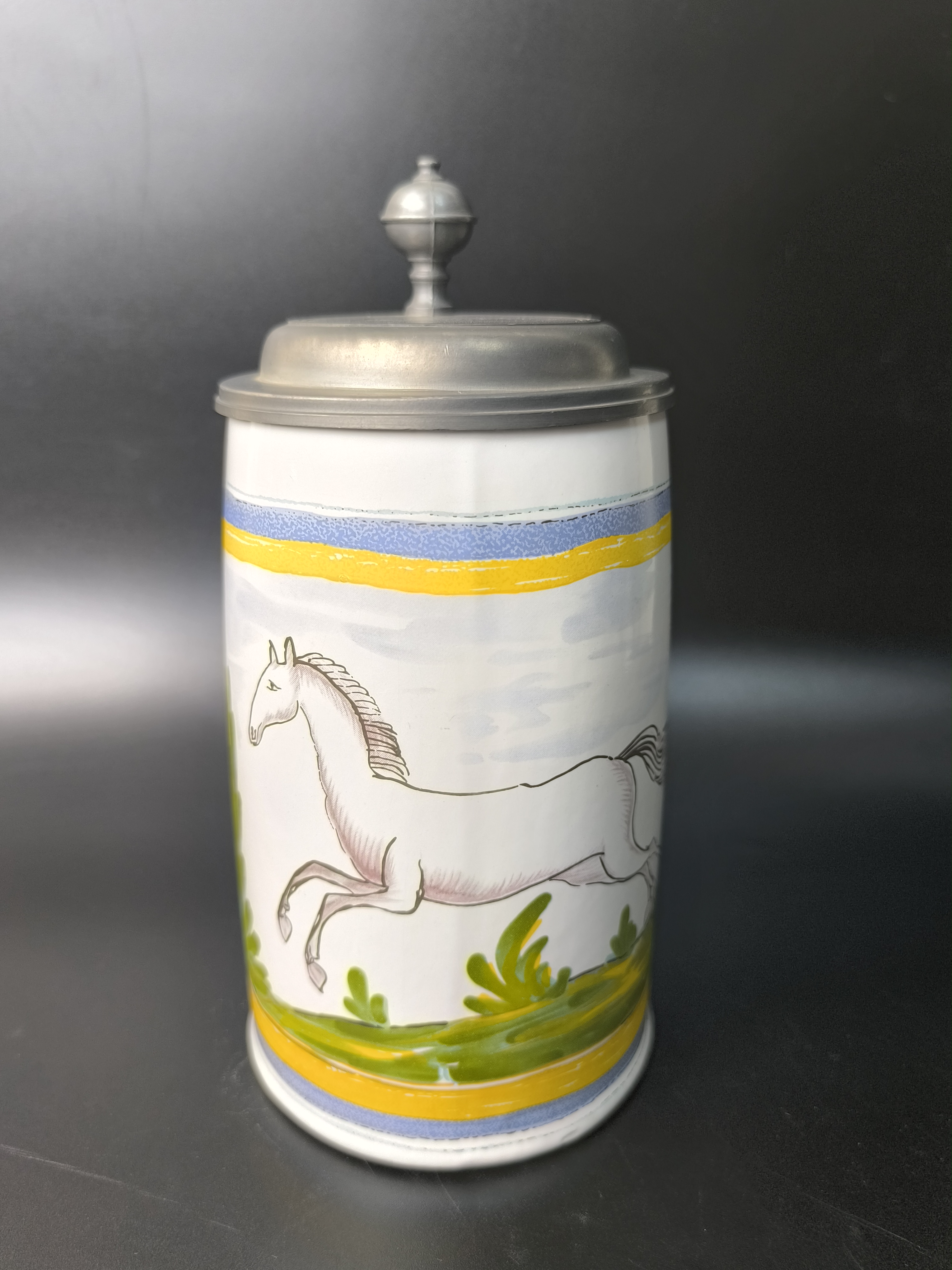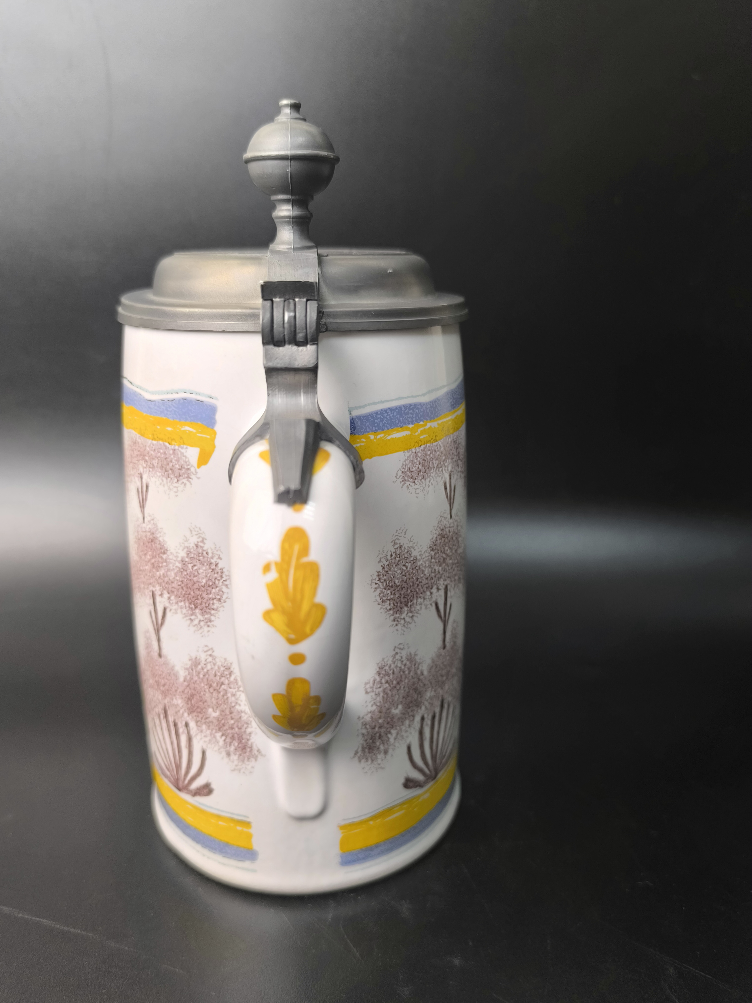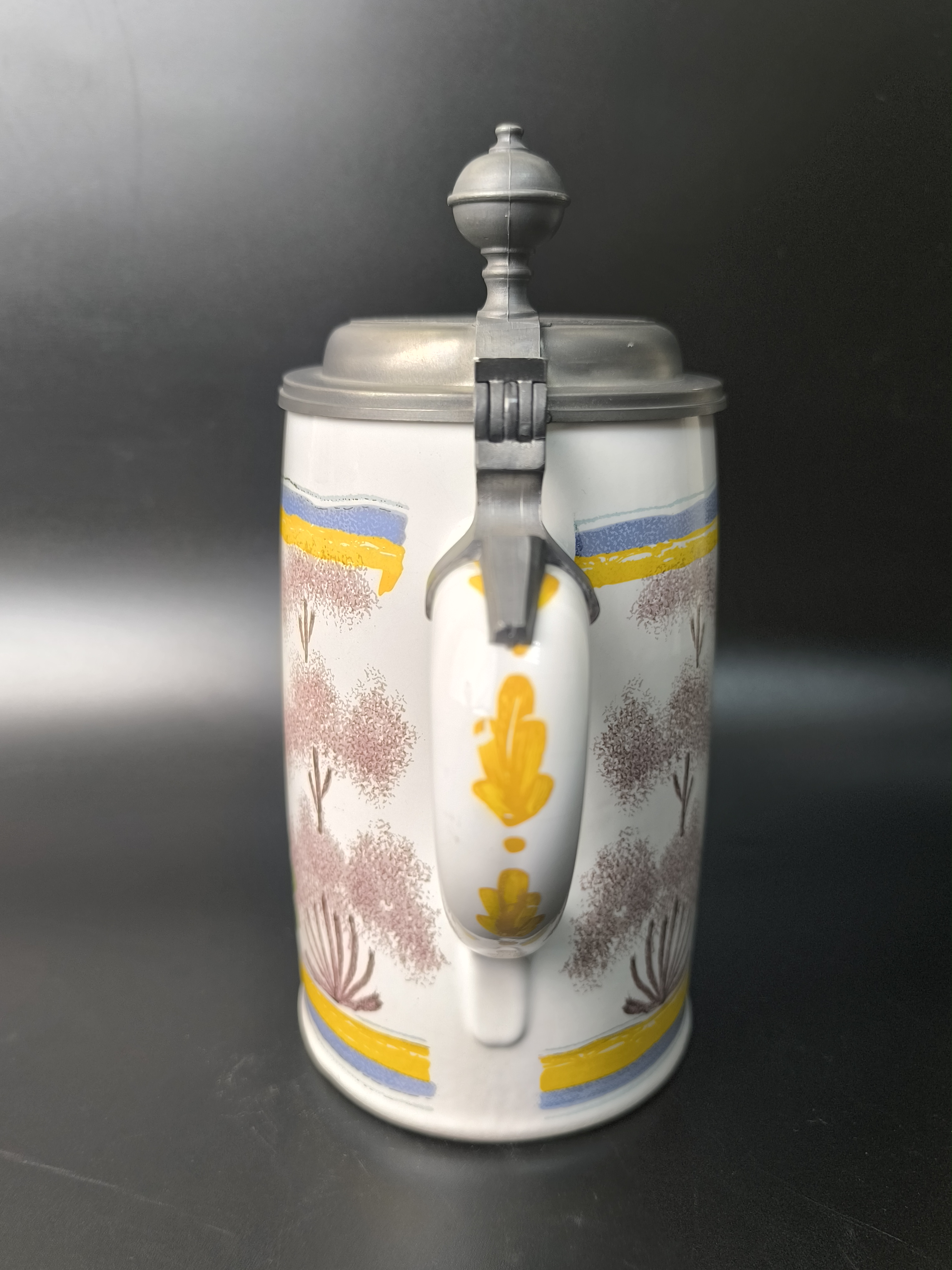 Эта фаянсовая цилиндрическая кружка с оловянной крышкой, оловянным ободом и оловянным основанием является точной копией швабского оригинала XVIII века. Она произведена на мануфактуре Эттинген - Шраттенхофен и входит в коллекцию фаянса Баварского союза пивоваров, Мюнхен.