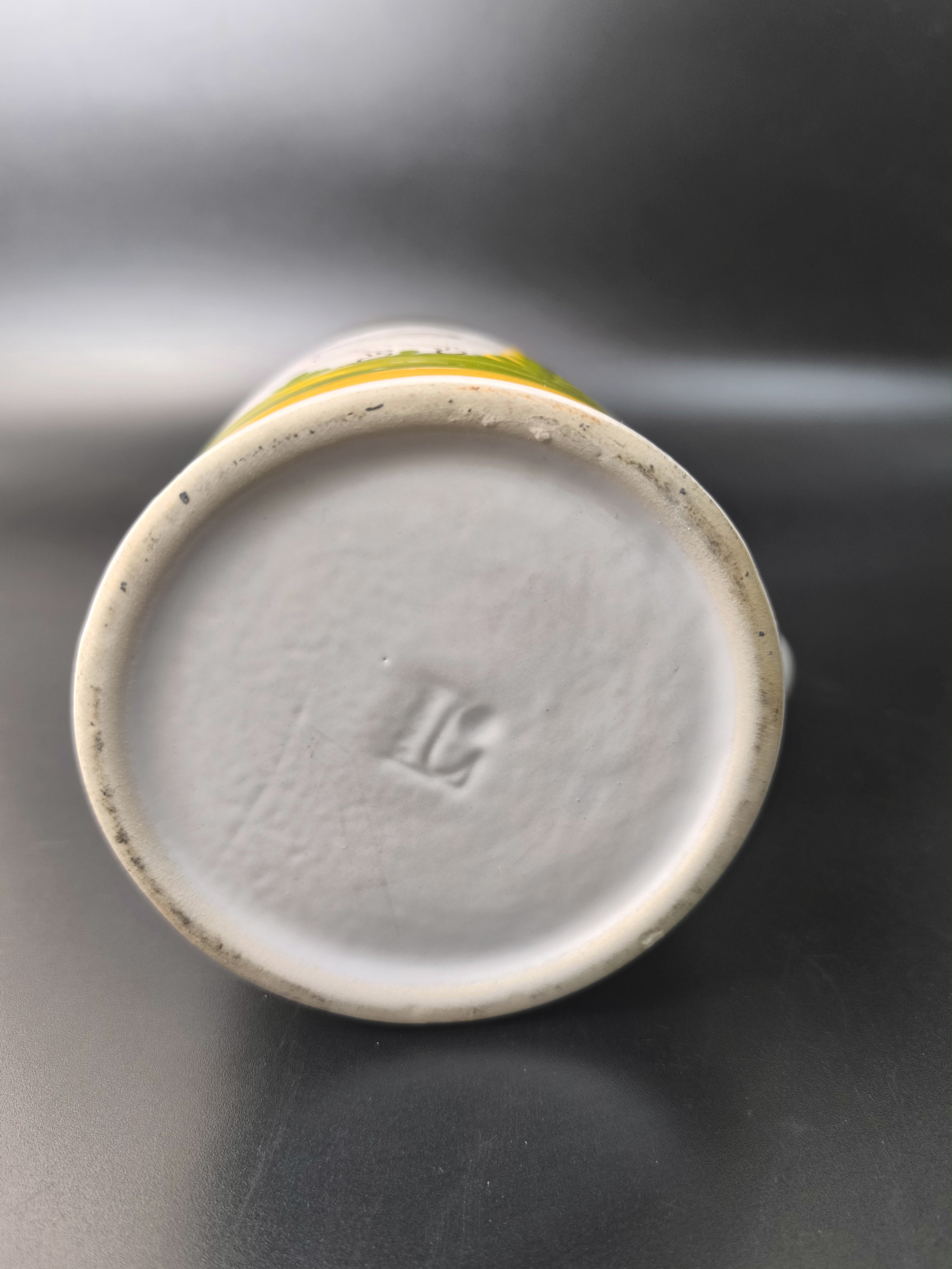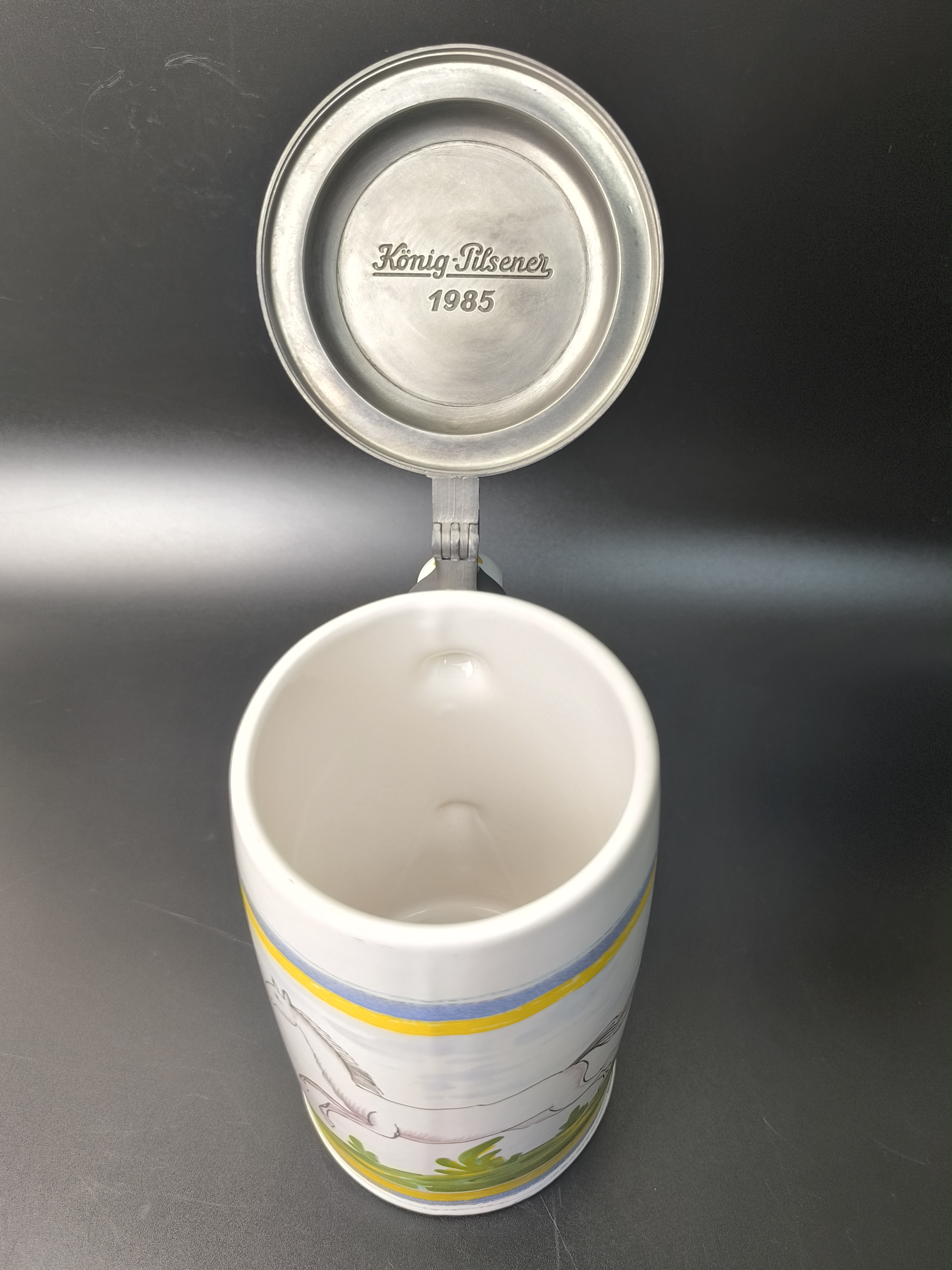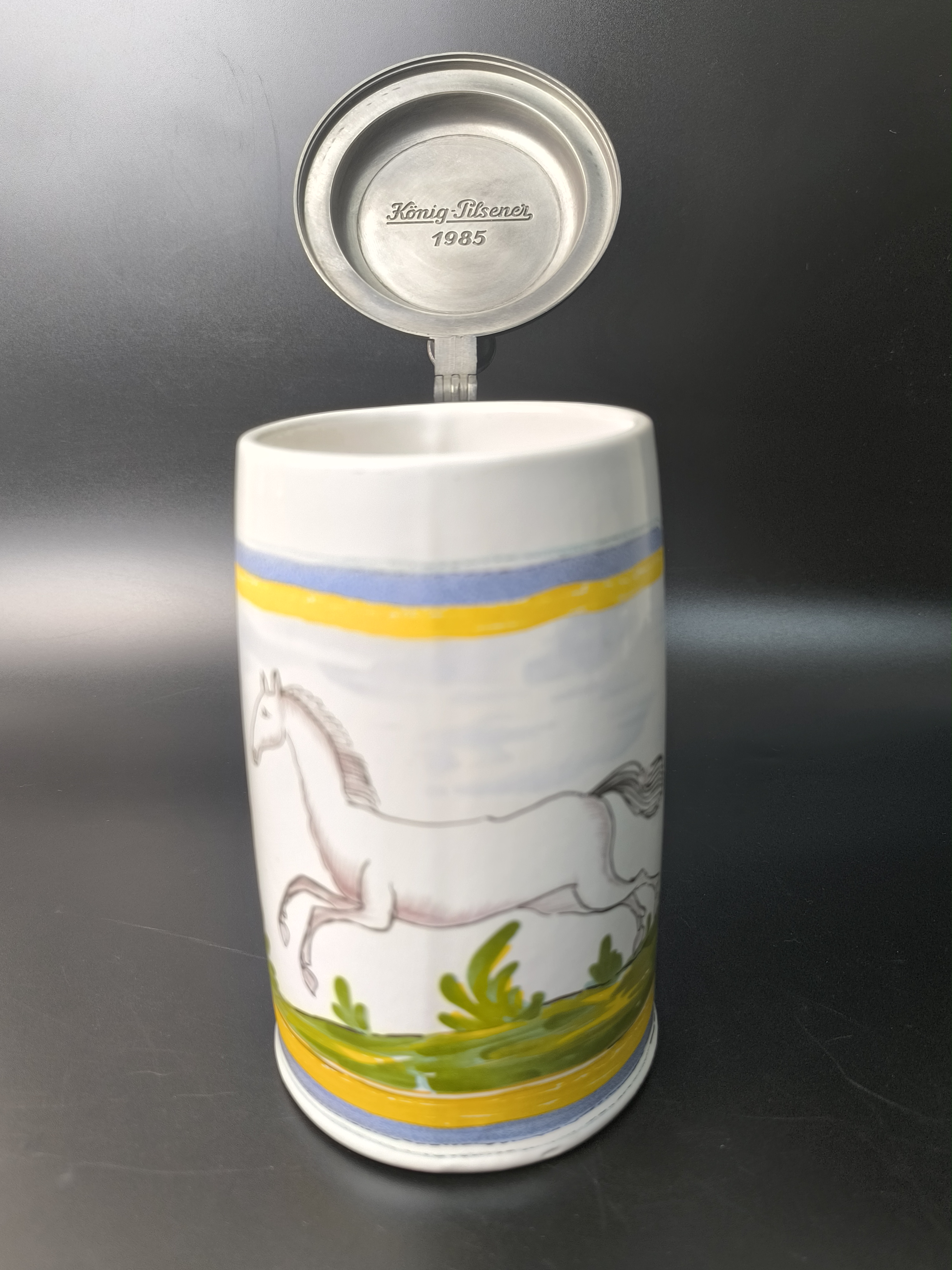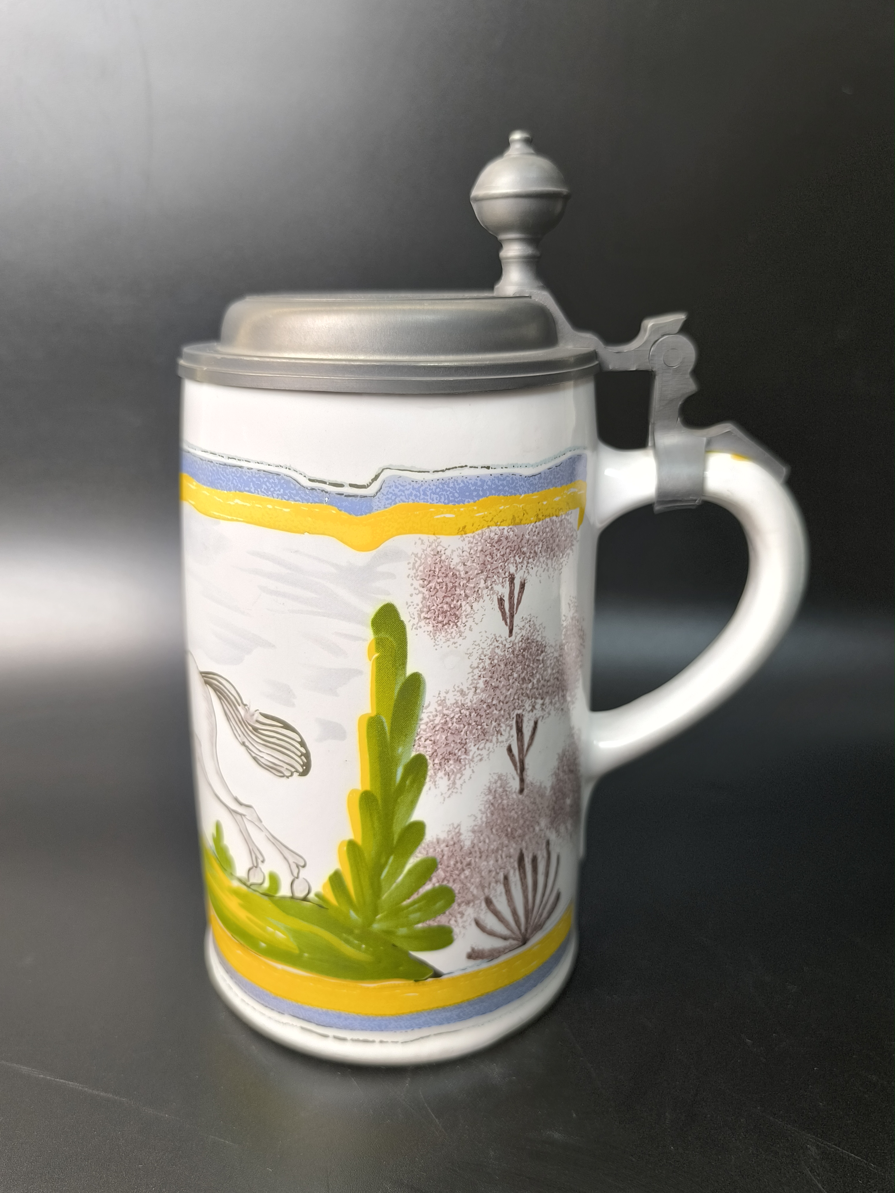 Эта фаянсовая цилиндрическая кружка с оловянной крышкой, оловянным ободом и оловянным основанием является точной копией швабского оригинала XVIII века. Она произведена на мануфактуре Эттинген - Шраттенхофен и входит в коллекцию фаянса Баварского союза пивоваров, Мюнхен.