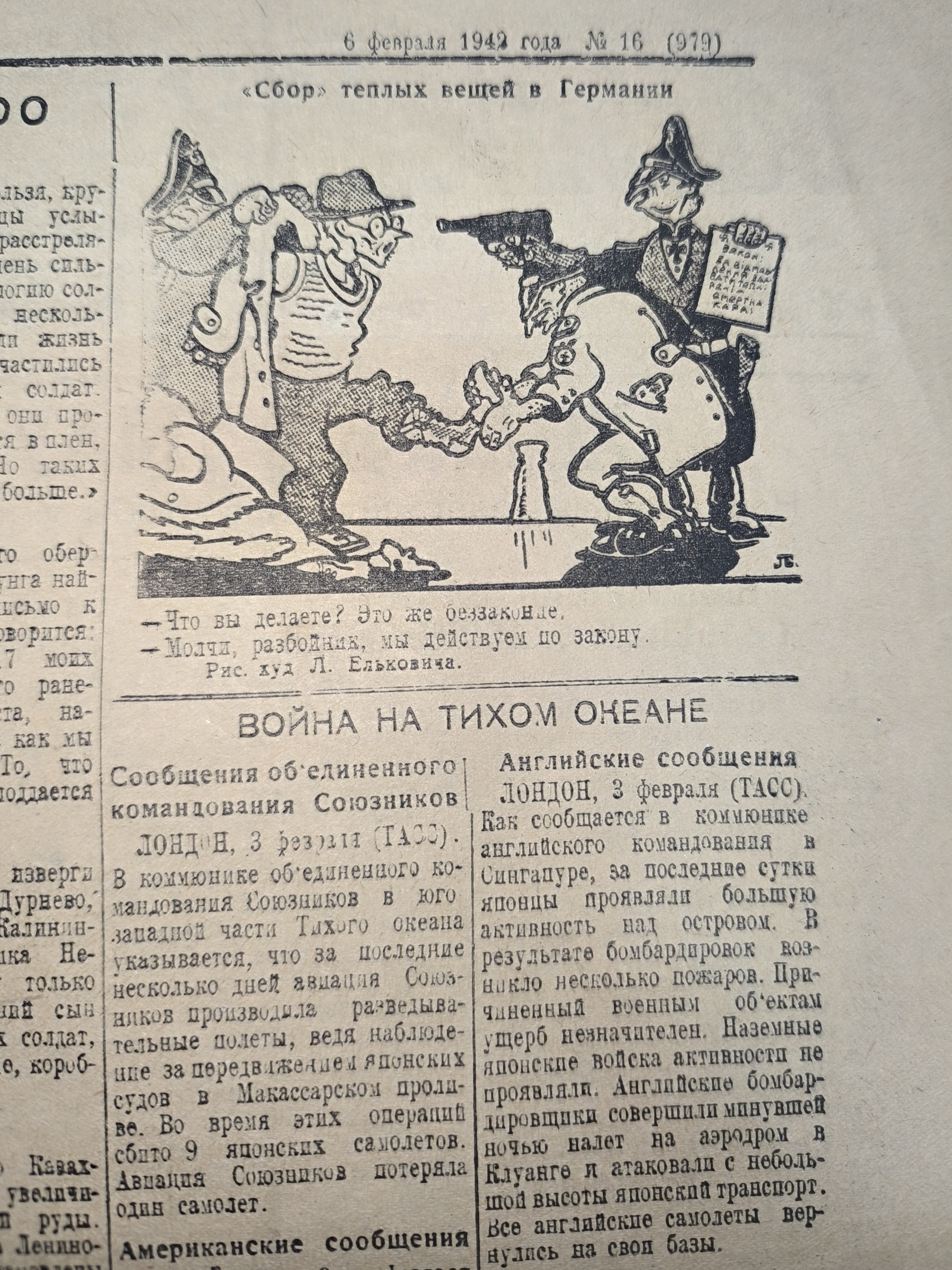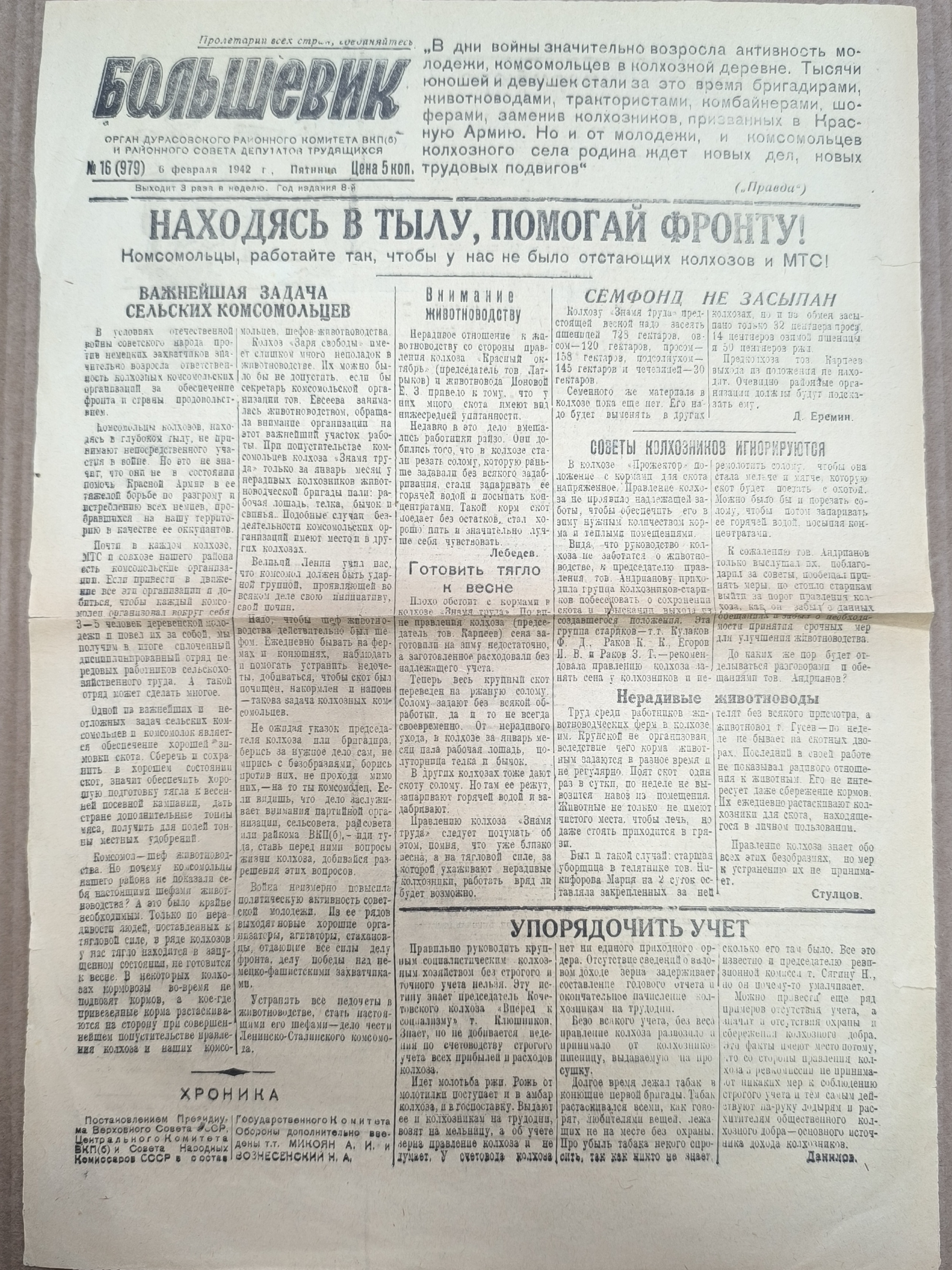 Газета военного времени "Большевик". 6 февраля 1942 год.