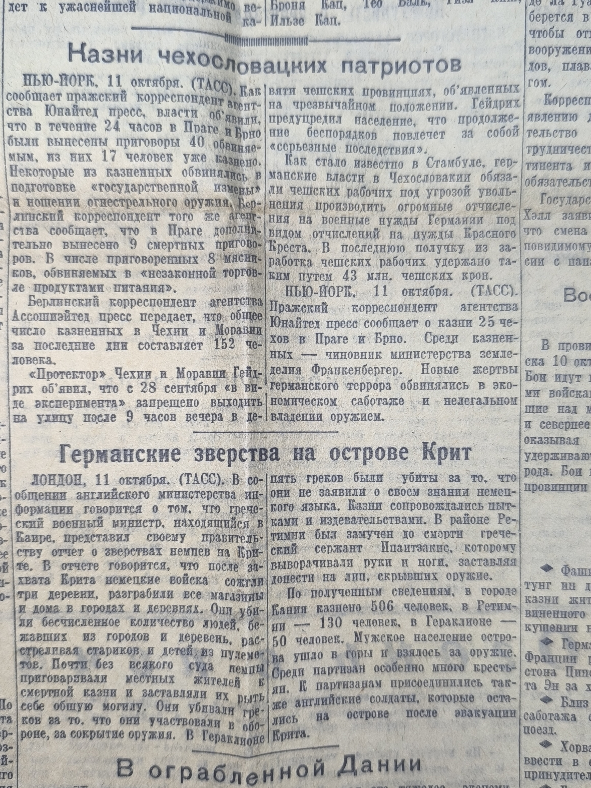 "Каждый мужчина должен быстро научиться владеть оружием", "Казни чехословацких патриотов", "Германские зверства на острове Крит".