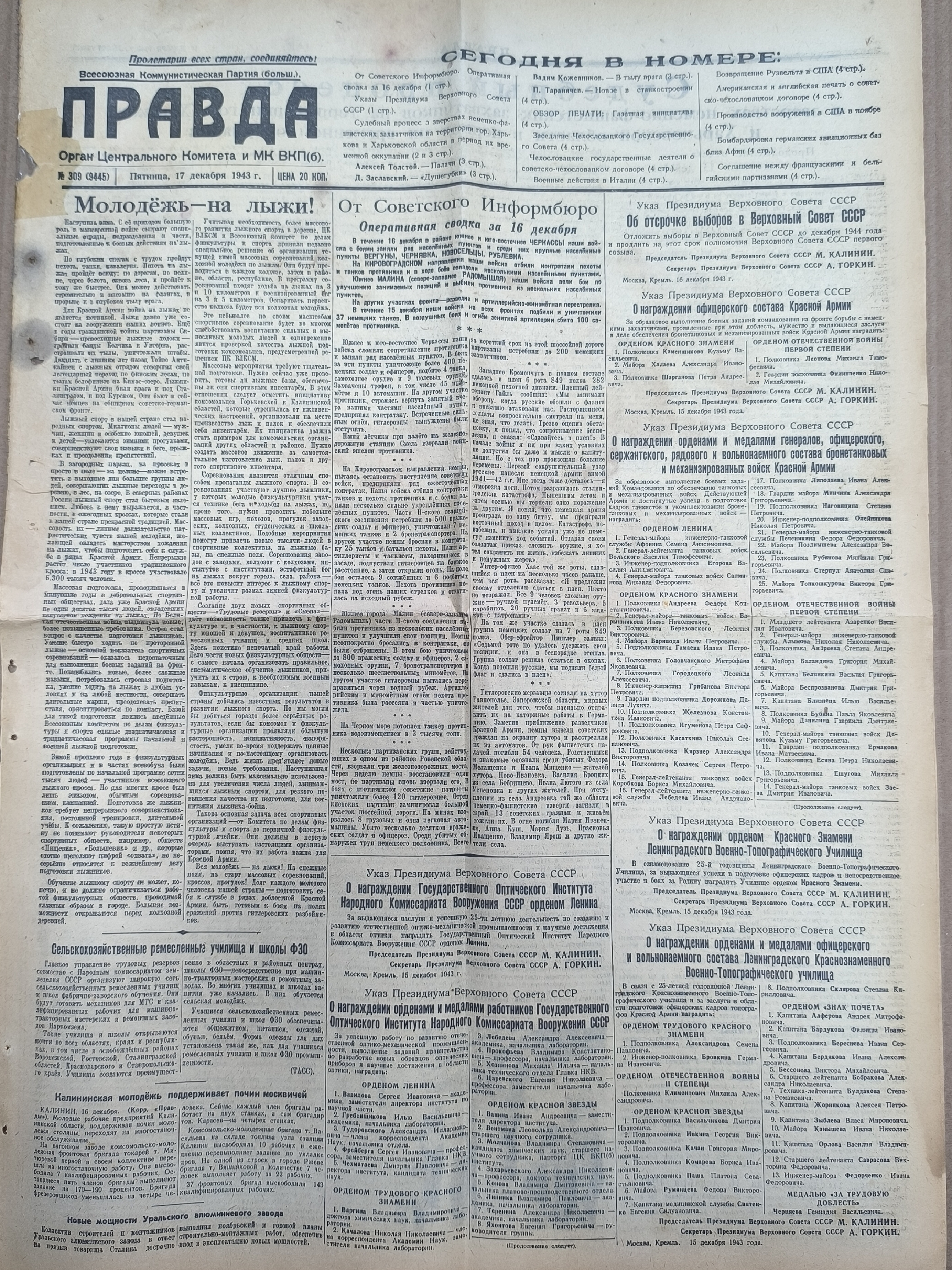 Газета военного времени "Правда". 17 декабря 1943 года.