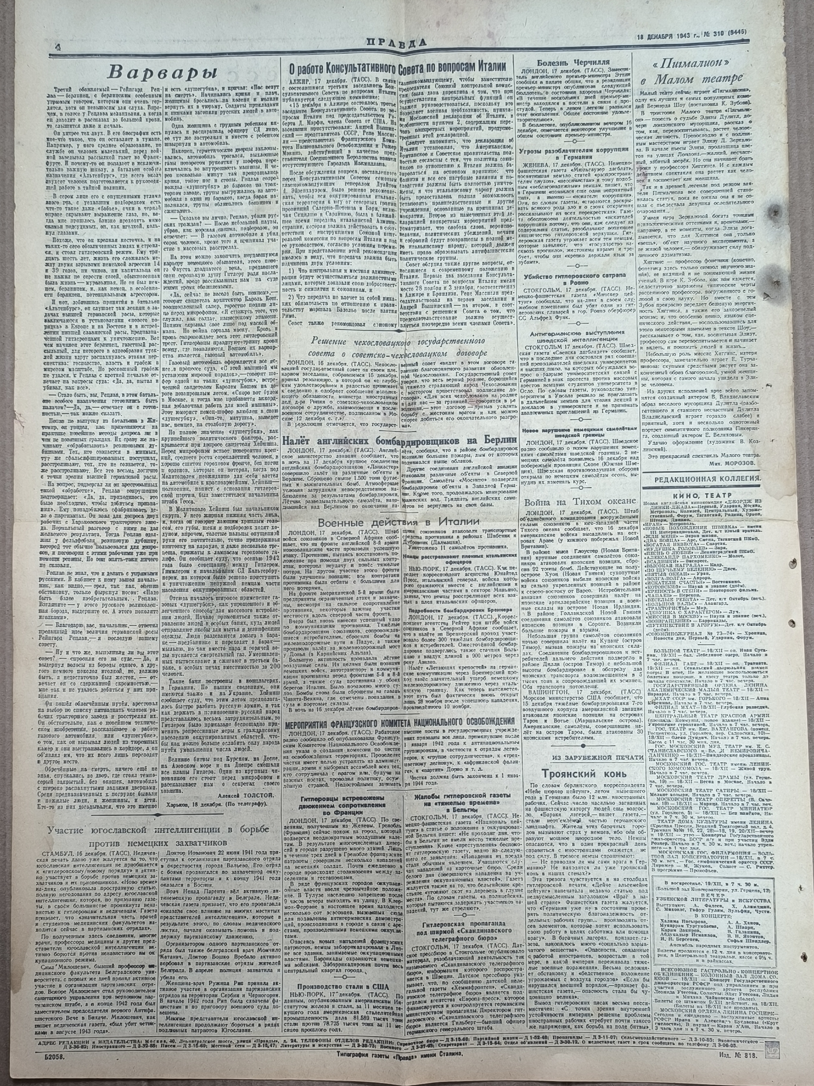Газета военного времени "Правда". 18 декабря 1943 года.