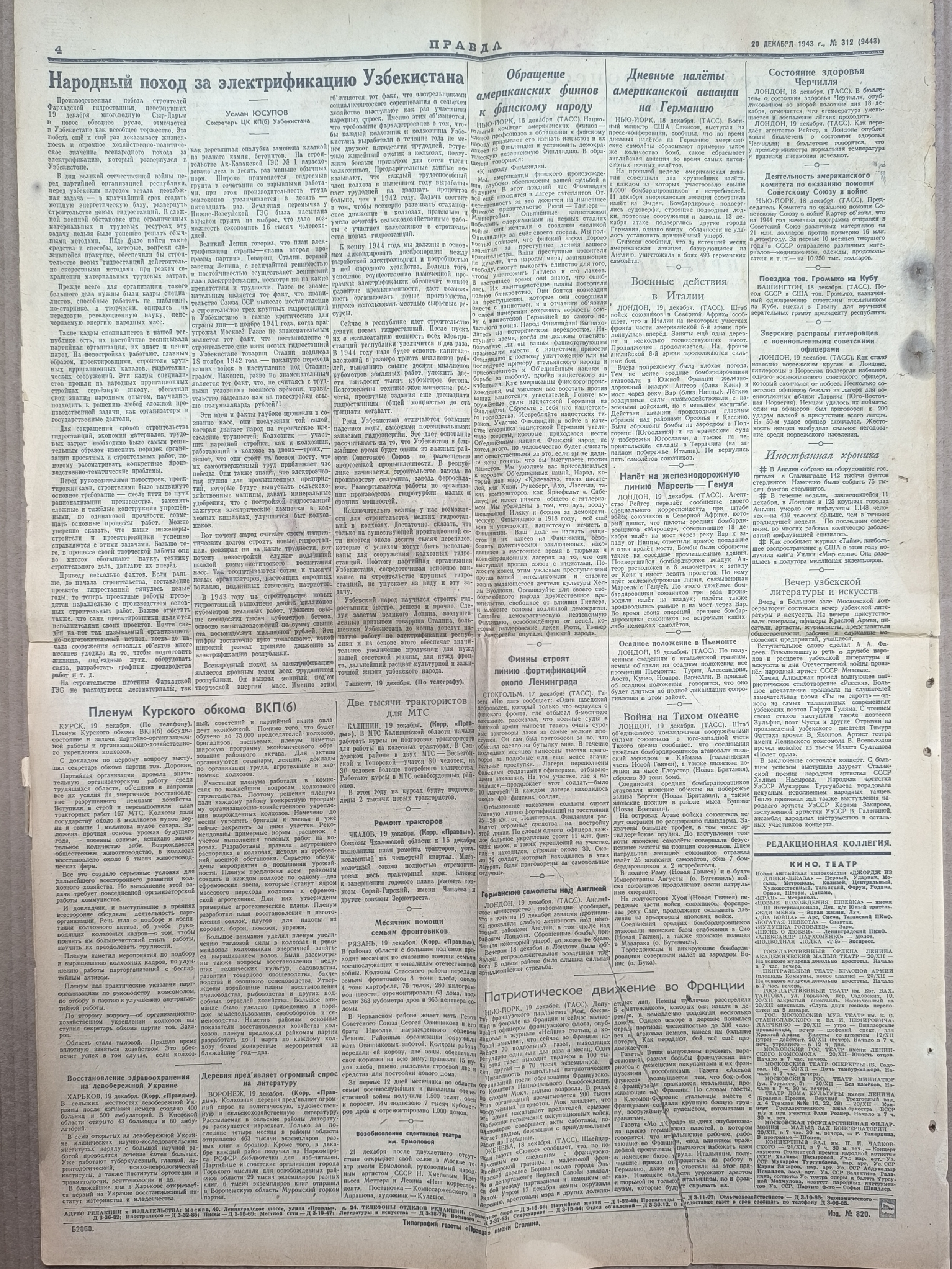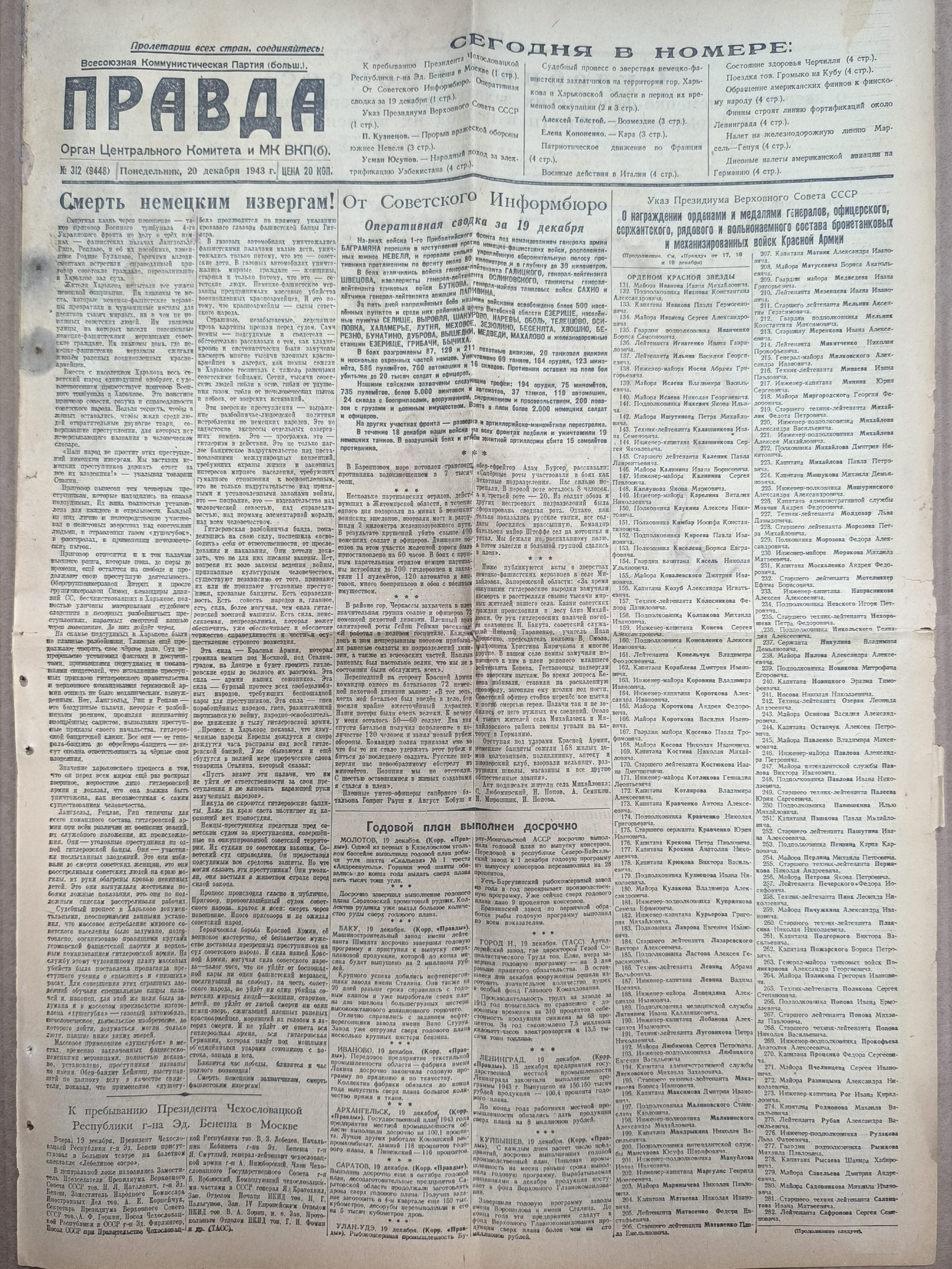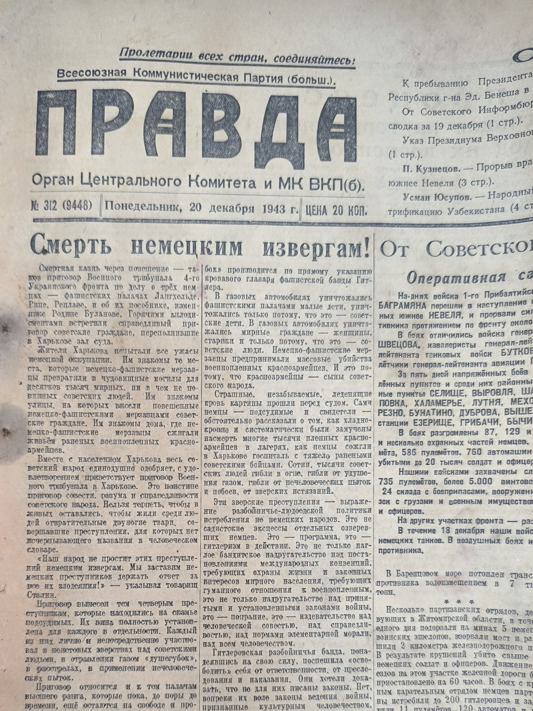 Газета военного времени "Правда". 20 декабря 1943 года.