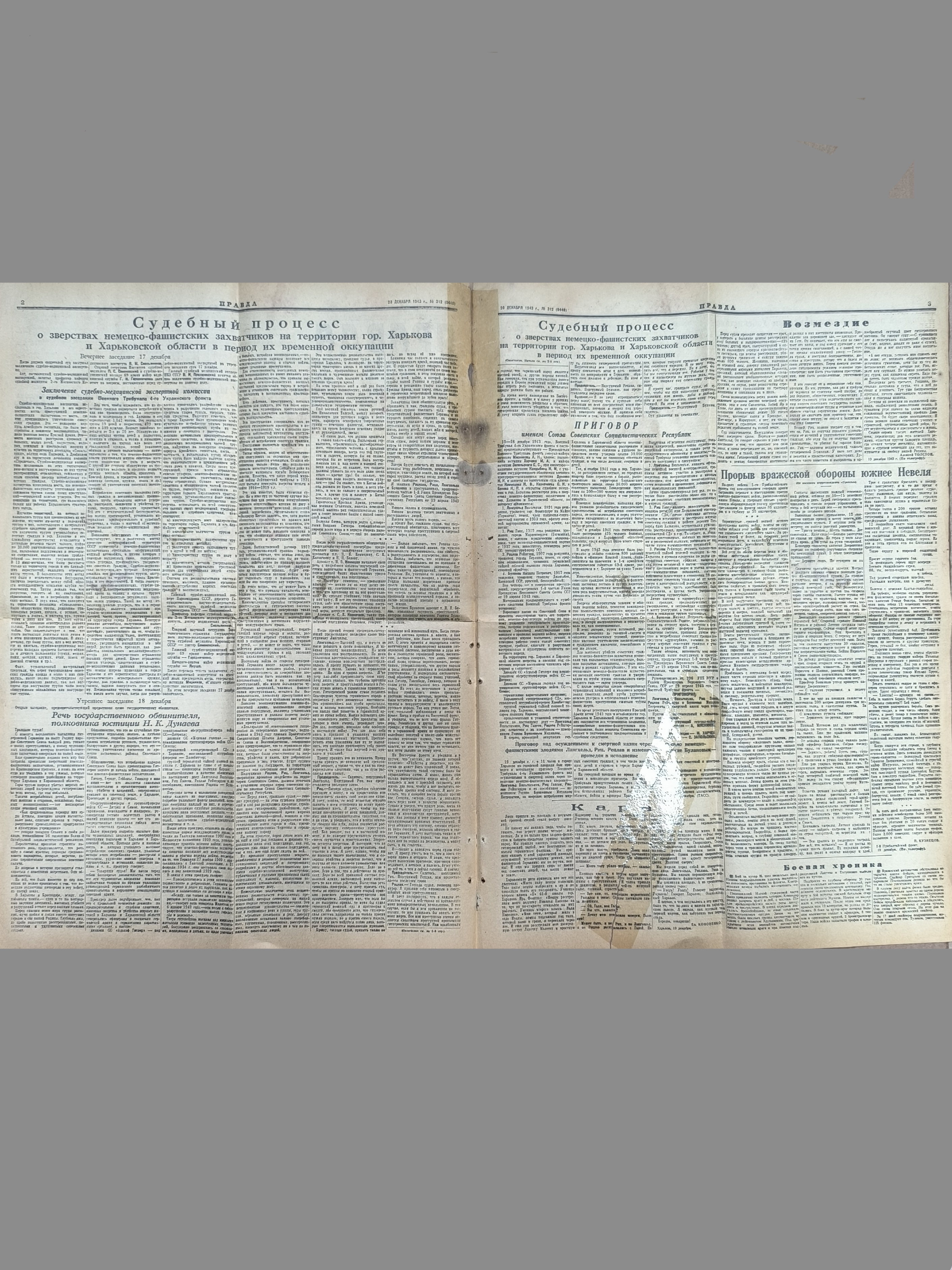 "Судебный процесс о зверствах фашистских захватчиков", "Смерть немецким извергам!", "Годовой план выполнен досрочно".