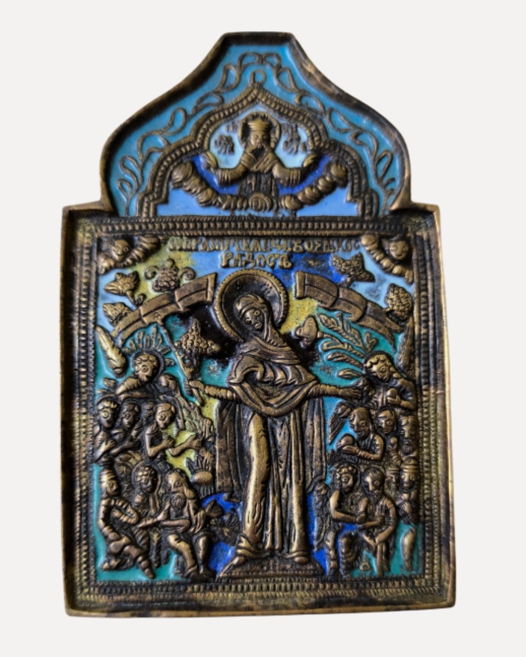 Антикварная икона "Богоматерь всех скорбящих радость". Латунная икона, изготовленная в 19 веке. Данный Образ Богоматери - один из самых распространённых в русском литье. К этому Образу обращаются в минуты страданий и скорби, как душевных, так и телесных. В центре находится Богоматерь, правой рукой благословляющая людей, также на композиции имеются ангелы. В верхней части - Образ Иисуса Христа в куполообразном навершии. Данная икона - очень частый вариант, изготовлявшийся огромными тиражами.