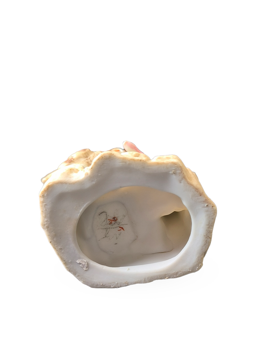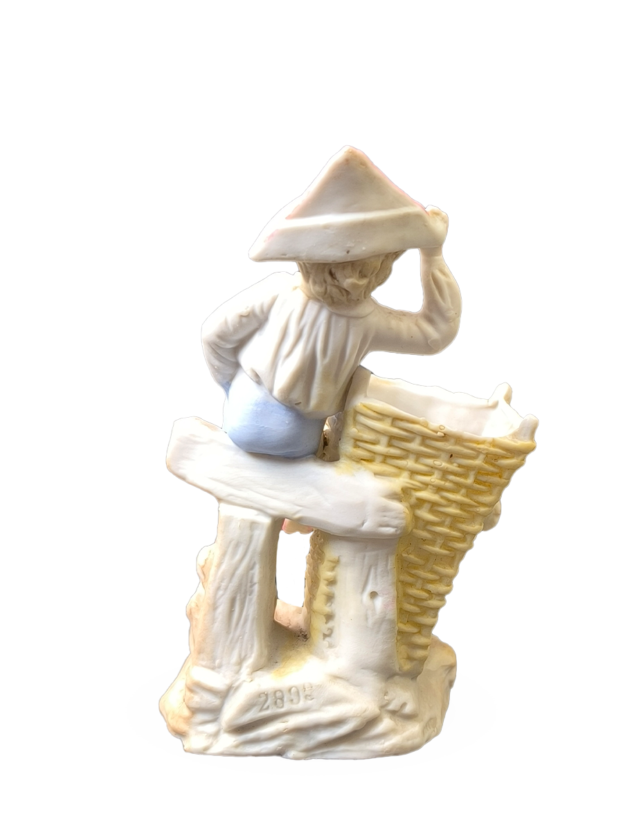 Фигурка выполнена из фарфора, с ручной росписью и, возможно, элементами бисквитного фарфора (неглазурованного матового фарфора) на корзине.