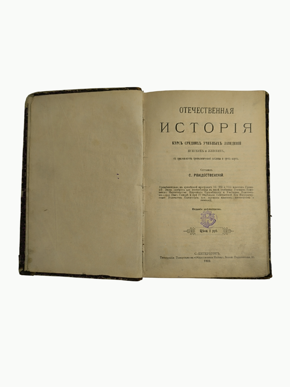 Отечественная История. Курс средних учебных заведений, мужских и женских, с приложением хронологической таблицы и трёх карт. Составил Сергей Егорович Рождественский (1834–1891), педагог, историк, учитель средней школы, гимназии, директор народных училищ Санкт-Петербургской губернии, автор учебников истории. Издание применительно к примерной программе VI, VII, и VIII классов Гимназий. Вновь одобрена для употребления в виде учебника: Учёным Комитетом Министерства Народного Просвещения и Учебными Комитетами - при Свят. Синоде и при IV Отделении Собственной Его Императорского Величества Канцелярии, для высших классов институтов и гимназий. Издание двенадцатое.