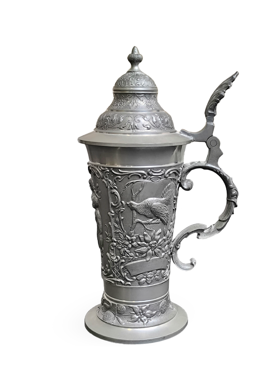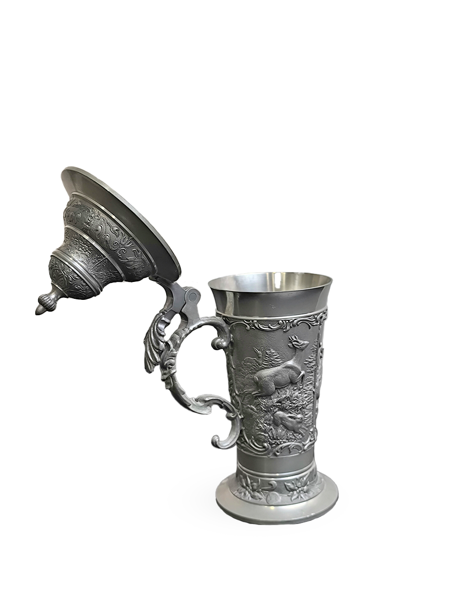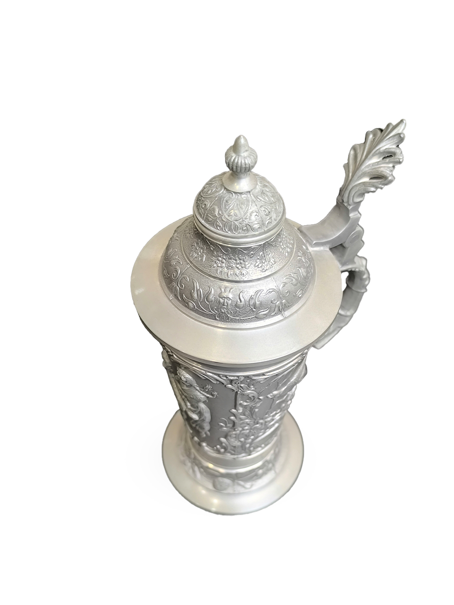 Оригинальная, винтажная - оловянная пивная кружка. По всей окружности украшена рельефными сюжетами.