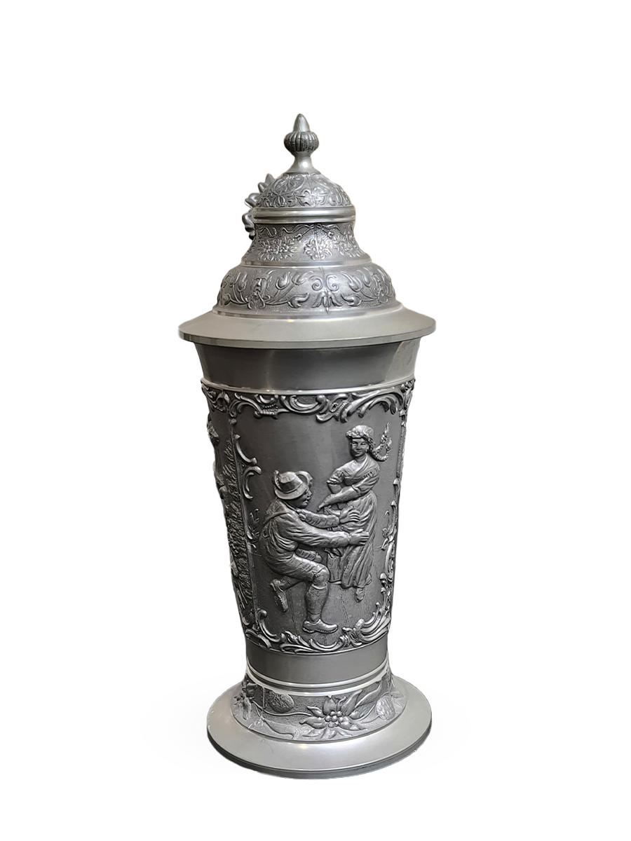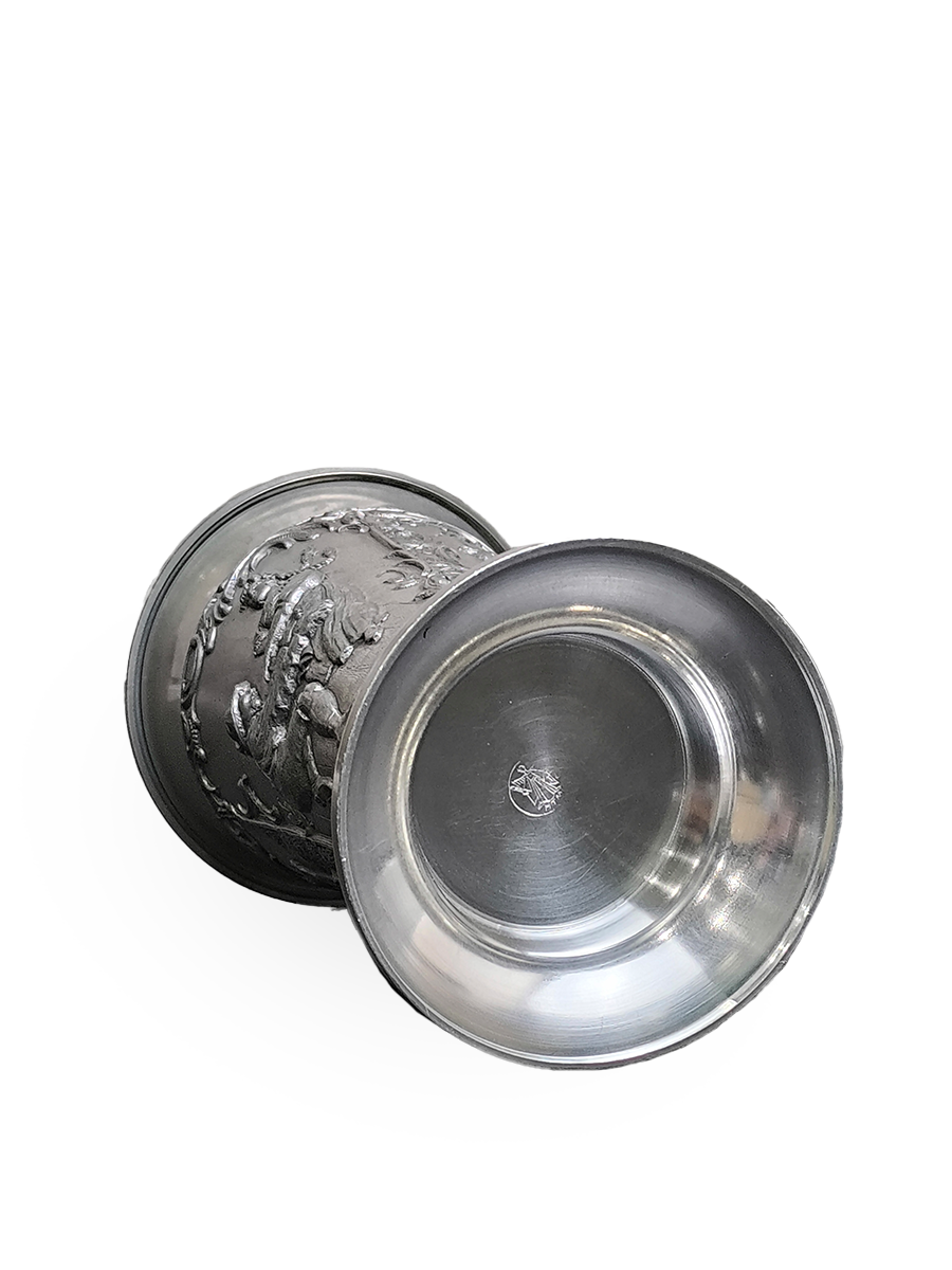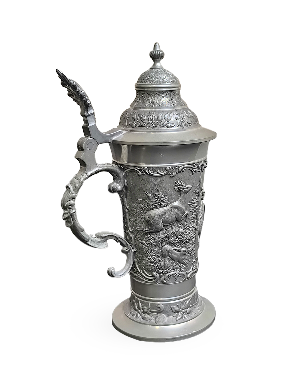 Оригинальная, винтажная - оловянная пивная кружка. По всей окружности украшена рельефными сюжетами.
