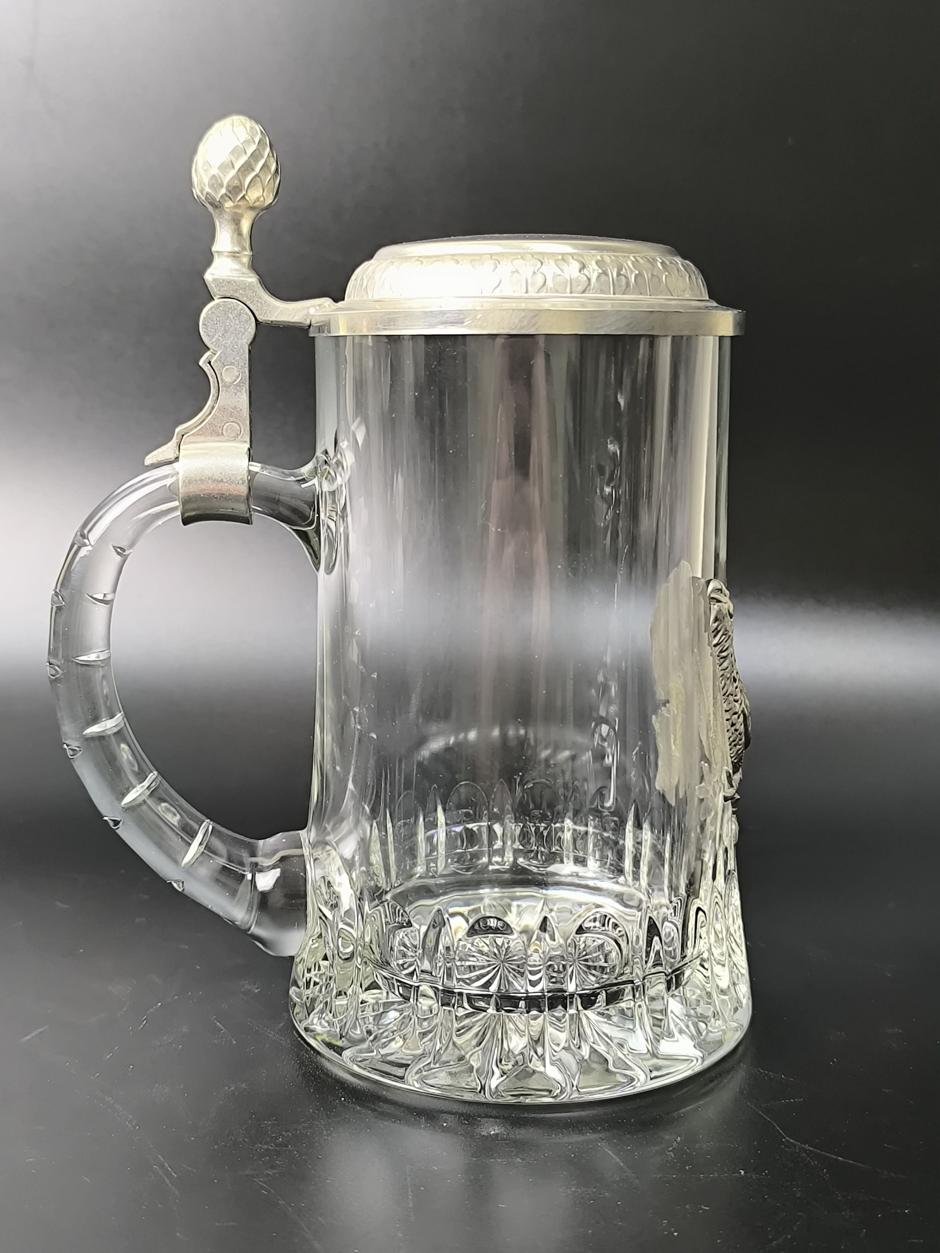 Классическая немецкая пивная кружка из стекла с оловянной крышкой, с рельефным рисунком из олова.