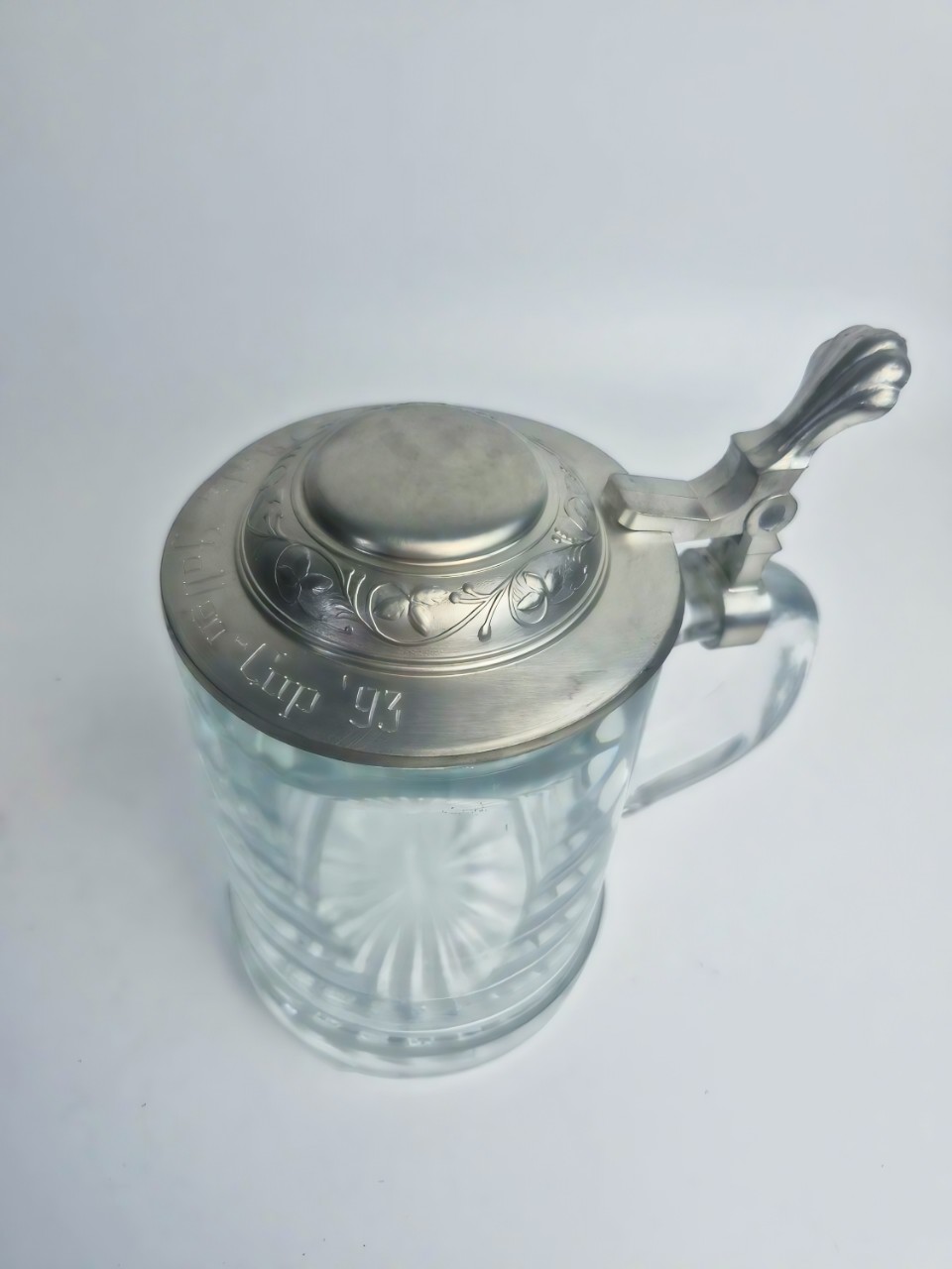 Кружка из прозрачного стекла классической цилиндрической формы с декоративной гравировкой с массивной ручкой, а крышка — из пищевого олова (пьютера).