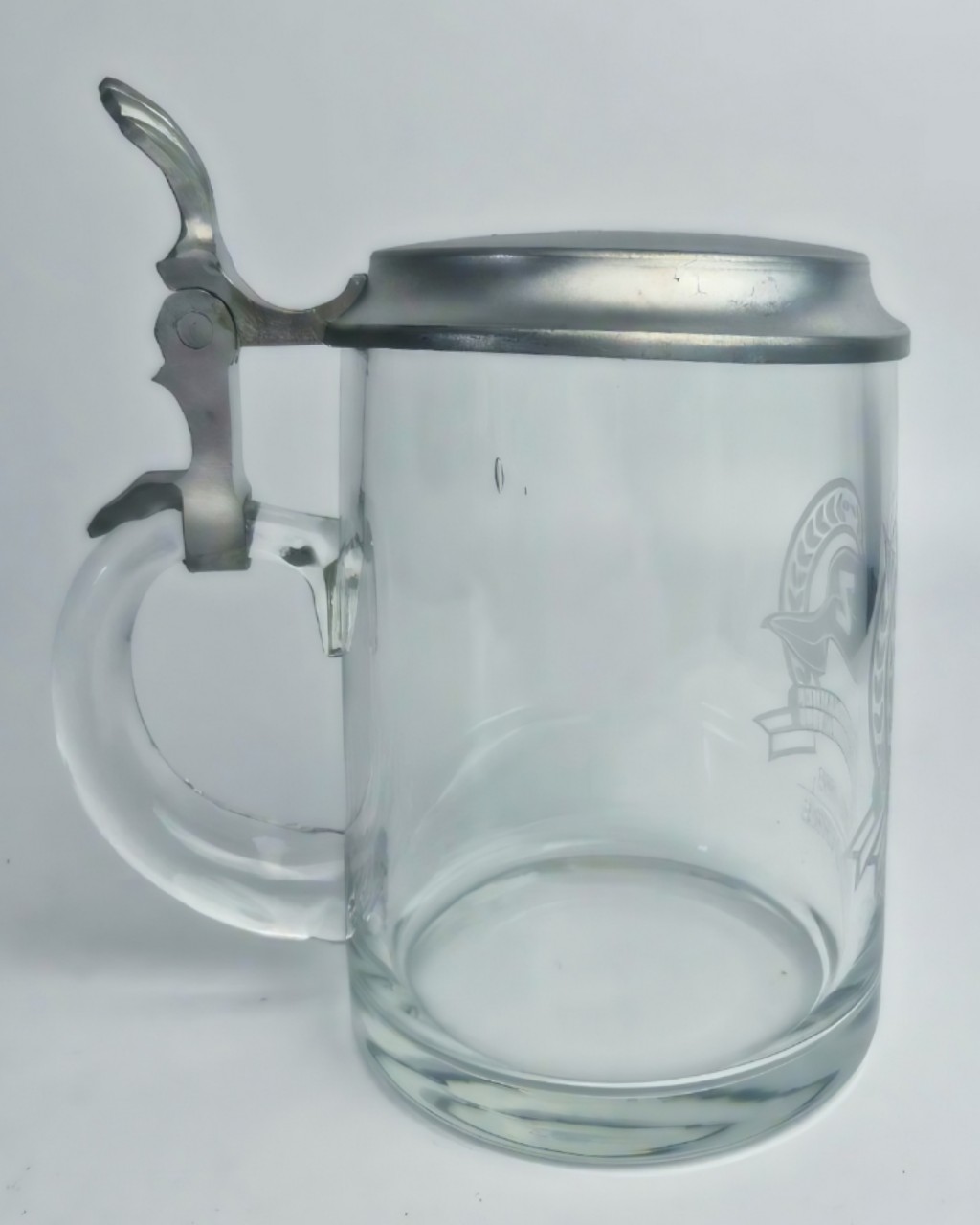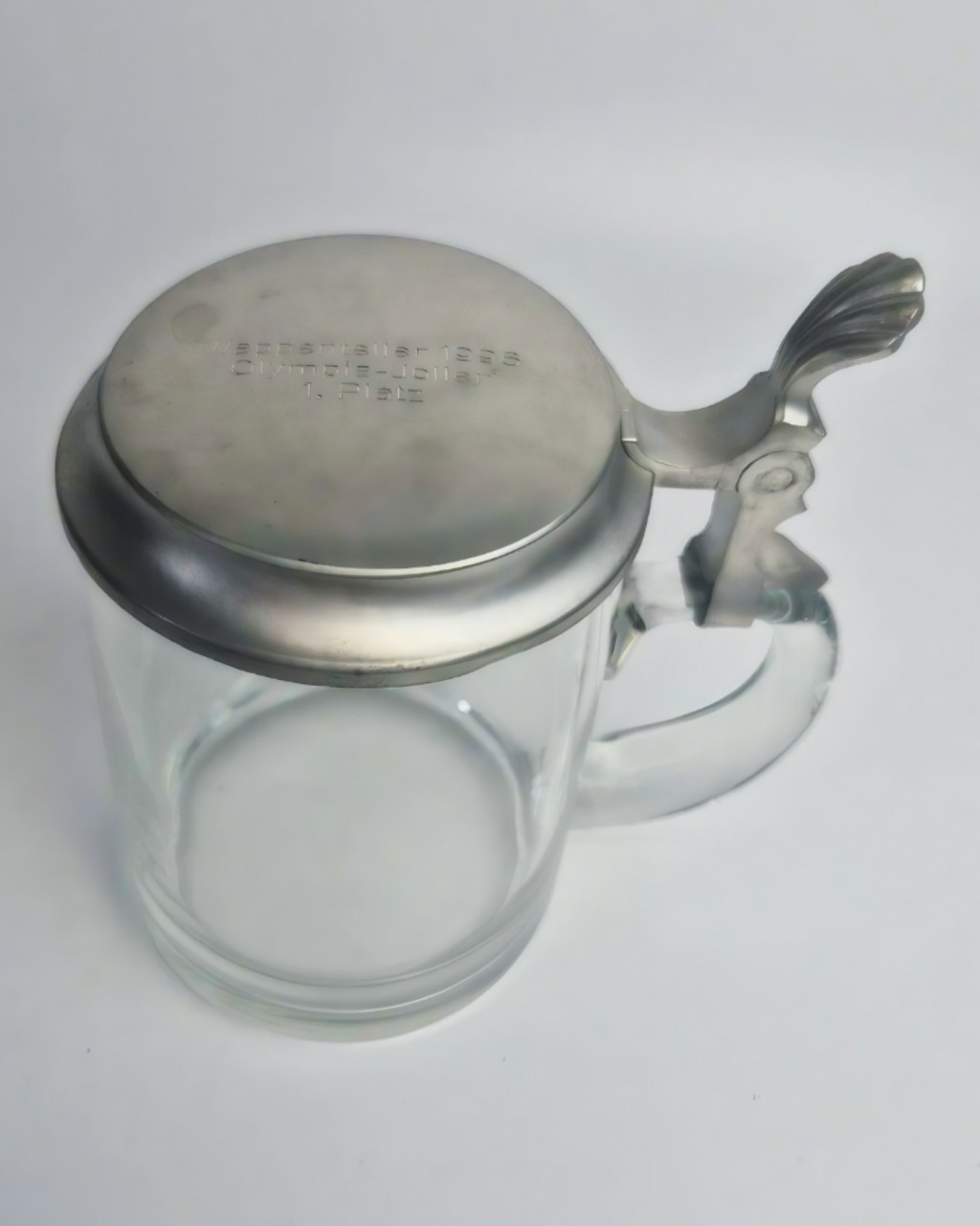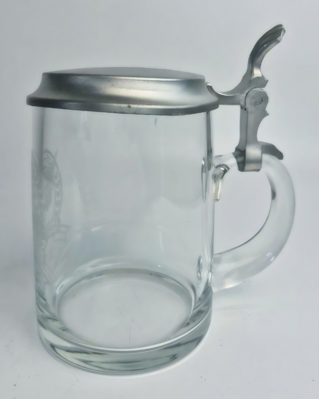 Кружка из прозрачного стекла классической цилиндрической формы с декоративной гравировкой с массивной ручкой, а крышка — из пищевого олова (пьютера).
