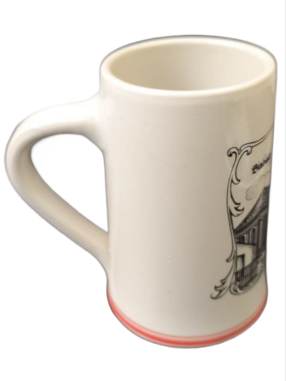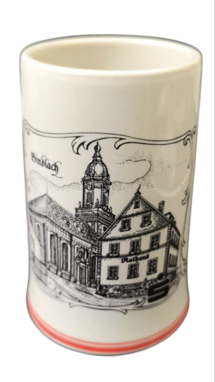 Необычная фаянсовая пивная кружка, на котором изображены церковь и ратуша города Биндлах (Германия). Кружка с достопримечательностями.