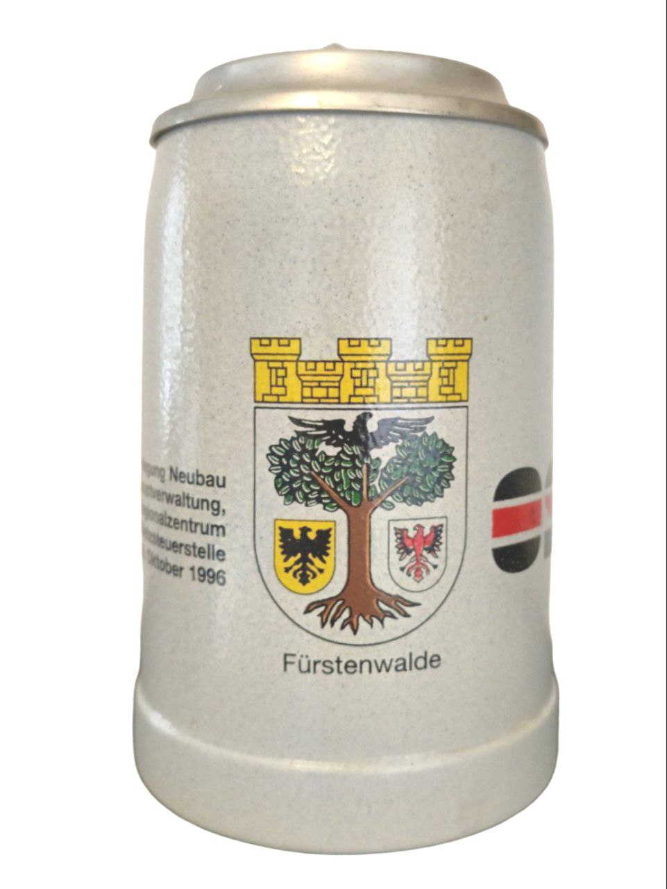 Кружка изготовлена из фарфора, украшена декором и оловянной крышкой. На кружке изображен официальный герб города Фюрстенвальде-на-Шпрее (земля Бранденбург, Германия), на котором представлены крепостные башни, дерево, черный орел и красный орел (гербы Бранденбурга и Священной Римской империи соответственно).