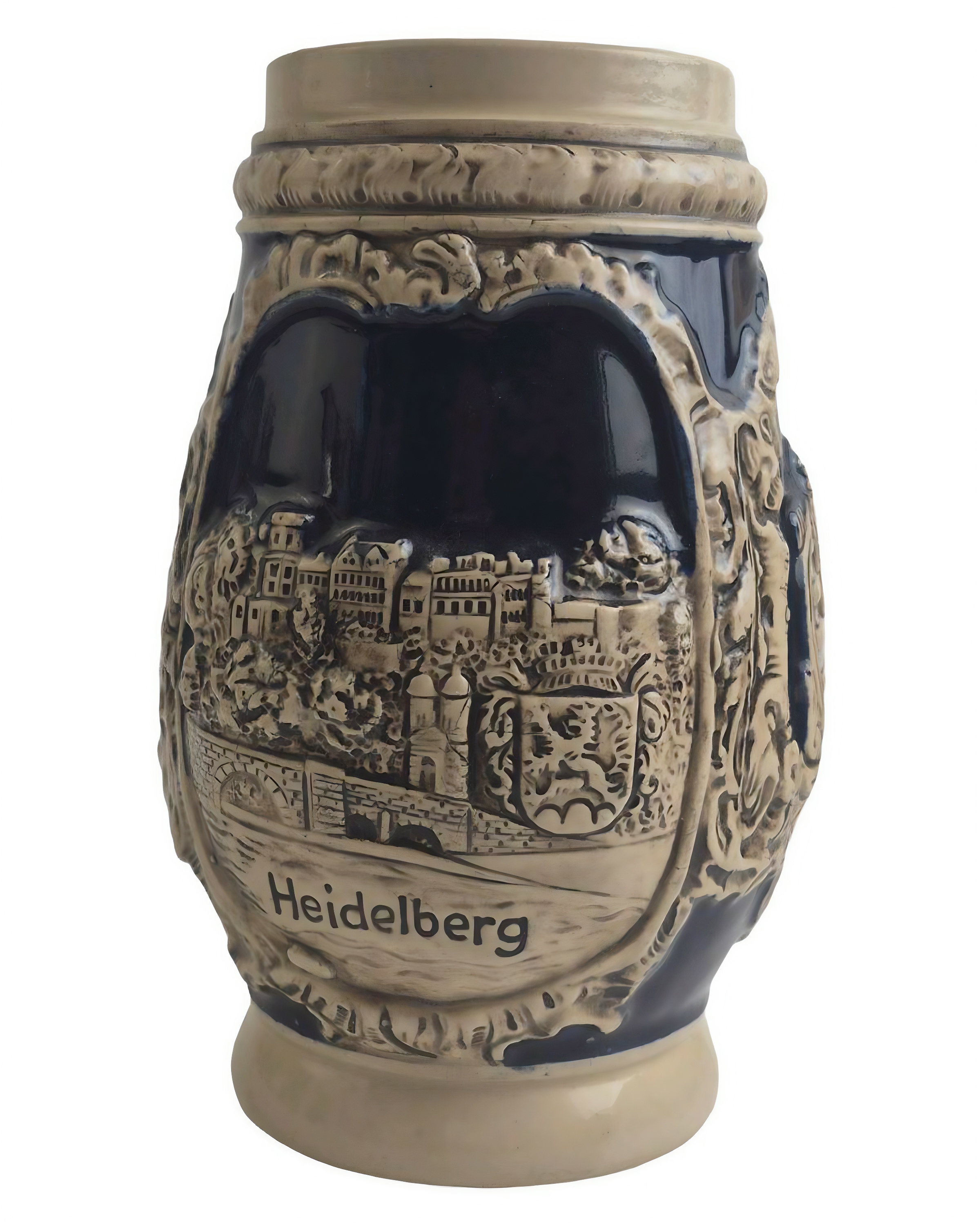 Так же на кружке выполнен детальный рельеф с видом города, включая Хайдельбергский замок и Старый мост. Изделие выполнено в классической сине-бежевой гамме (кобальтовое покрытие).