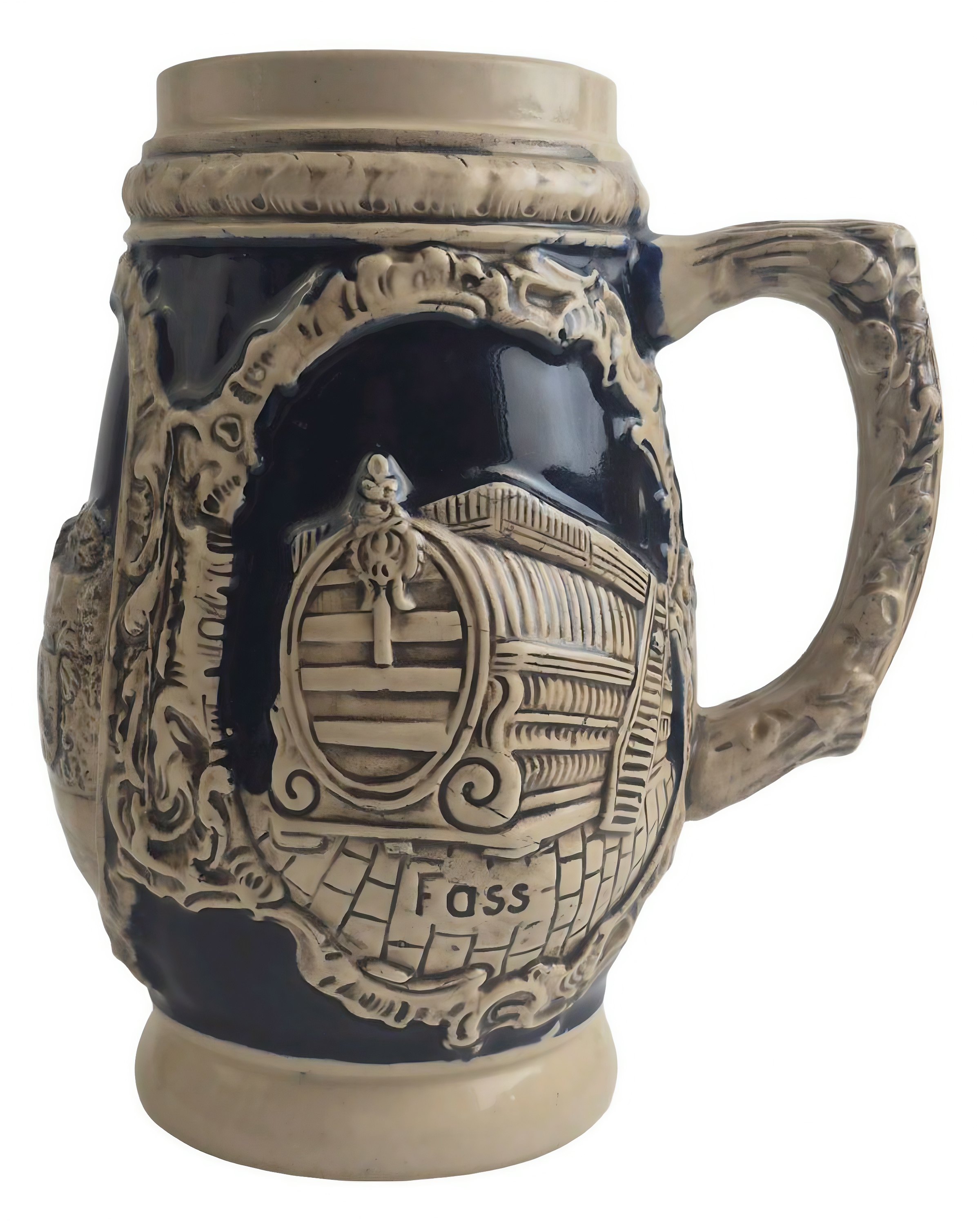 На кружке изображена бочка («Fass» в переводе с немецкого означает «бочка») и жанровые сцены.