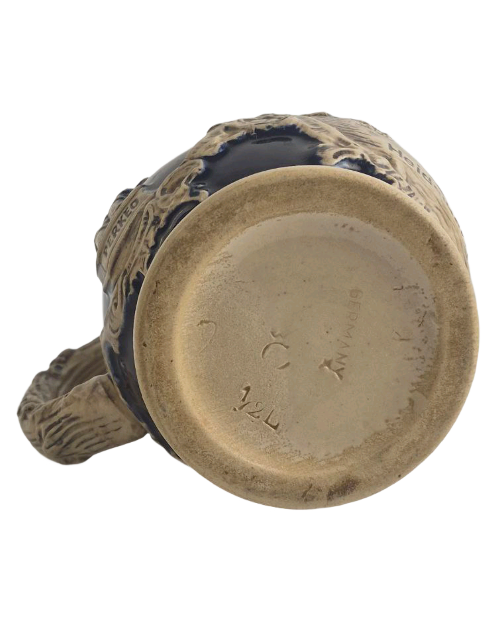 На изображении представлена винтажная немецкая пивная кружка (штайн) из керамики с характерным синим кобальтовым покрытием и рельефным декором.