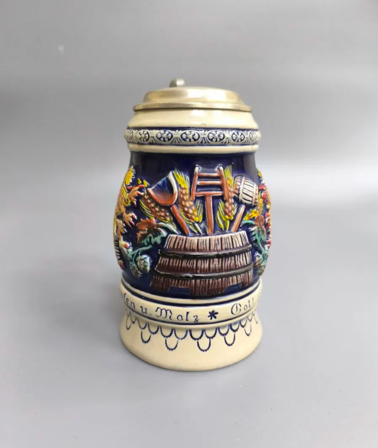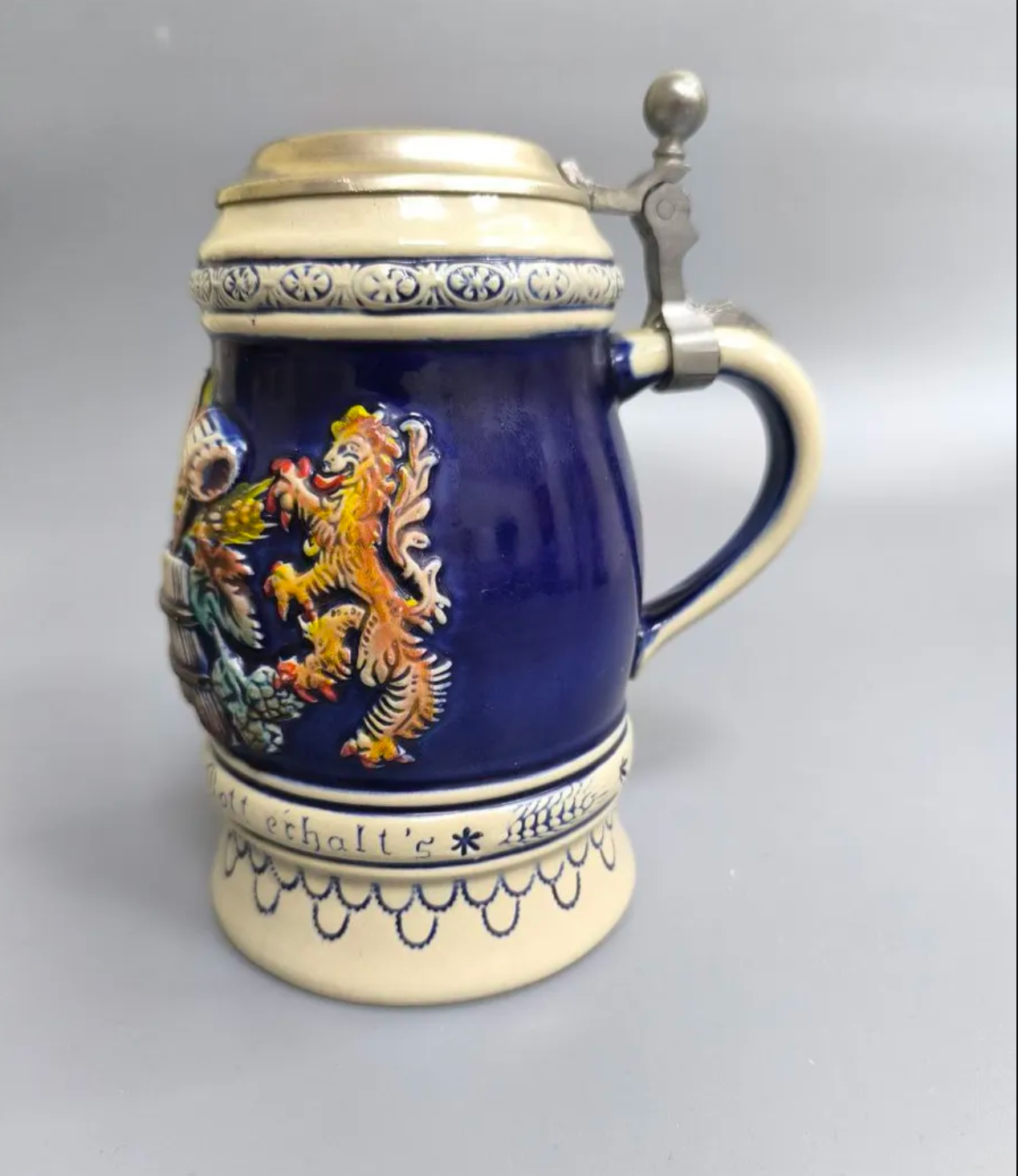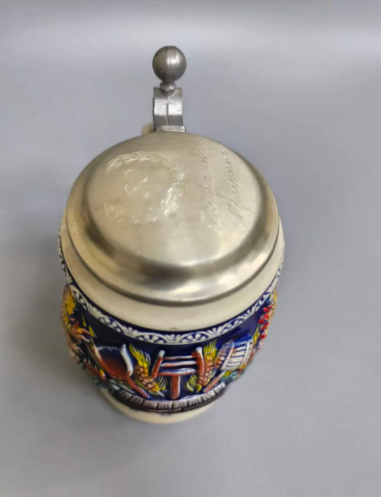 Классическая немецкая пивная кружка из керамики с рельефом и крышкой