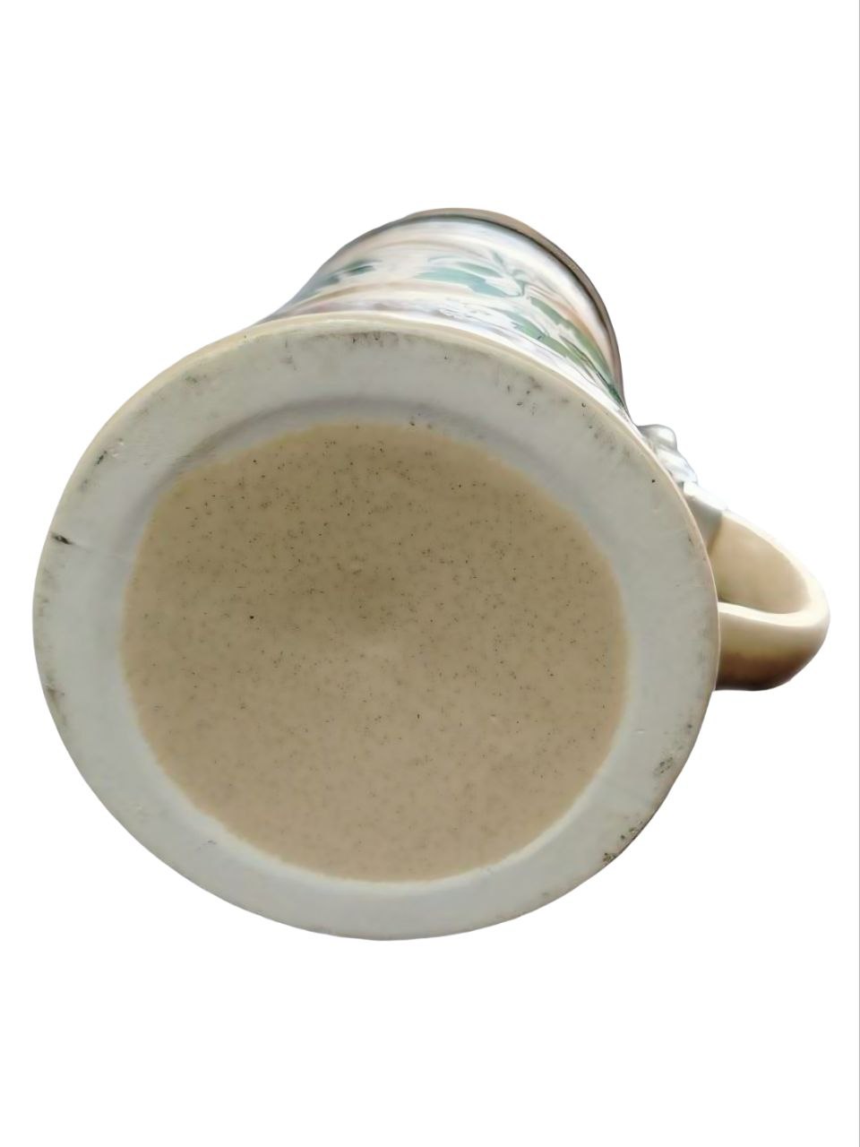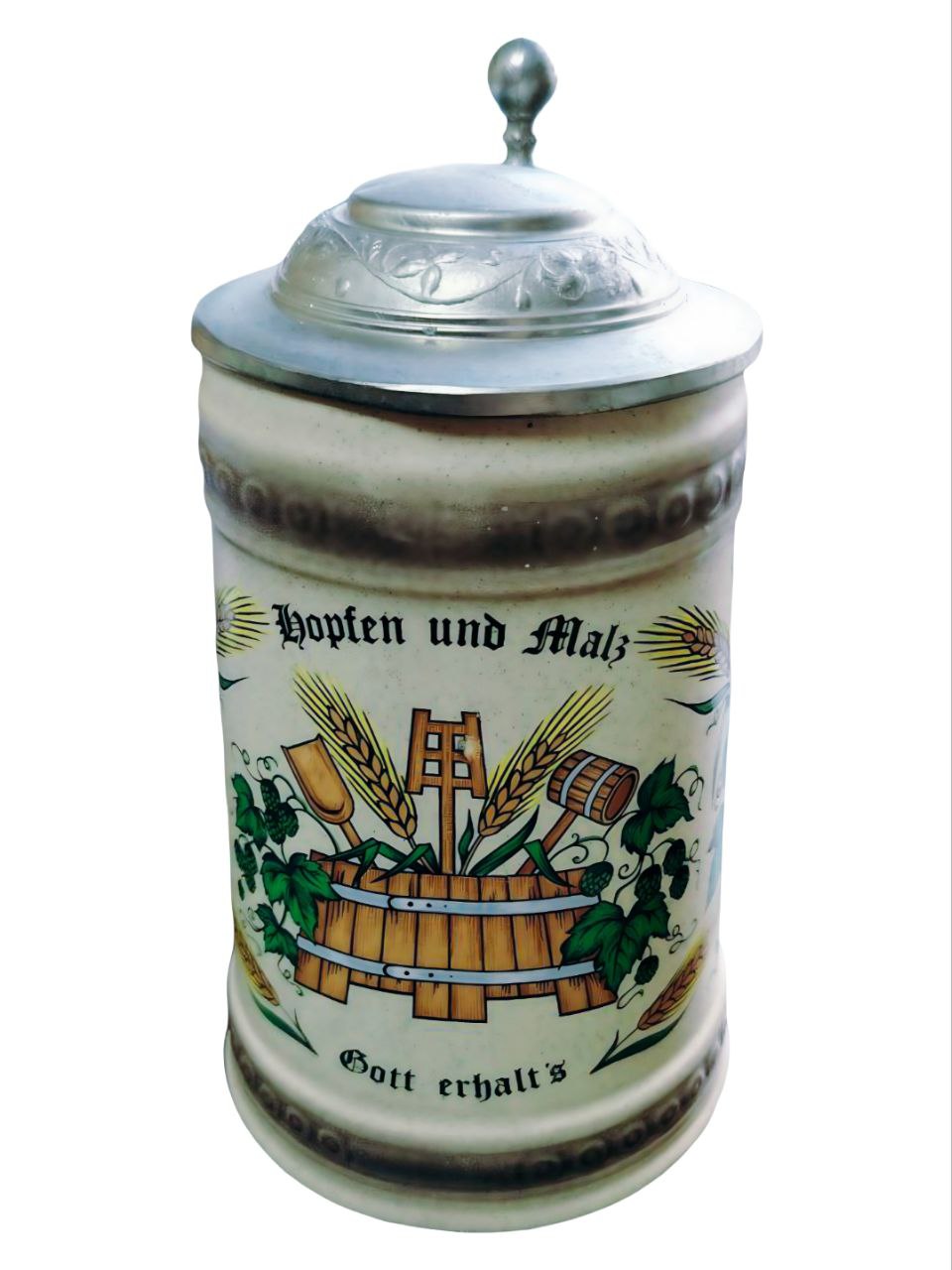 Кружка изготовлена из фарфора, украшена декором и оловянной крышкой. На кружке в центре композиции находится пивная бочка, окруженная колосьями ячменя и ветвями хмеля. Также на рисунке видны инструменты пивовара, такие как лопата для солода и весло для перемешивания сусла.