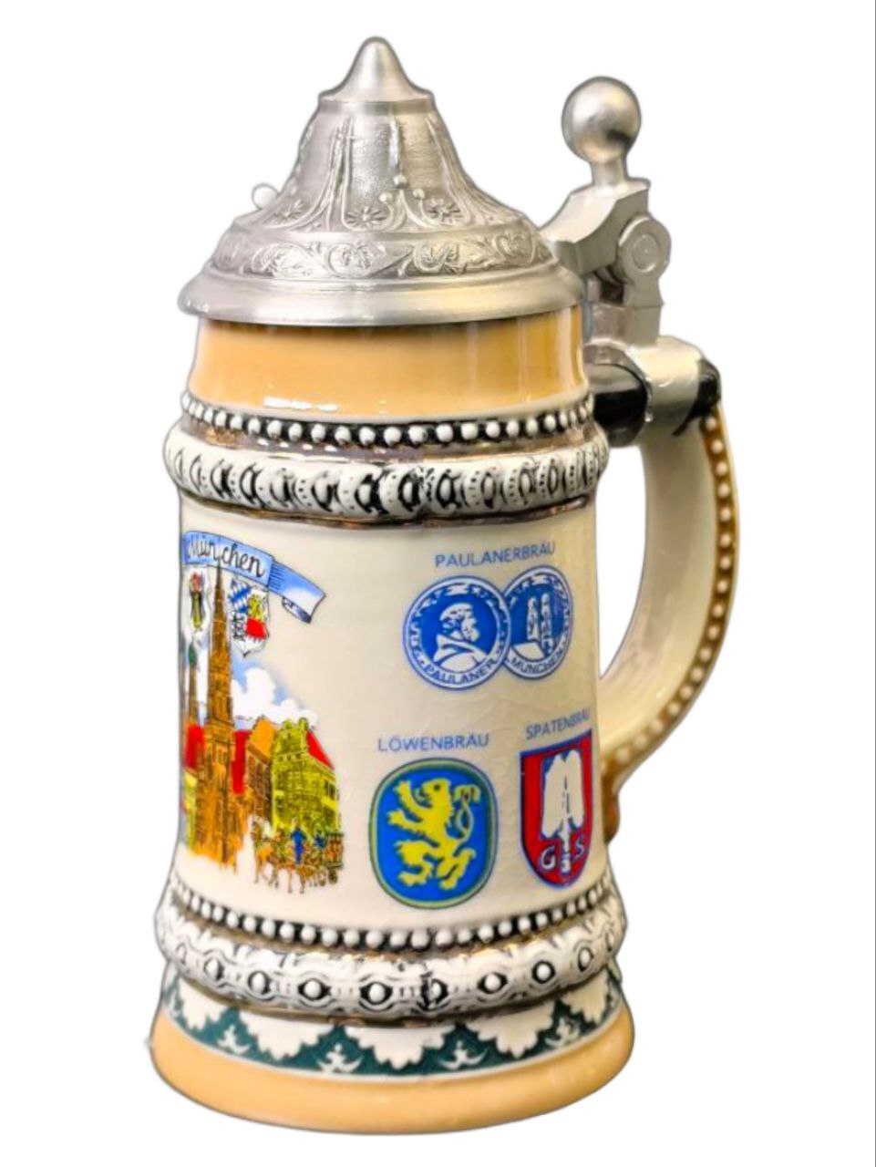 Кружка изготовлена из фарфора, украшена декором и оловянной крышкой. Кружка украшена рельефными и раскрашенными изображениями достопримечательностей Мюнхена, включая собор Фрауэнкирхе (Frauenkirche). На ней также видны гербы известных мюнхенских пивоварен, таких как Hofbräuhaus (символ HB) и Löwenbräu (символ льва). Надпись "München" (Мюнхен) выполнена на синей ленте.